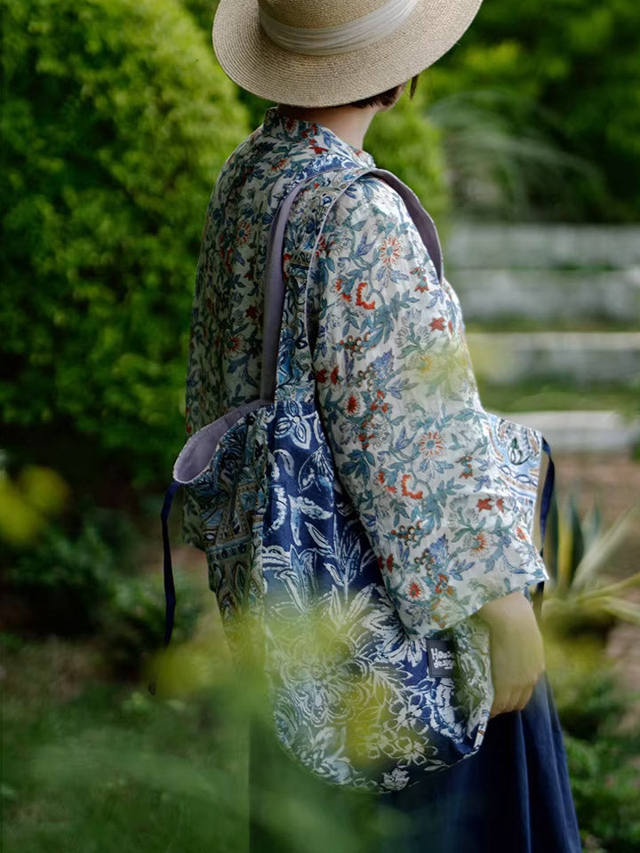 Retro Blue Floral Spliced Shoulder Bag