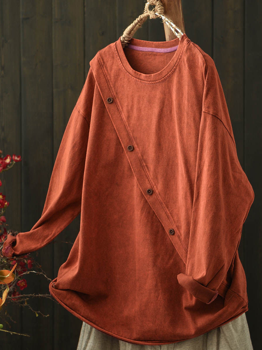 Women Artsy Autumn Slanted Button O-Neck Cotton Blouse