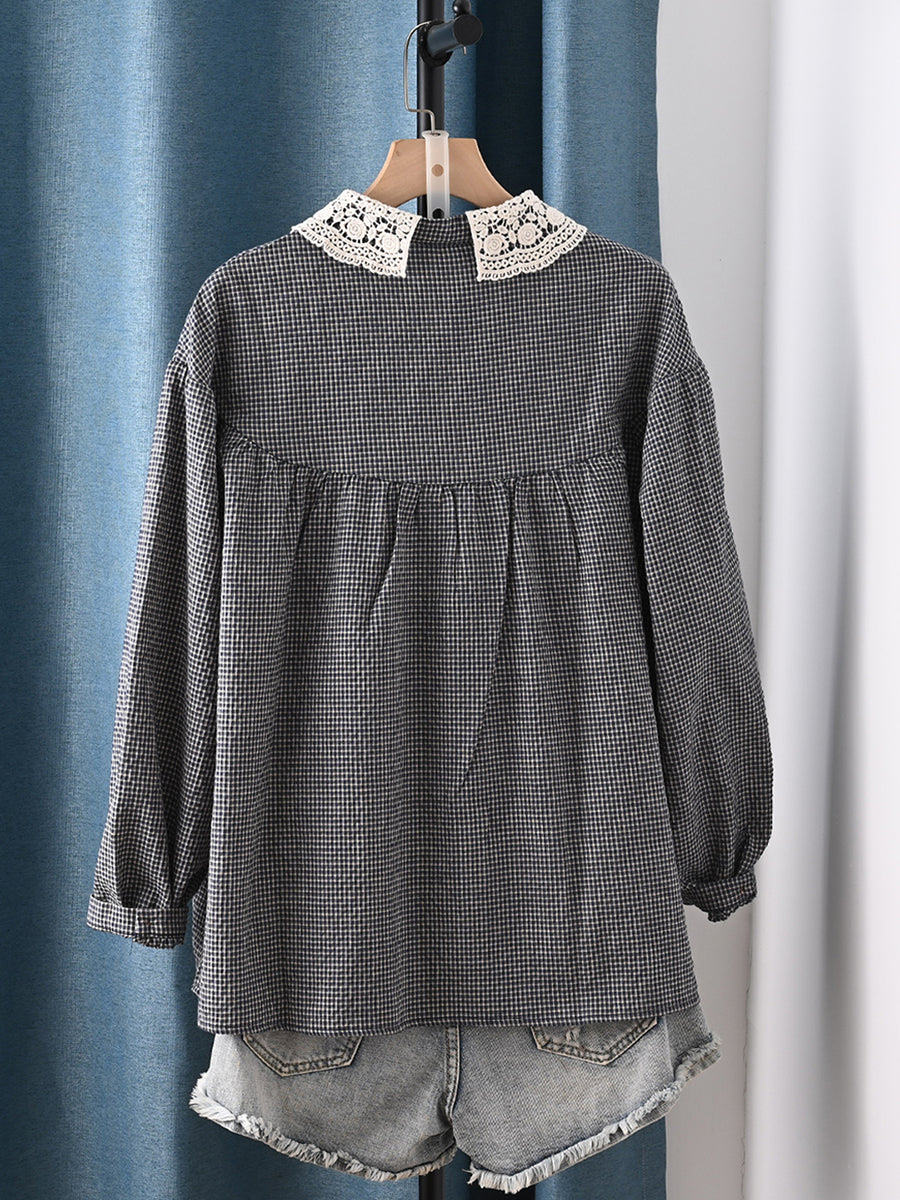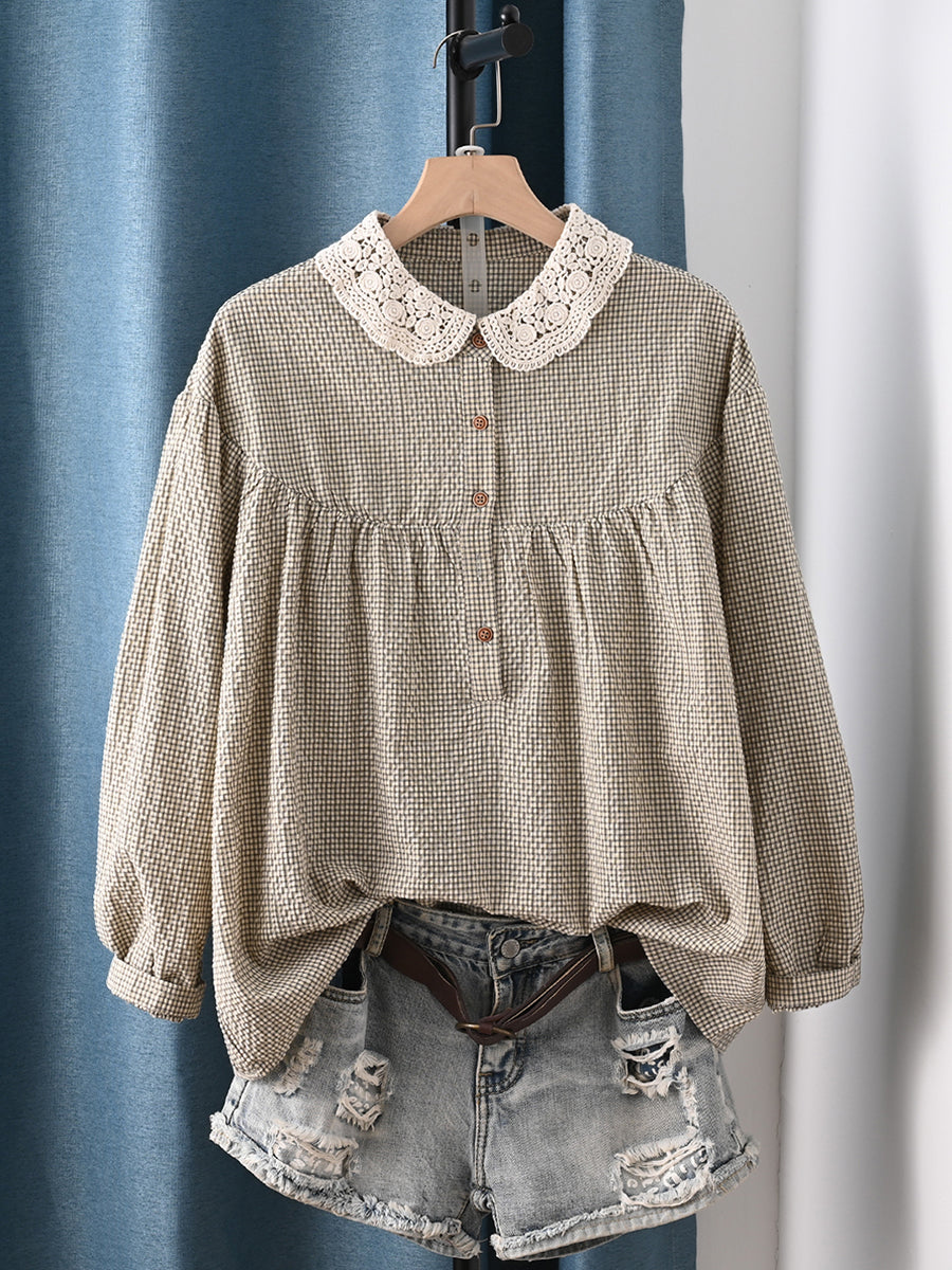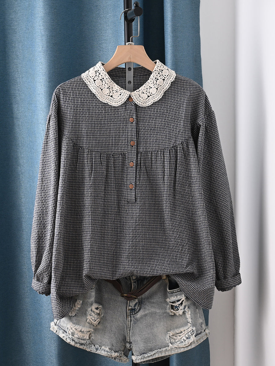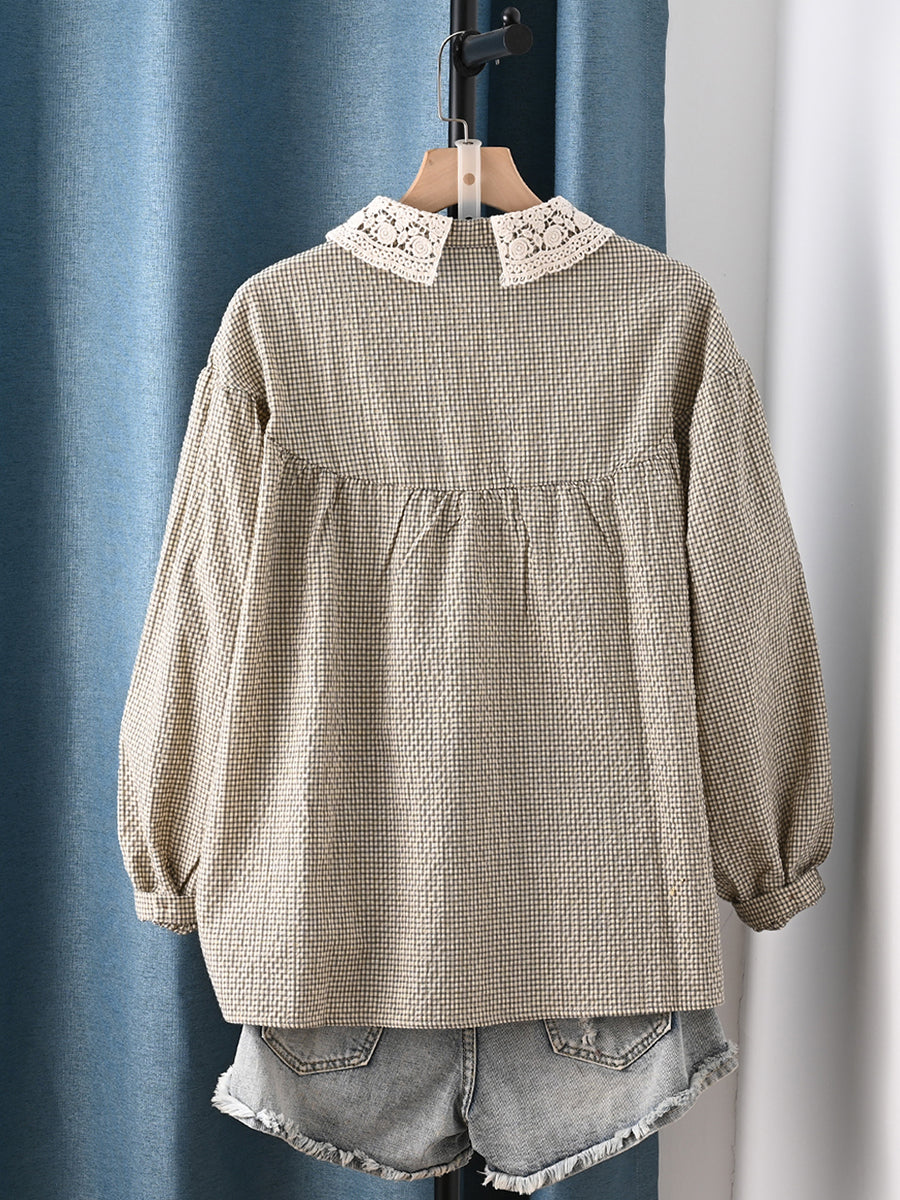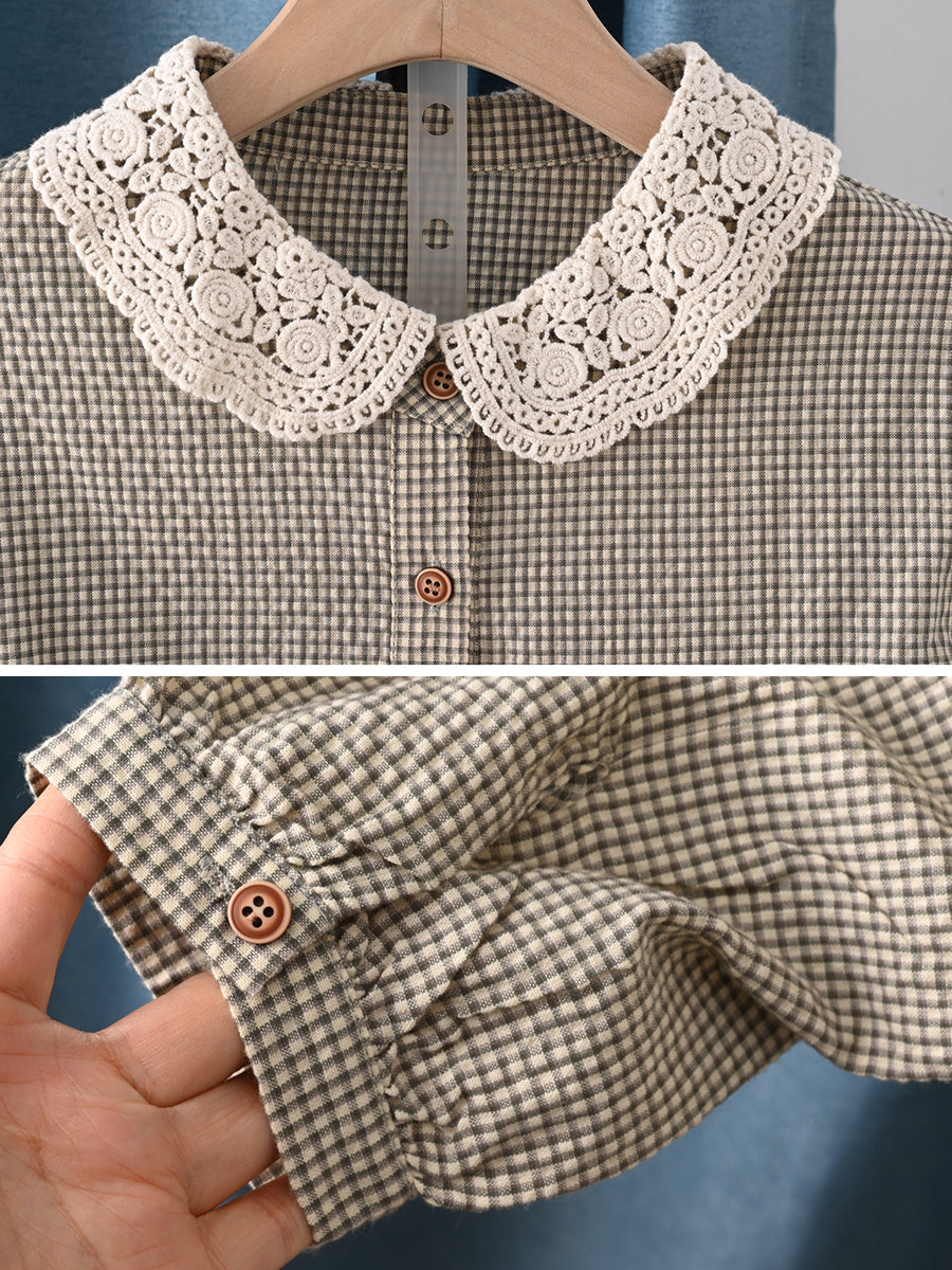 Women Artsy Plaid 100%Cotton Lace Collar Shirt
