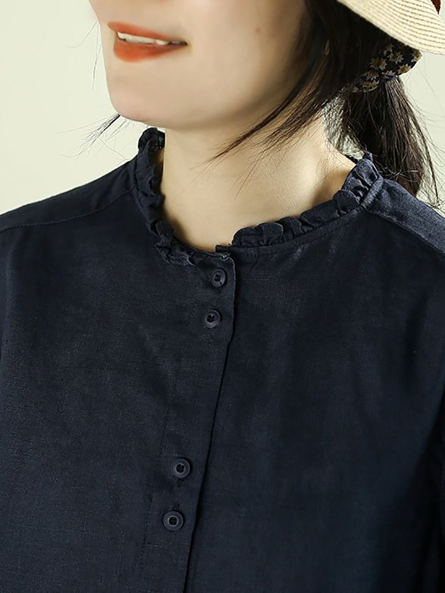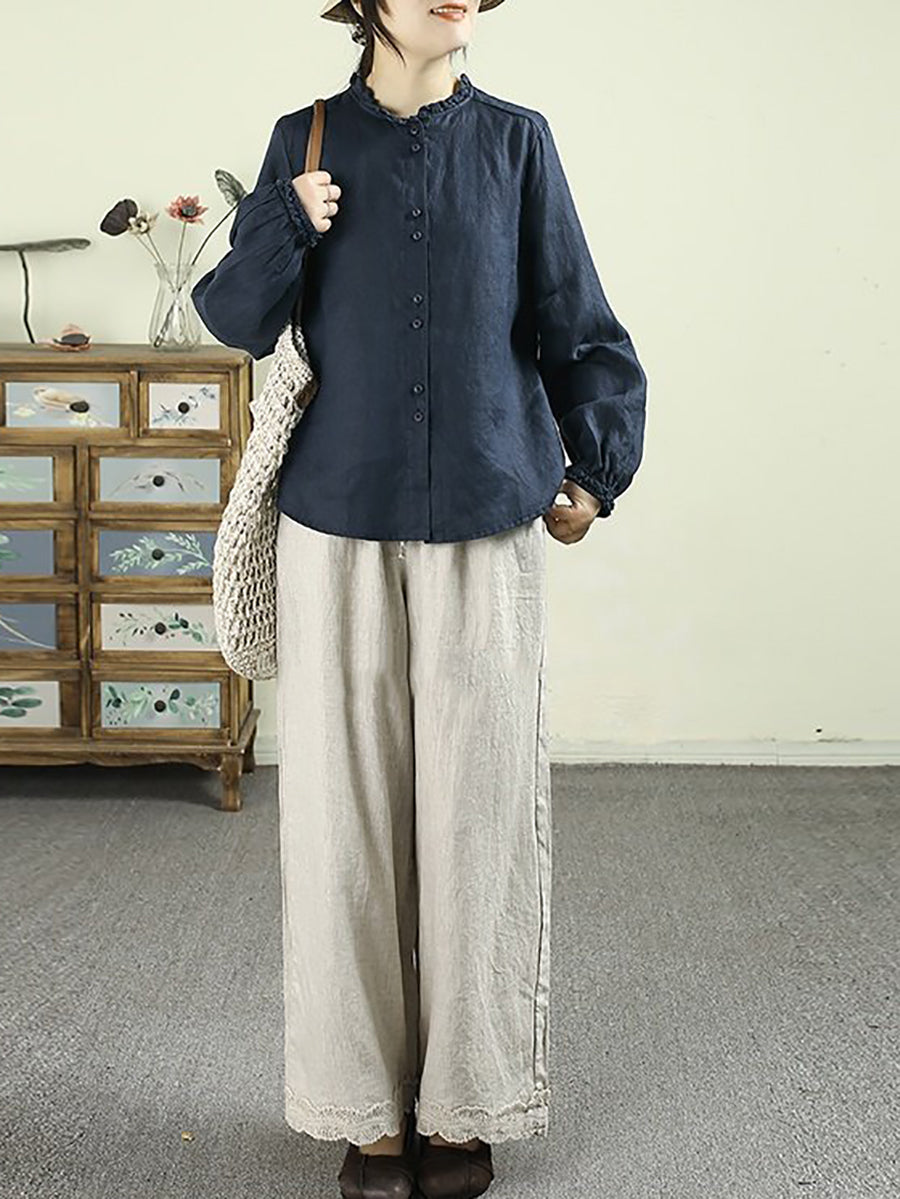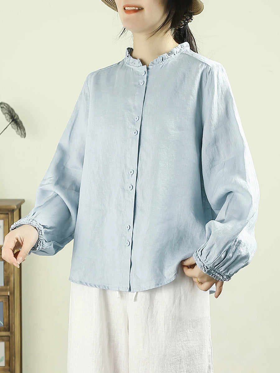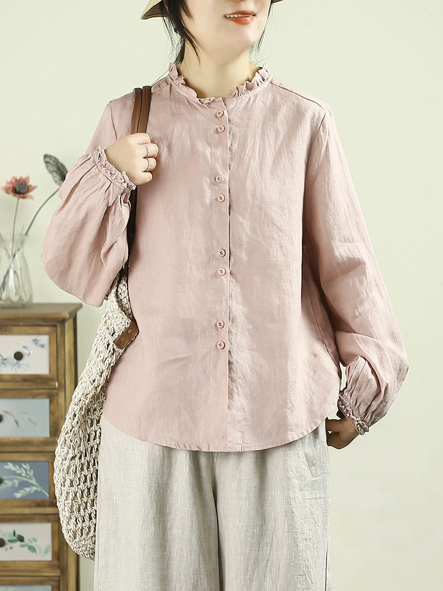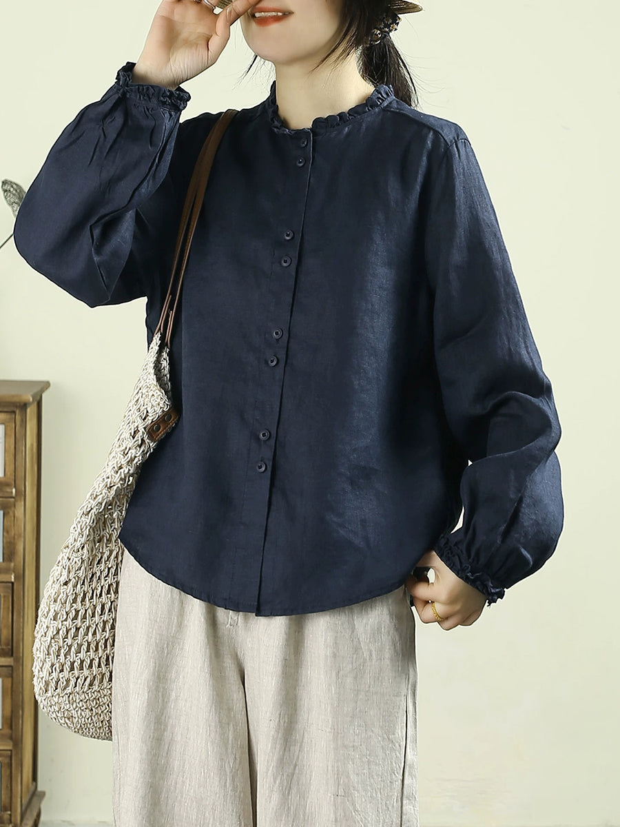 Women Artsy Spring Pure Color Stand Collar 100%Linen Shirt