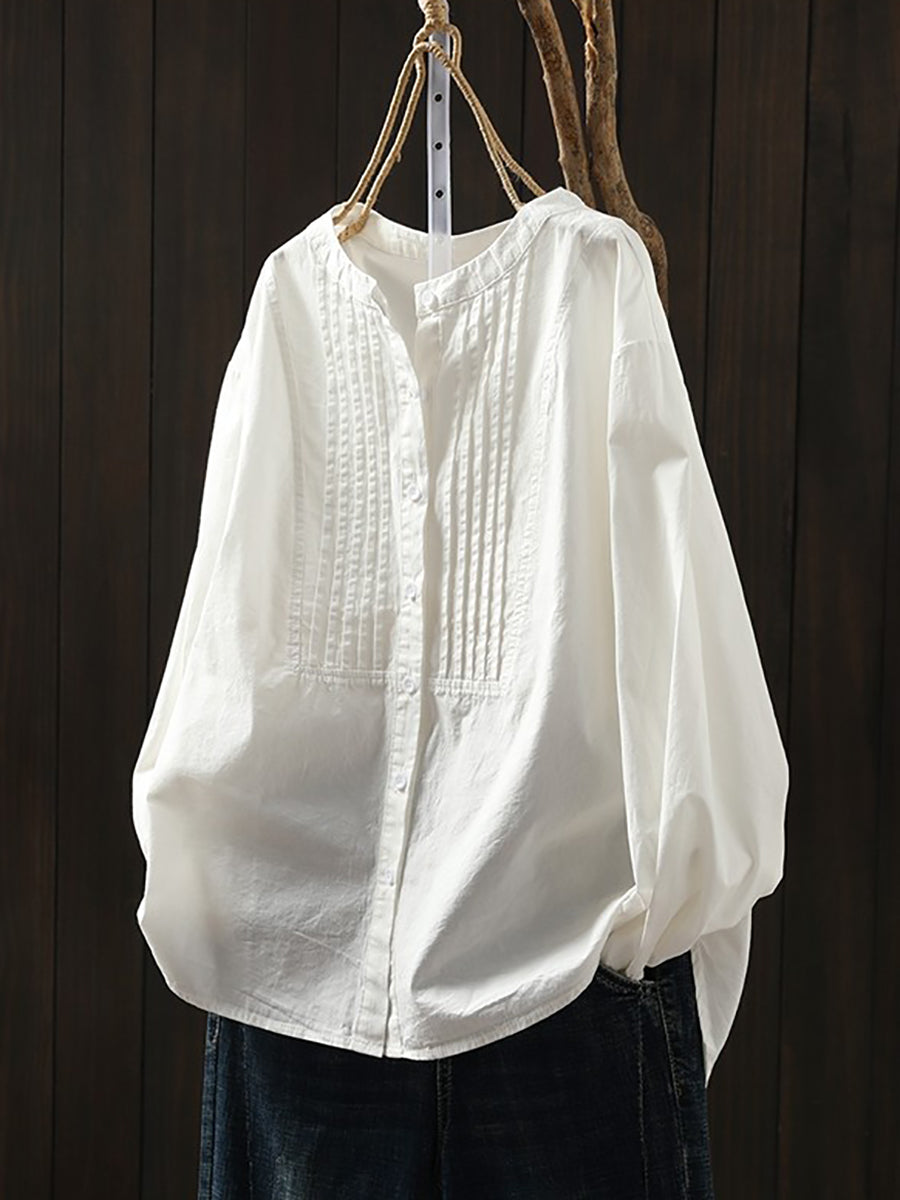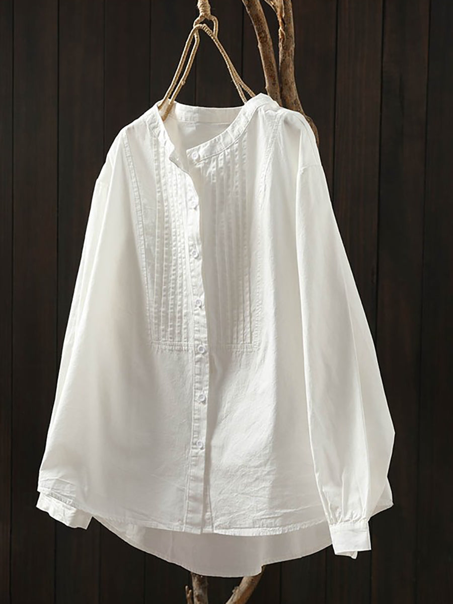 Women Artsy Spring Shirred Stand Collar 100%Cotton Shirt