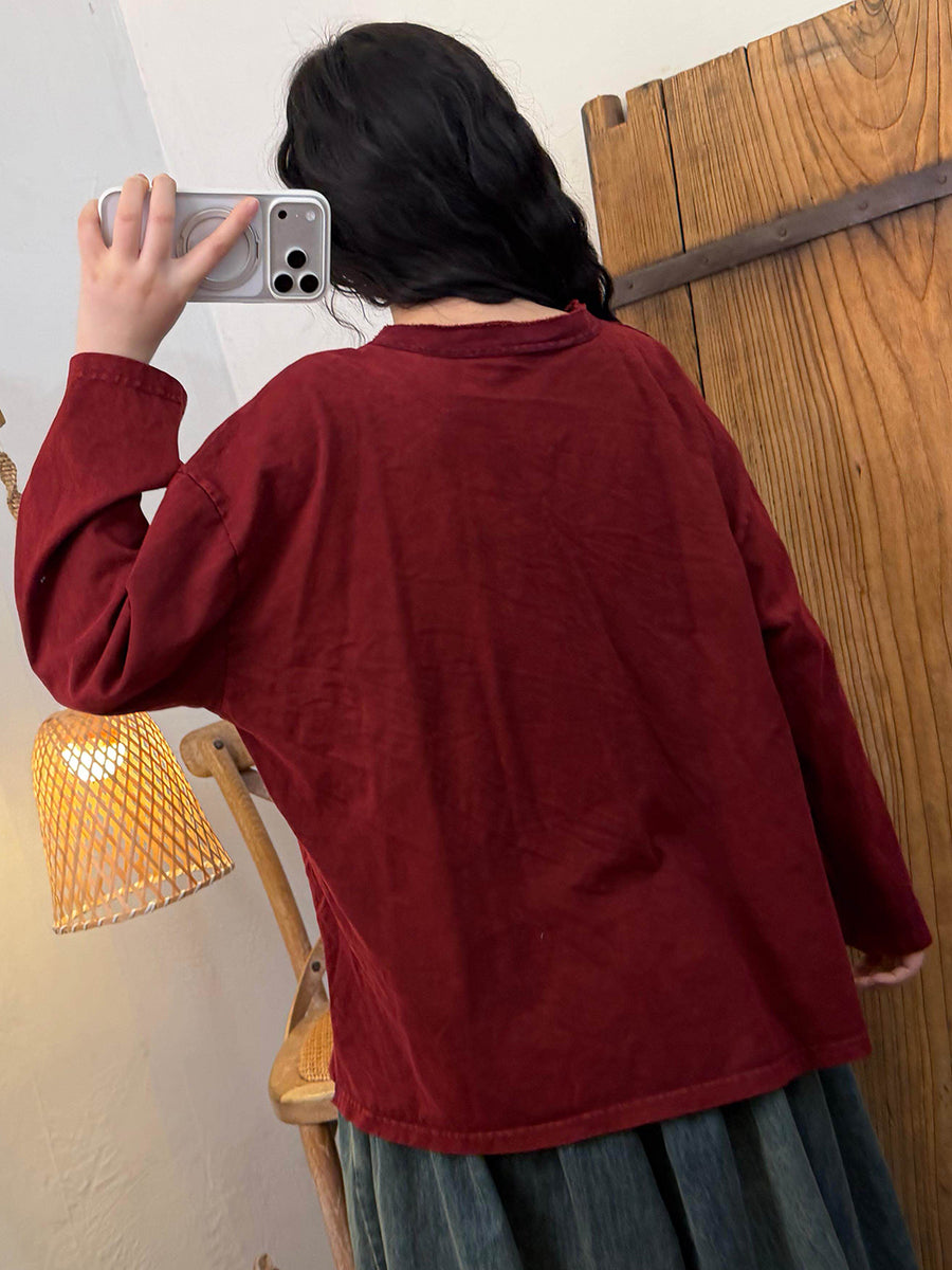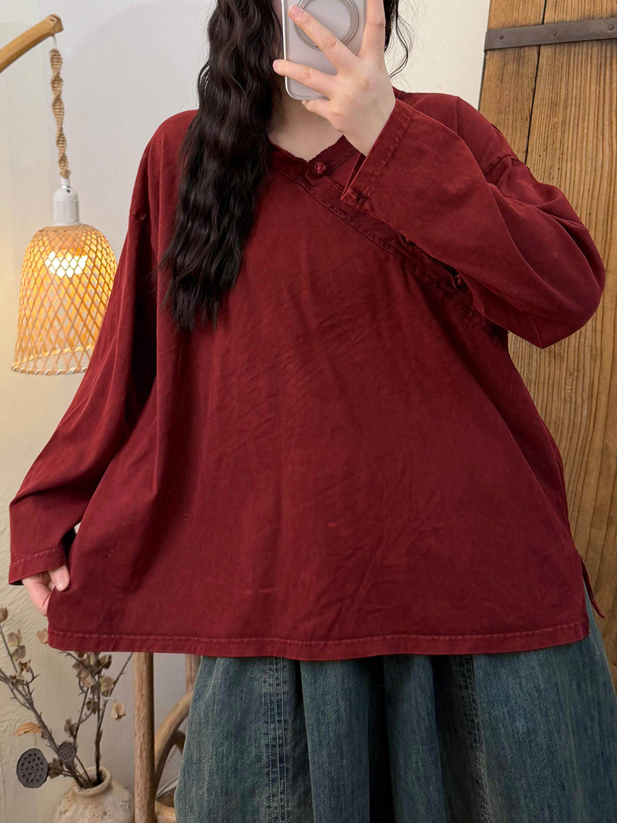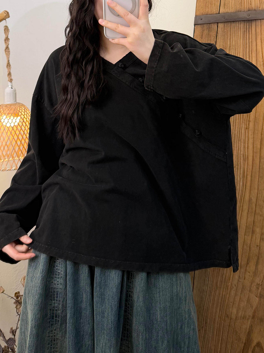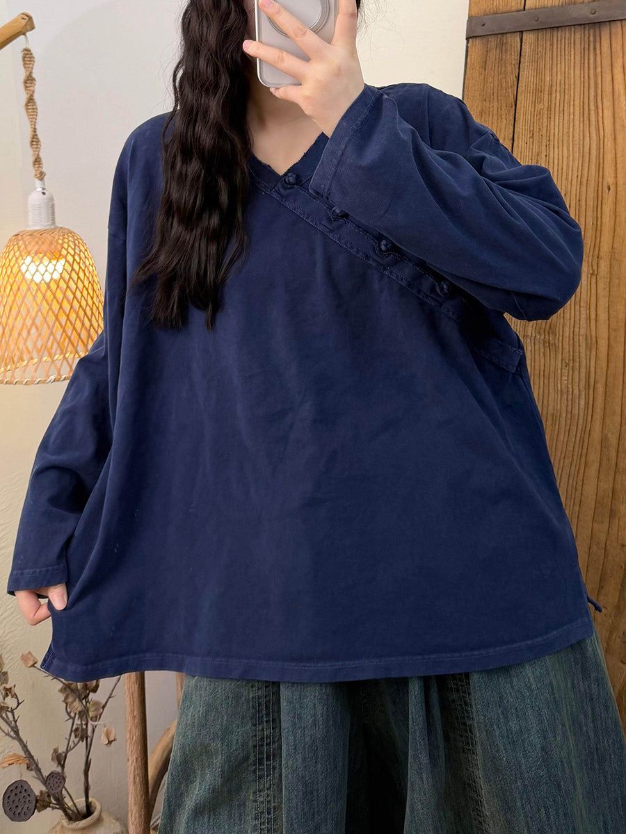 Women Artsy Spring Vintage V-Neck Cotton Blouse
