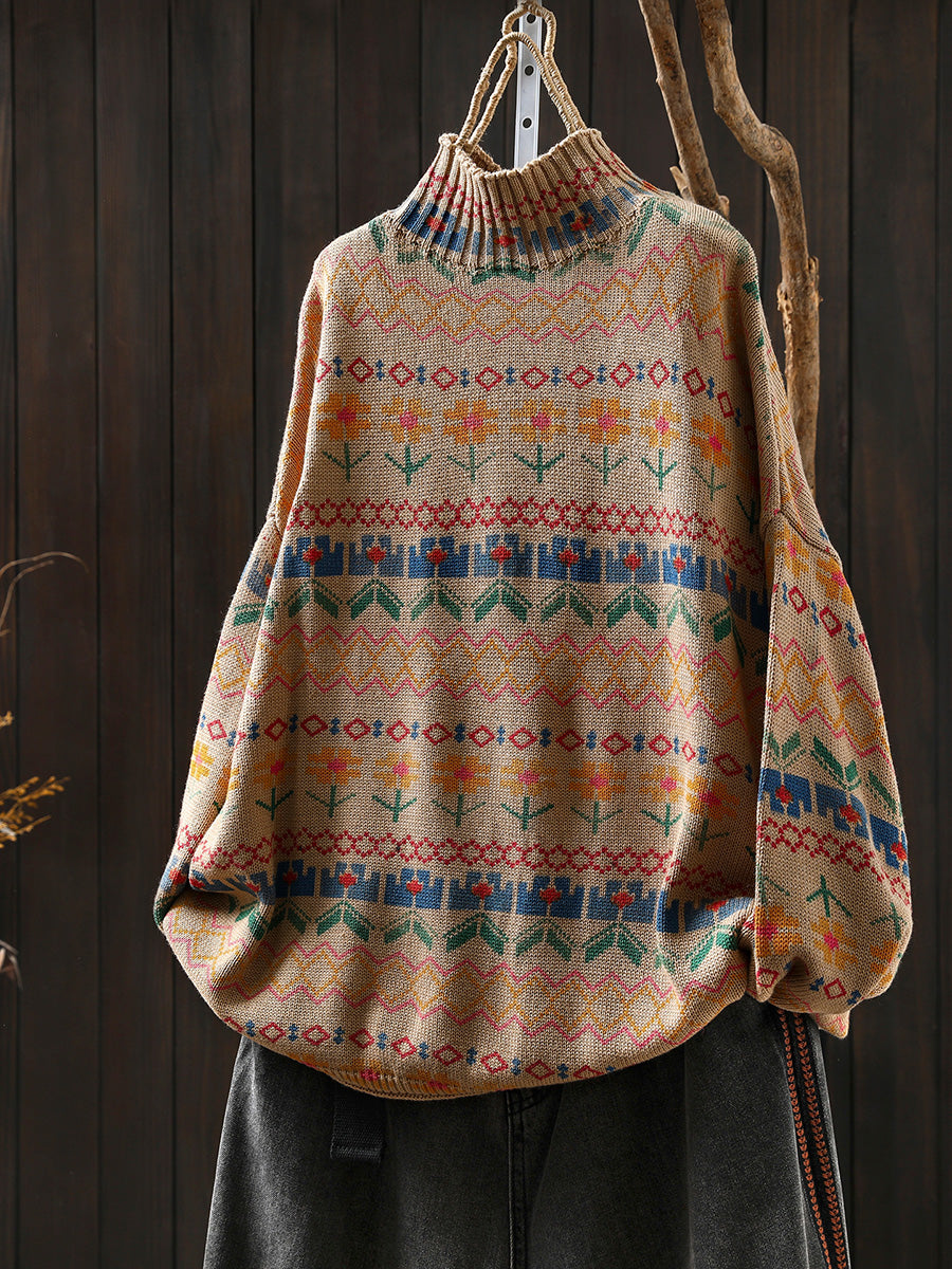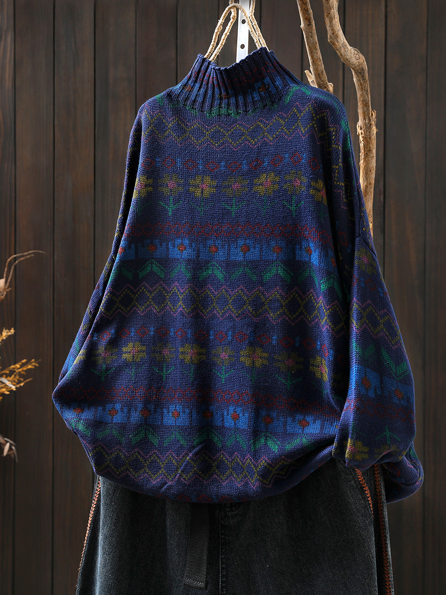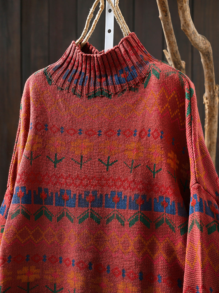 Women Autumn Artsy Flower Half-Turtleneck Sweater