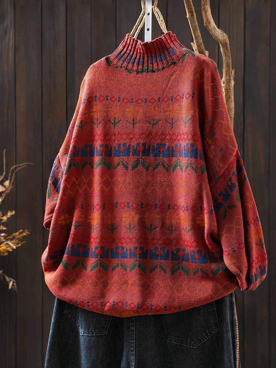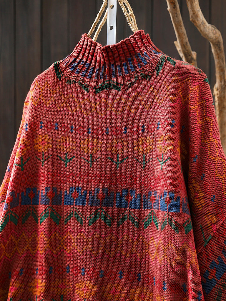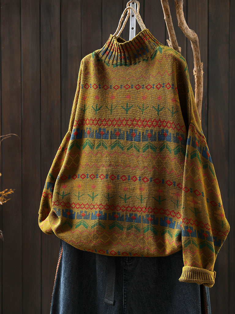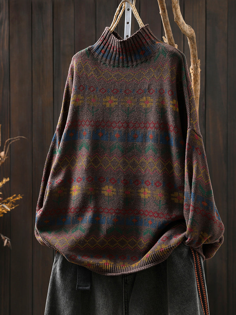 Women Autumn Artsy Flower Half-Turtleneck Sweater
