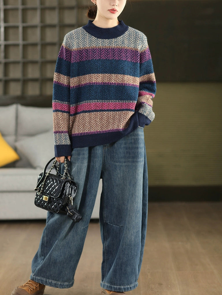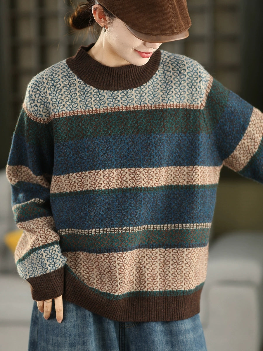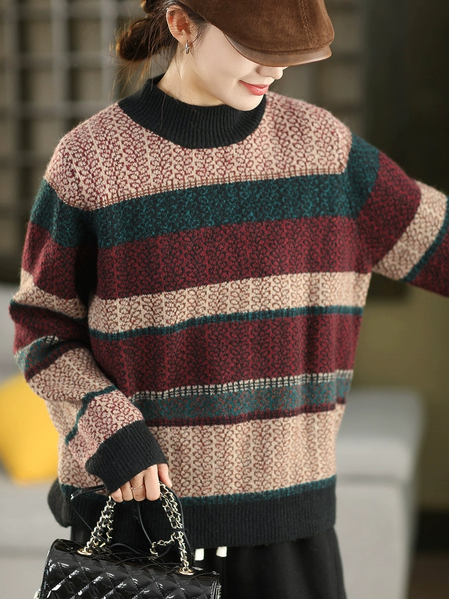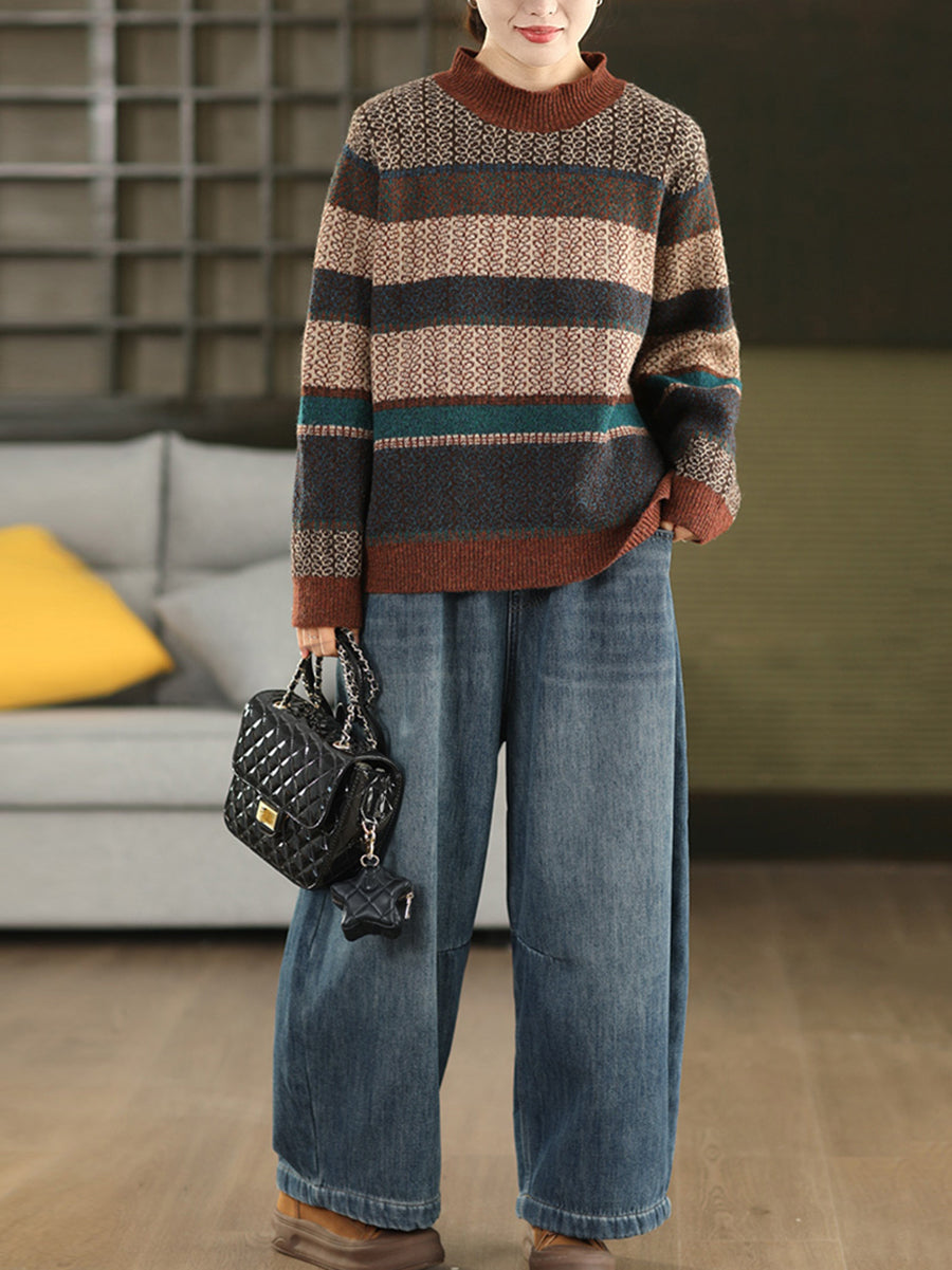 Women Autumn Artsy Stripe Half-Turtleneck Sweater