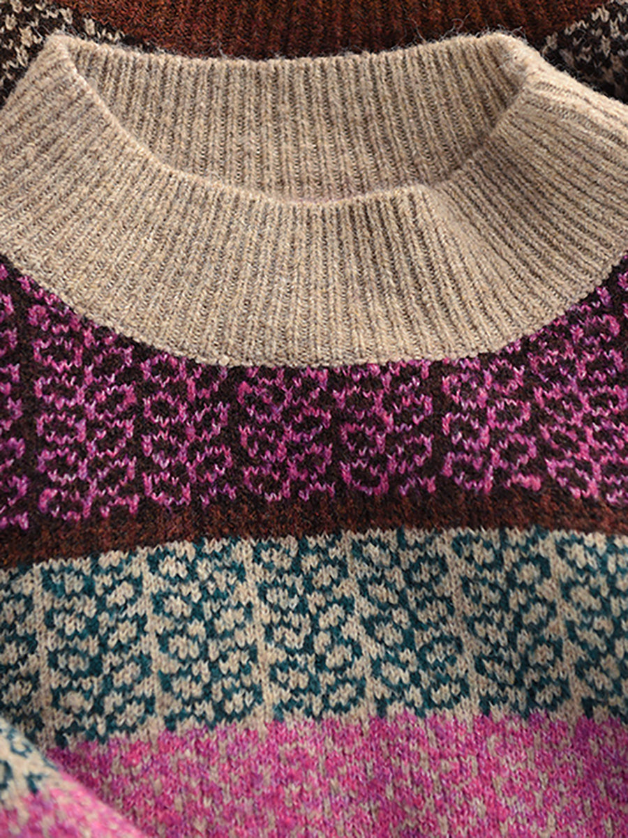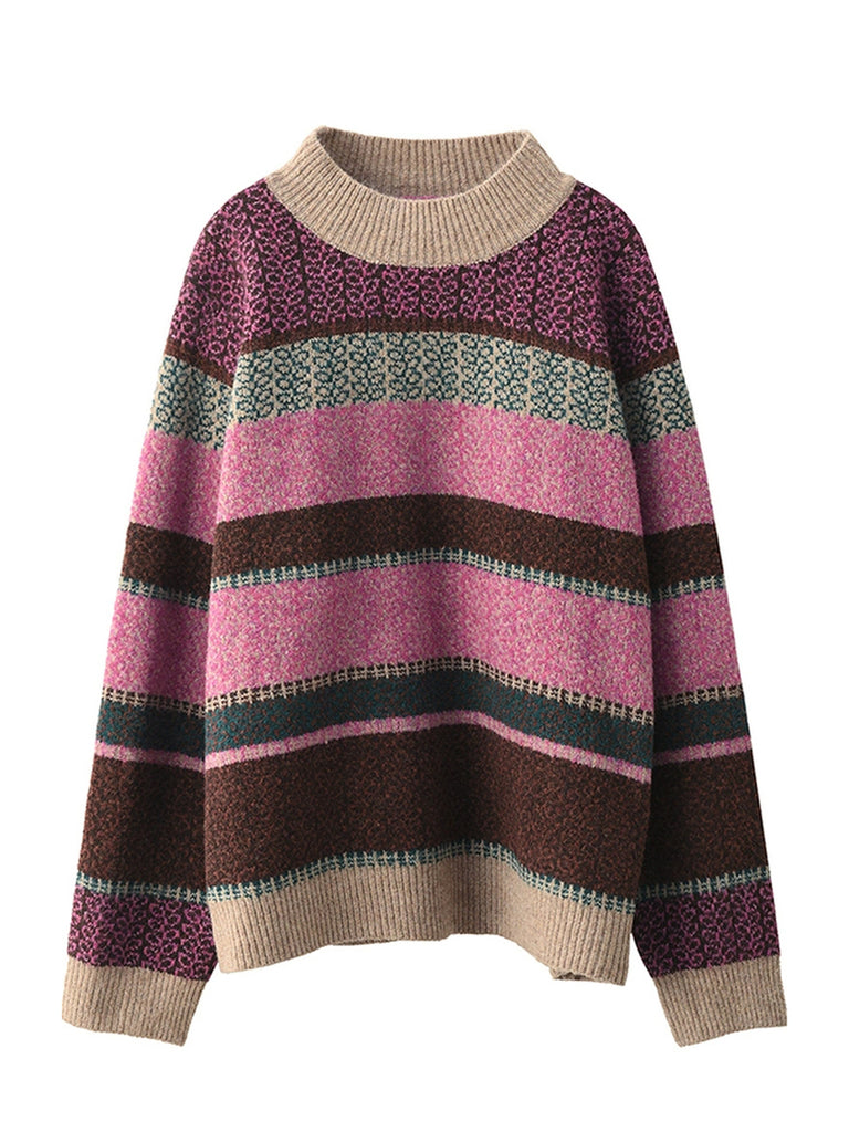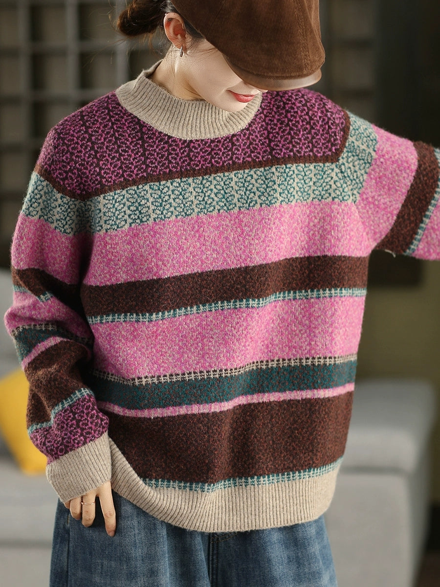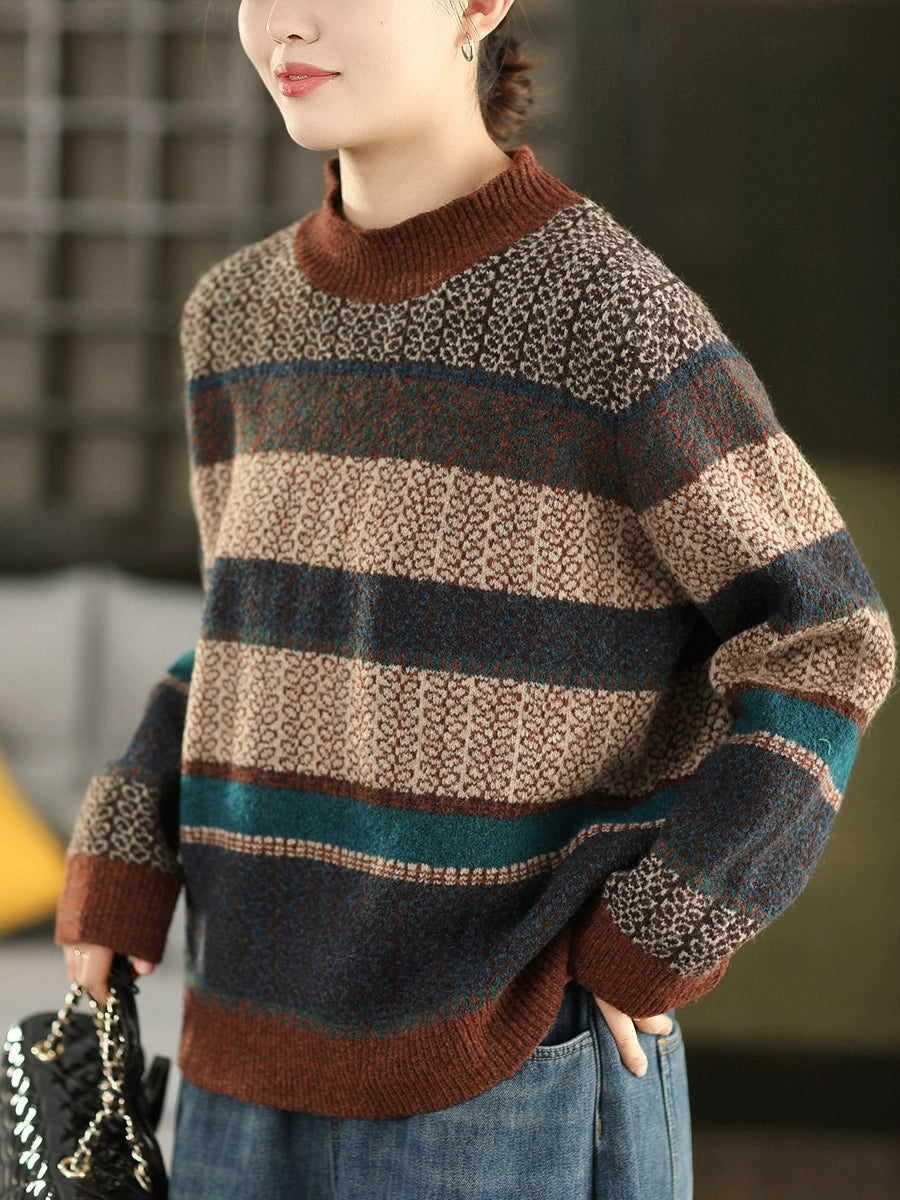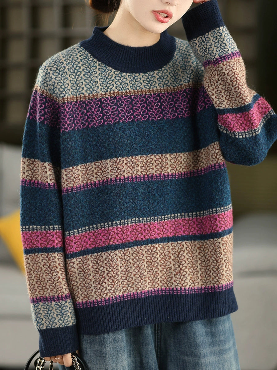 Women Autumn Artsy Stripe Half-Turtleneck Sweater