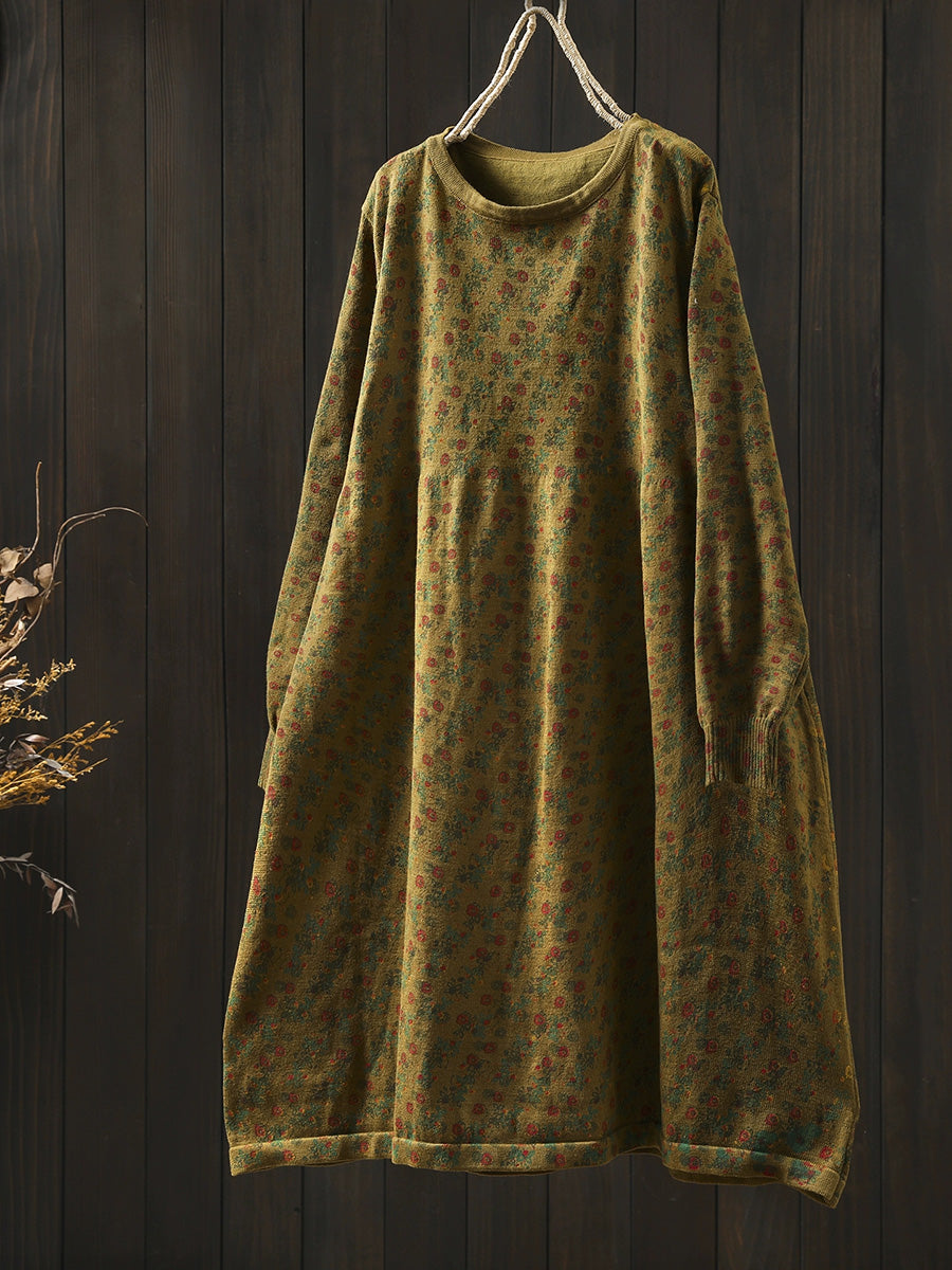 Women Autumn Vintage Floral O-Neck Knitted Dress