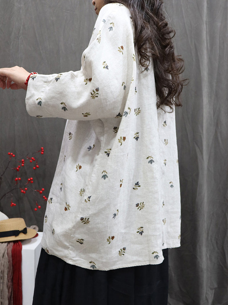 Women Autumn Vintage Flower 100%Linen V-Neck Blouse