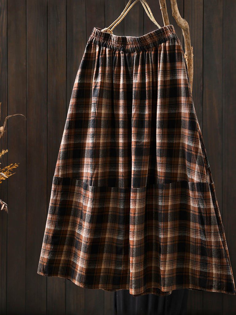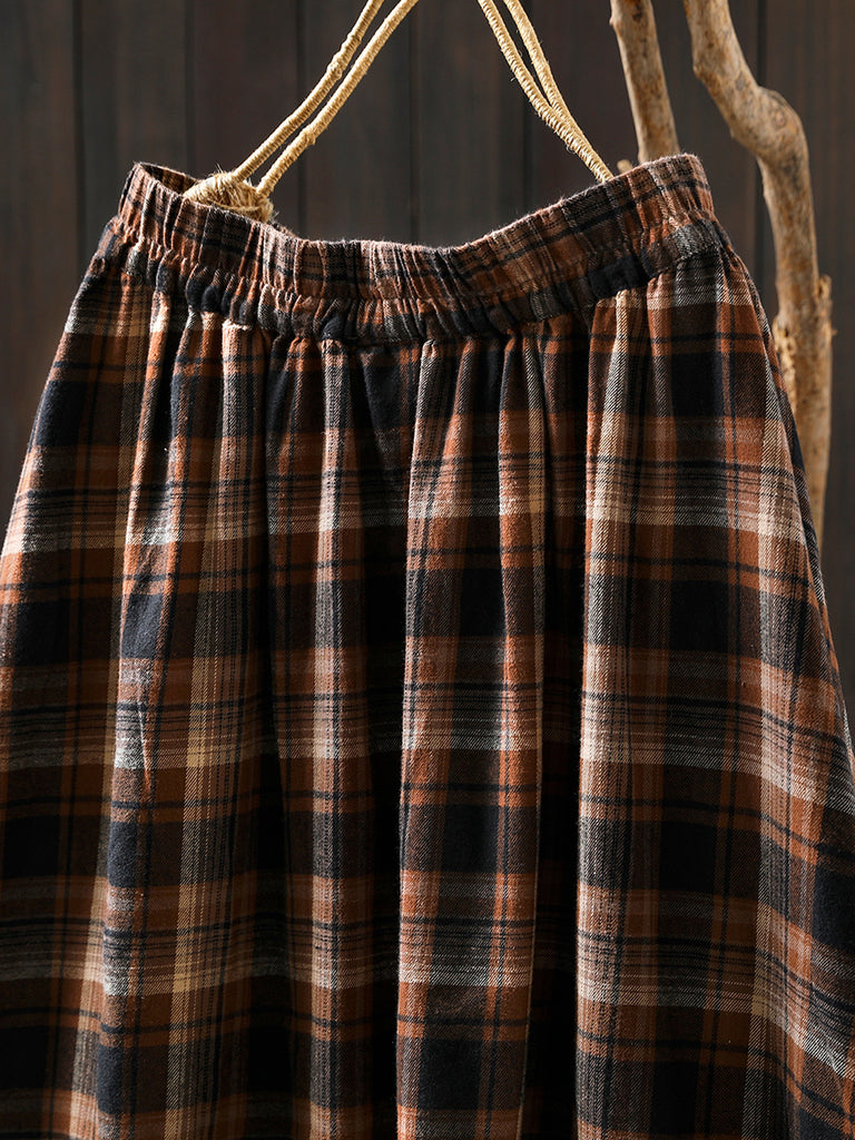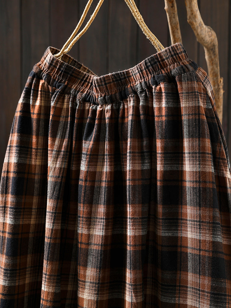 Women Autumn Vintage Plaid A-Shape 100%Cotton Skirt