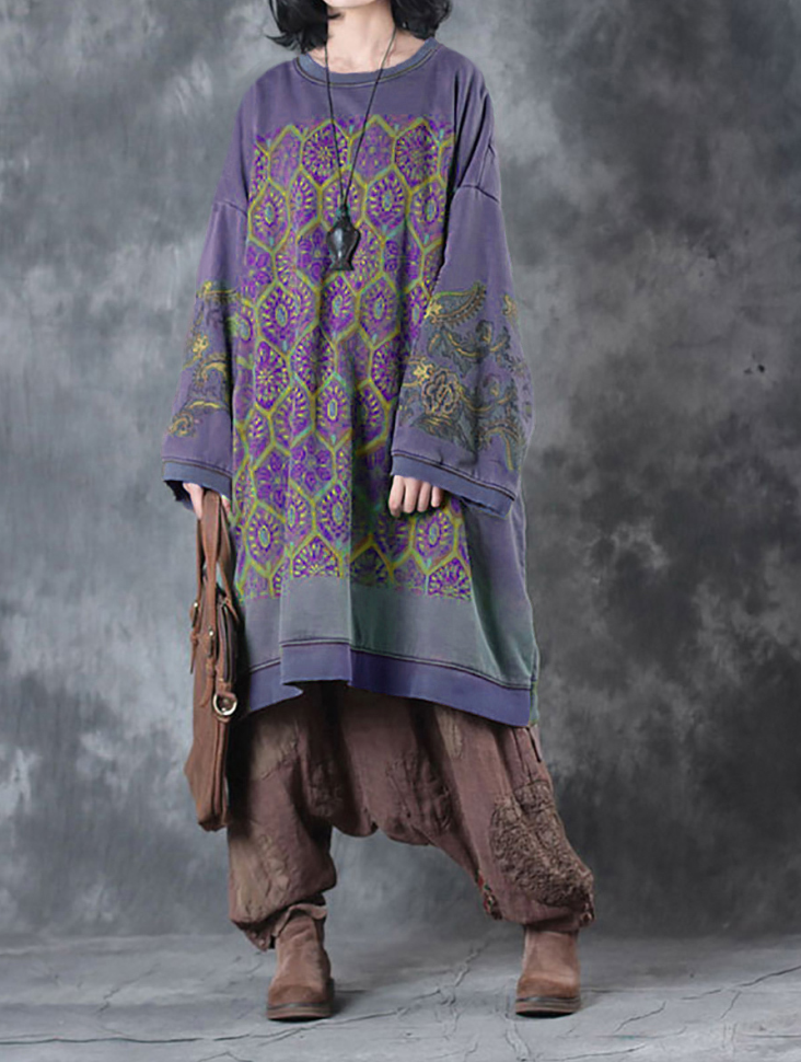 Plus Size Women Casual Autumn Worn Flower O-Neck Cotton Dress