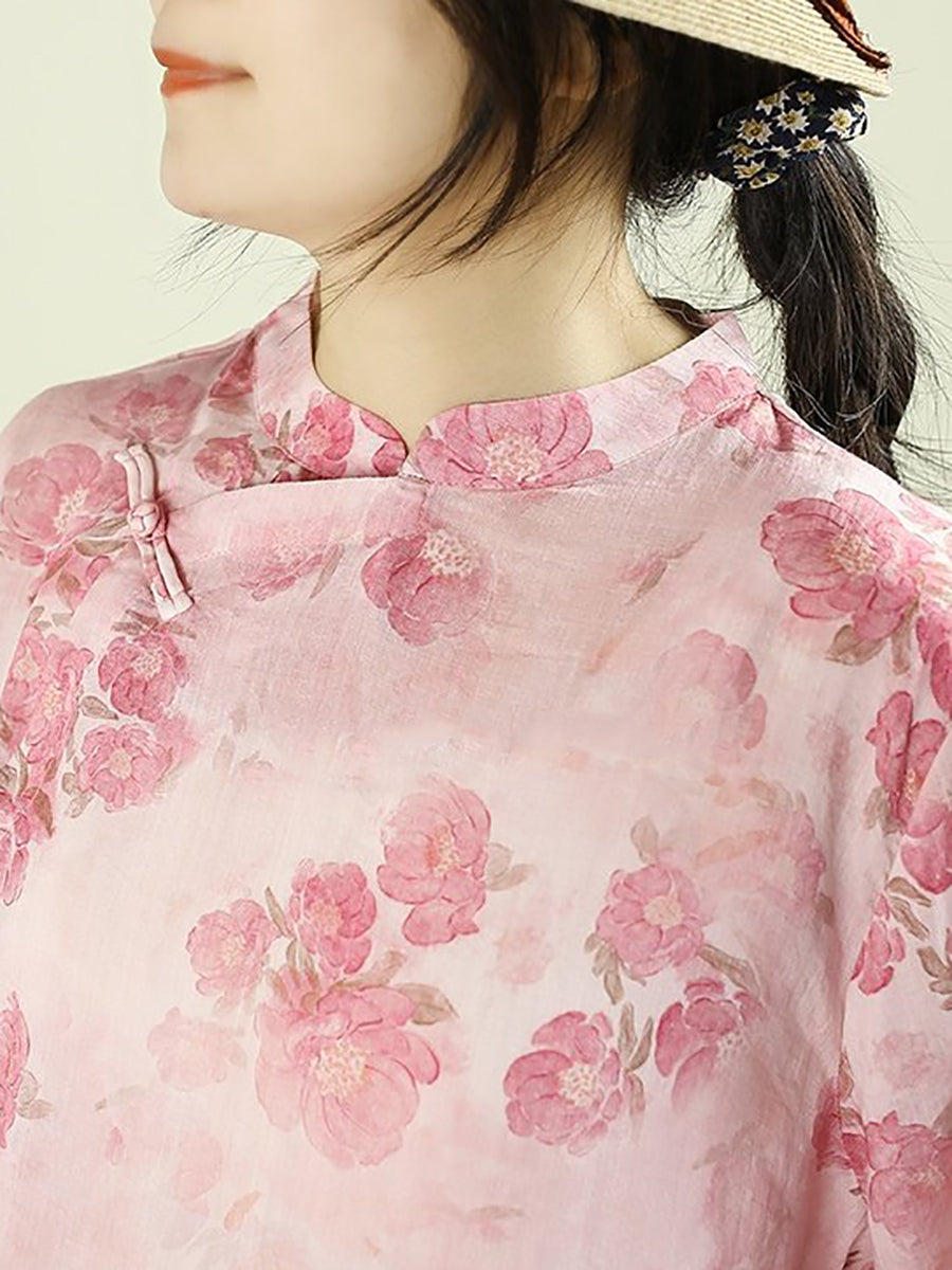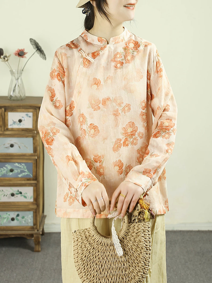 Women Ethnic Spring Flower Stand Collar 100%Ramie Blouse