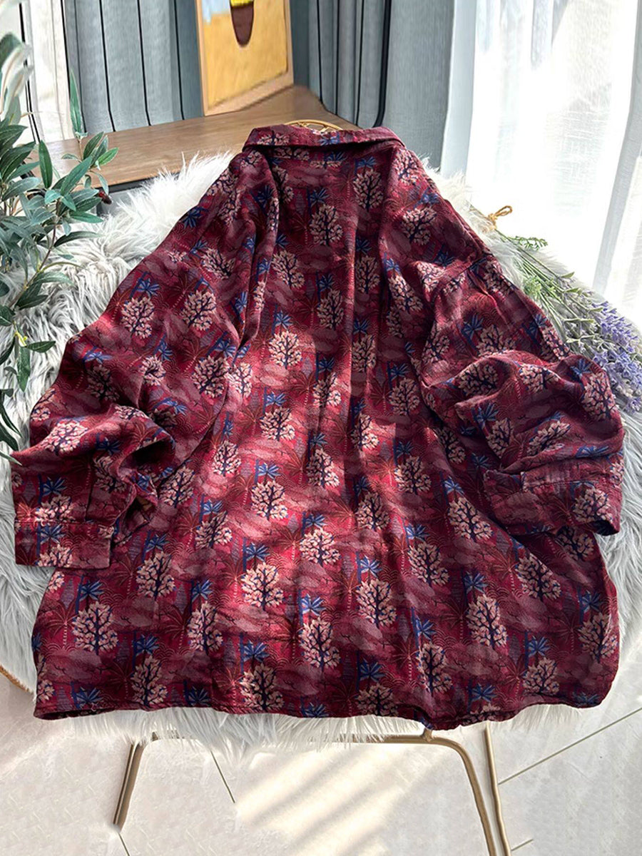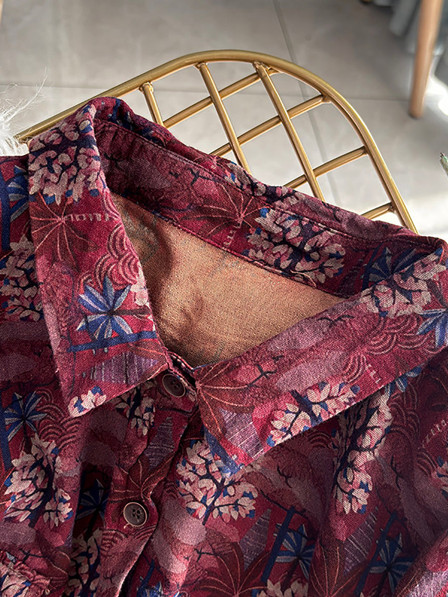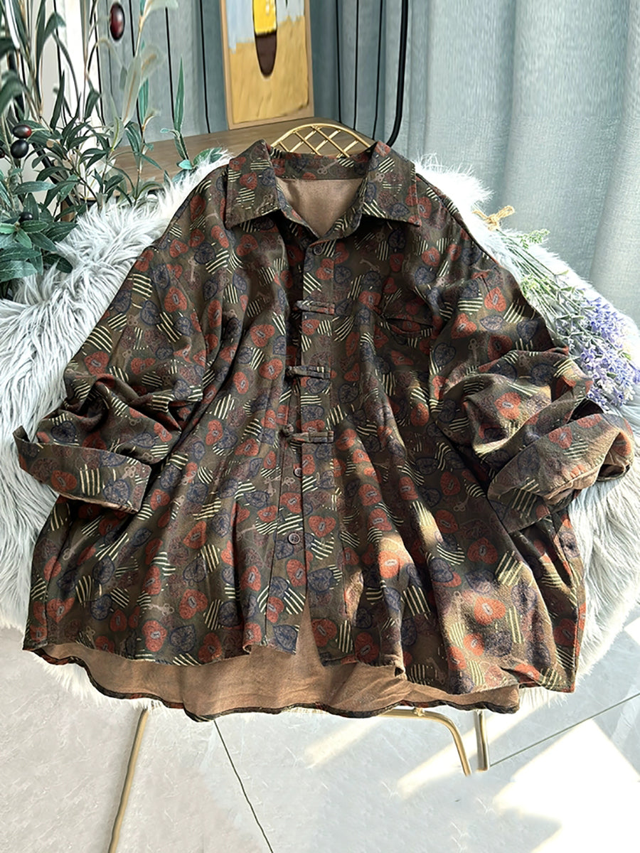 Women Retro Flower Turn-down Collar Shirt Coat
