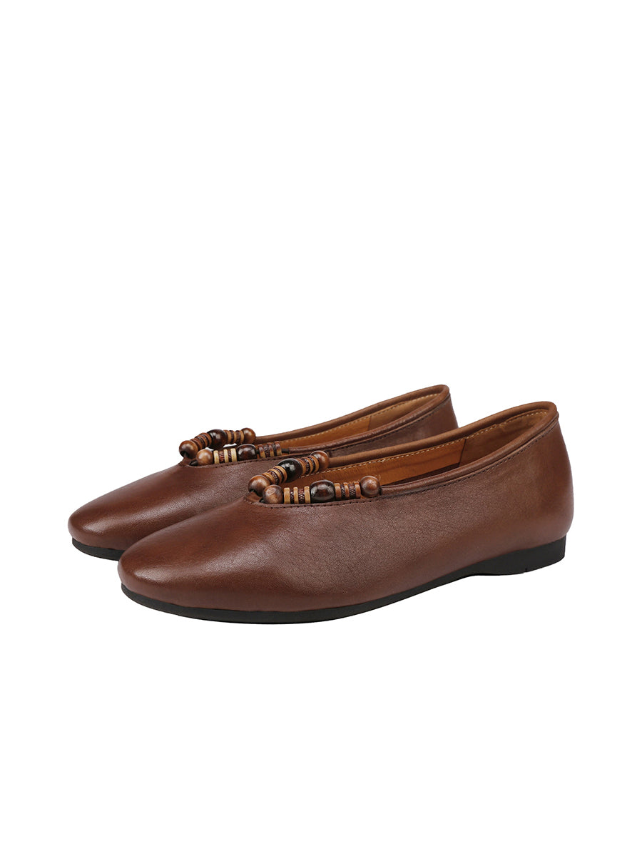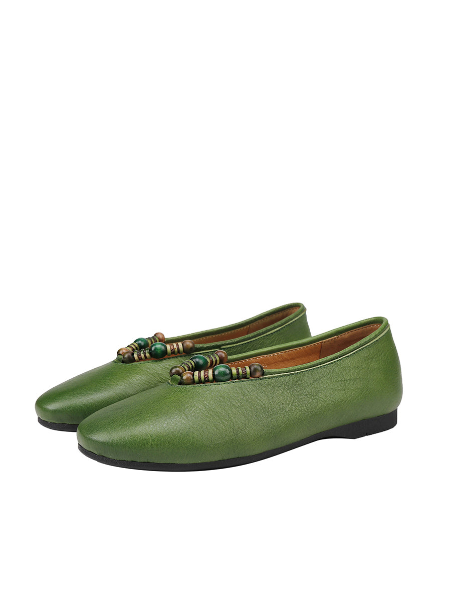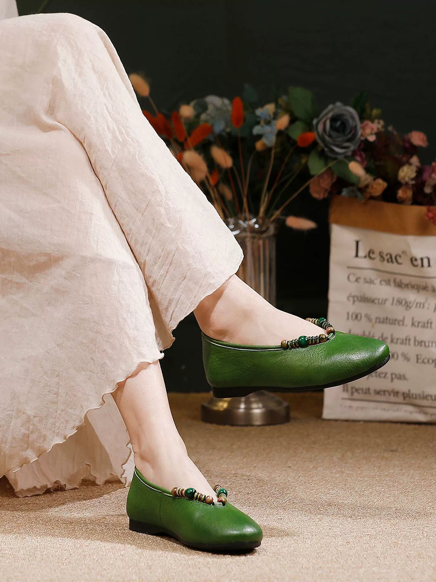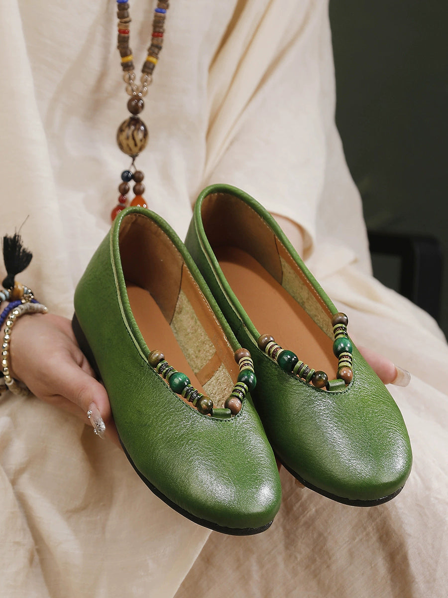 Women Retro Genuine Leather Beads Flat Shoes