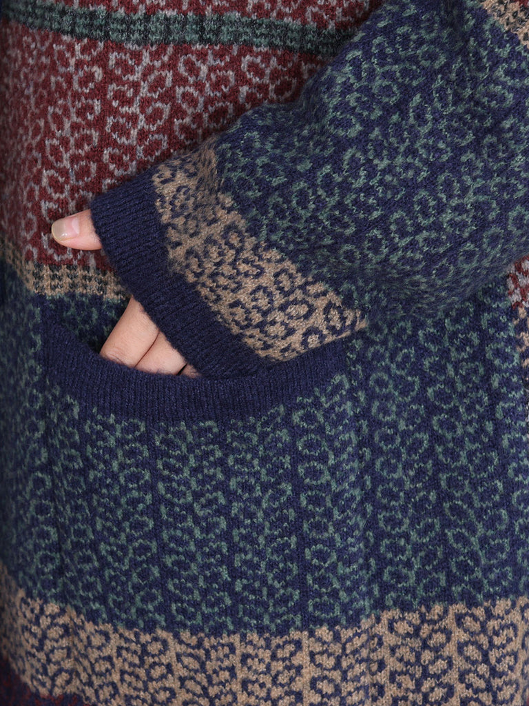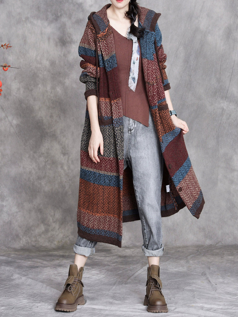 Women Retro Winter Colorblock Knitted Hooded Wool Coat
