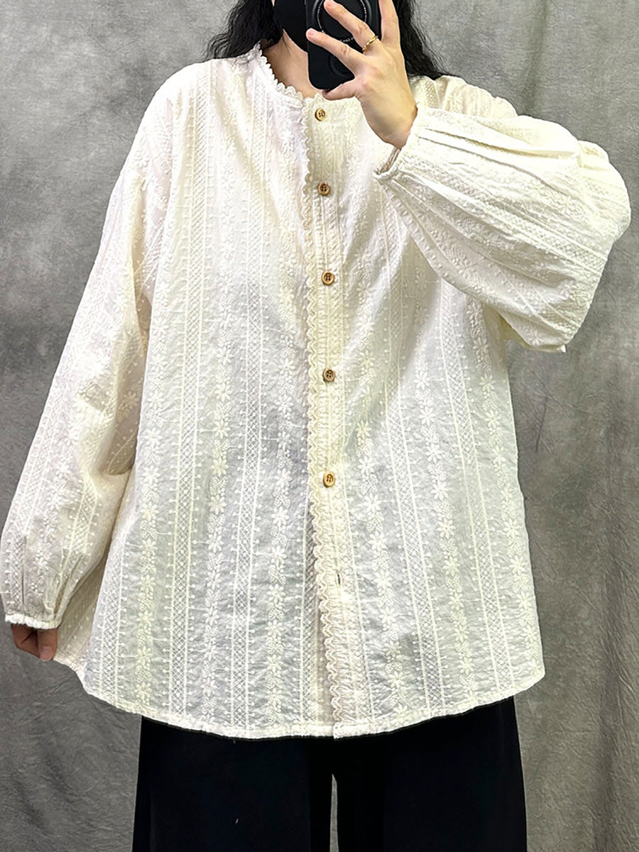 Women Spring Artsy Embroidery Cotton Stand Collar Shirt