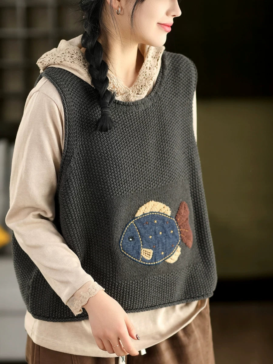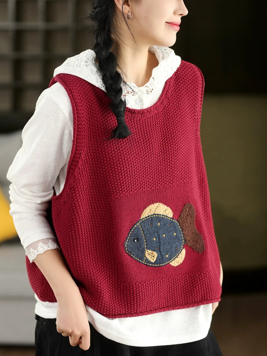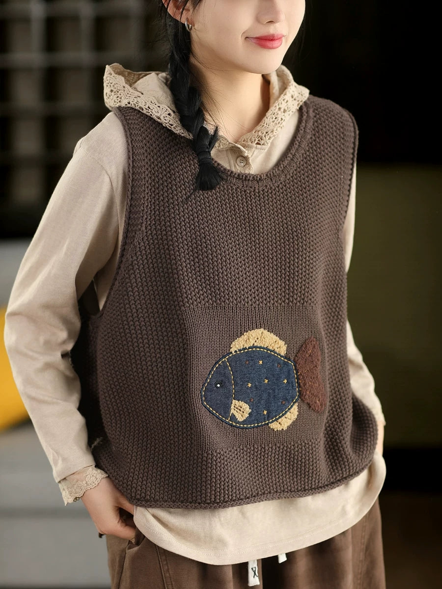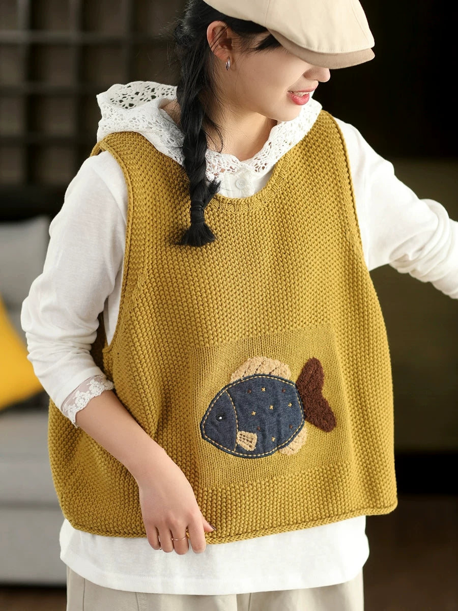 Women Spring Artsy Fish Patch O-Neck Vest