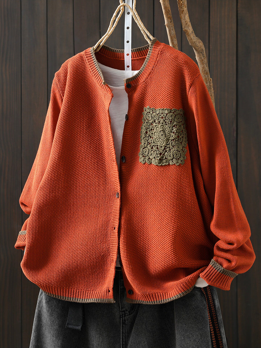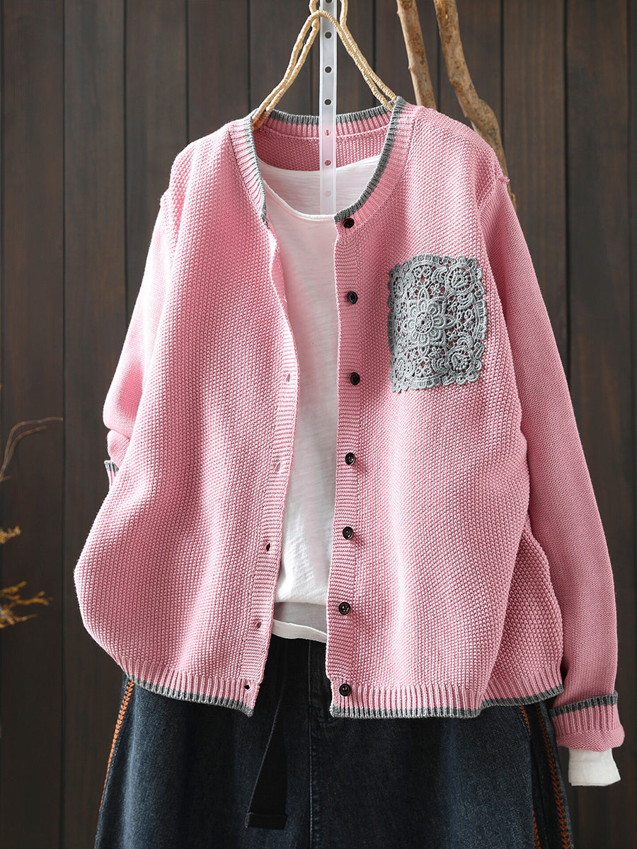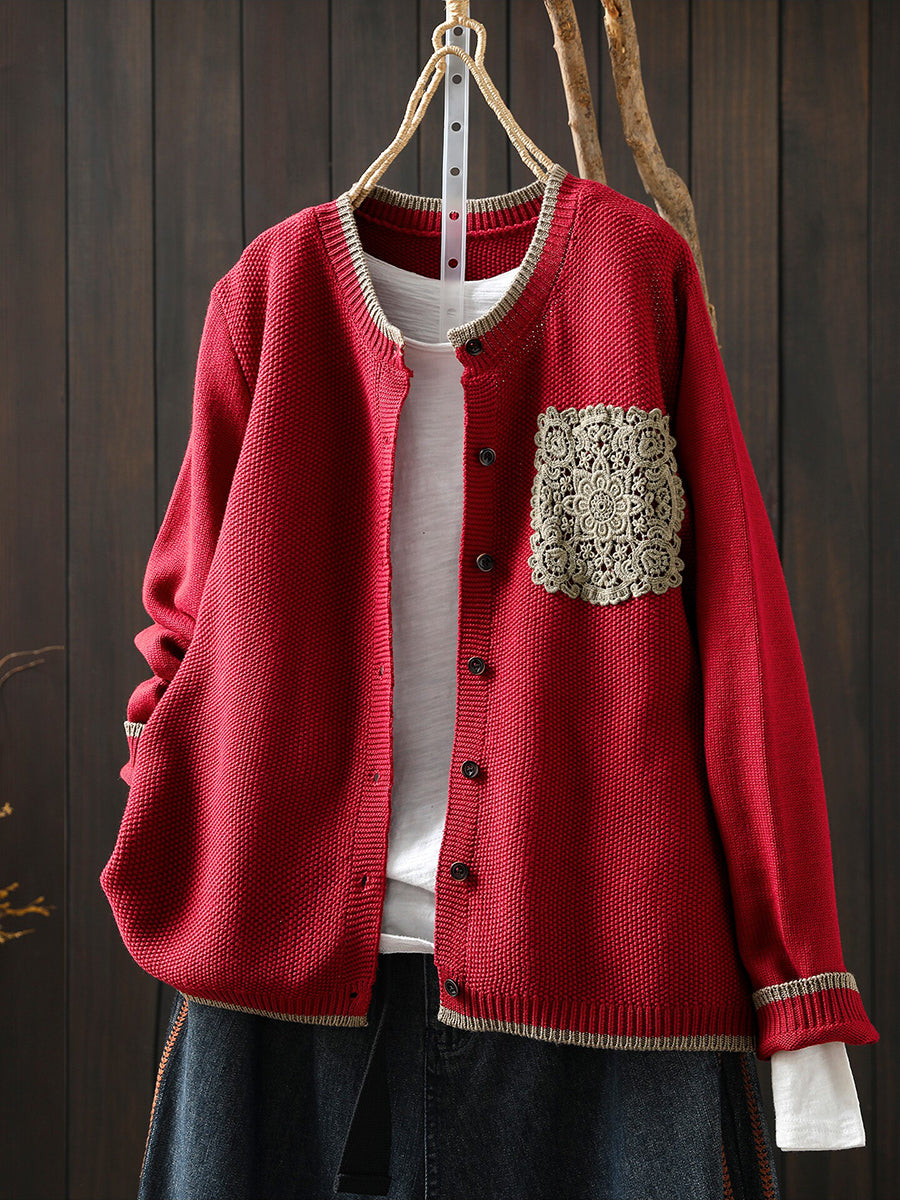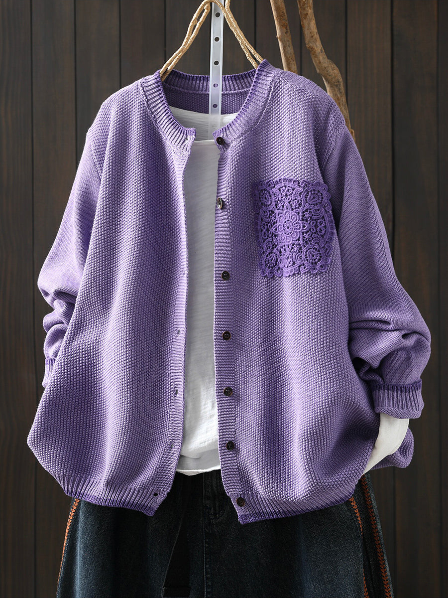 Women Spring Artsy Lace Patch Cotton Cardigan