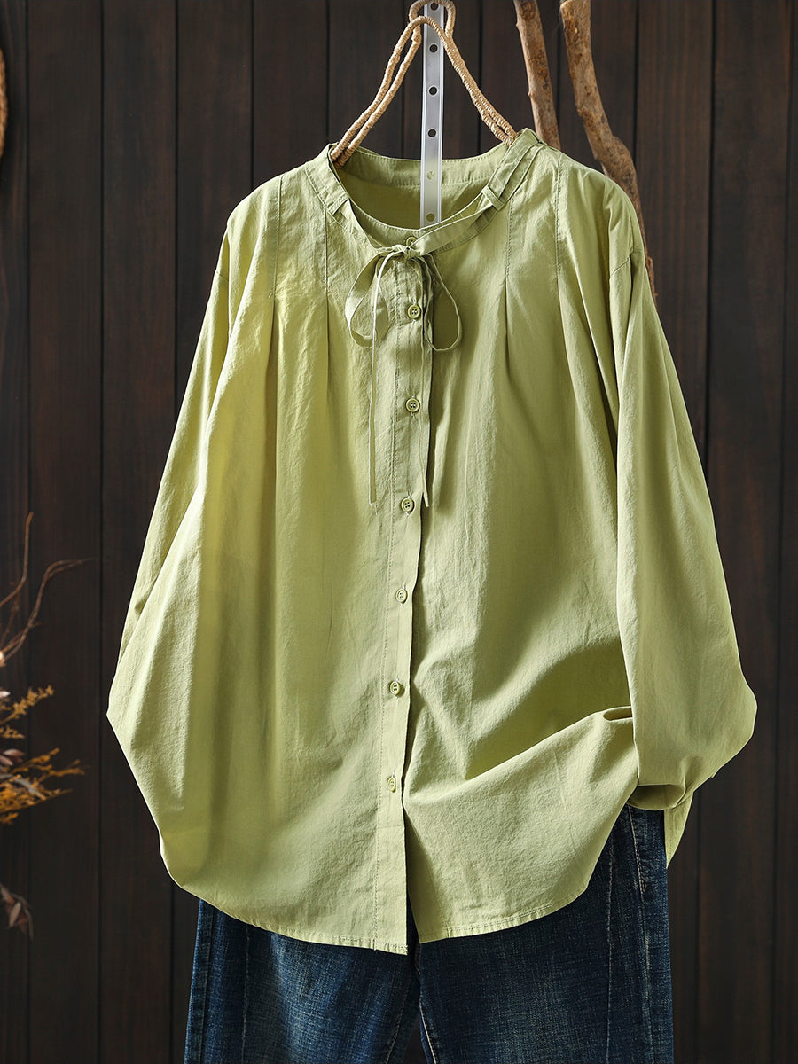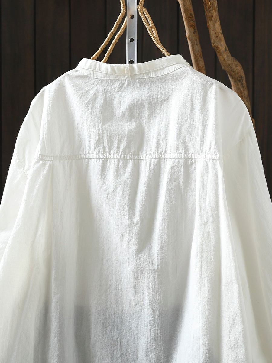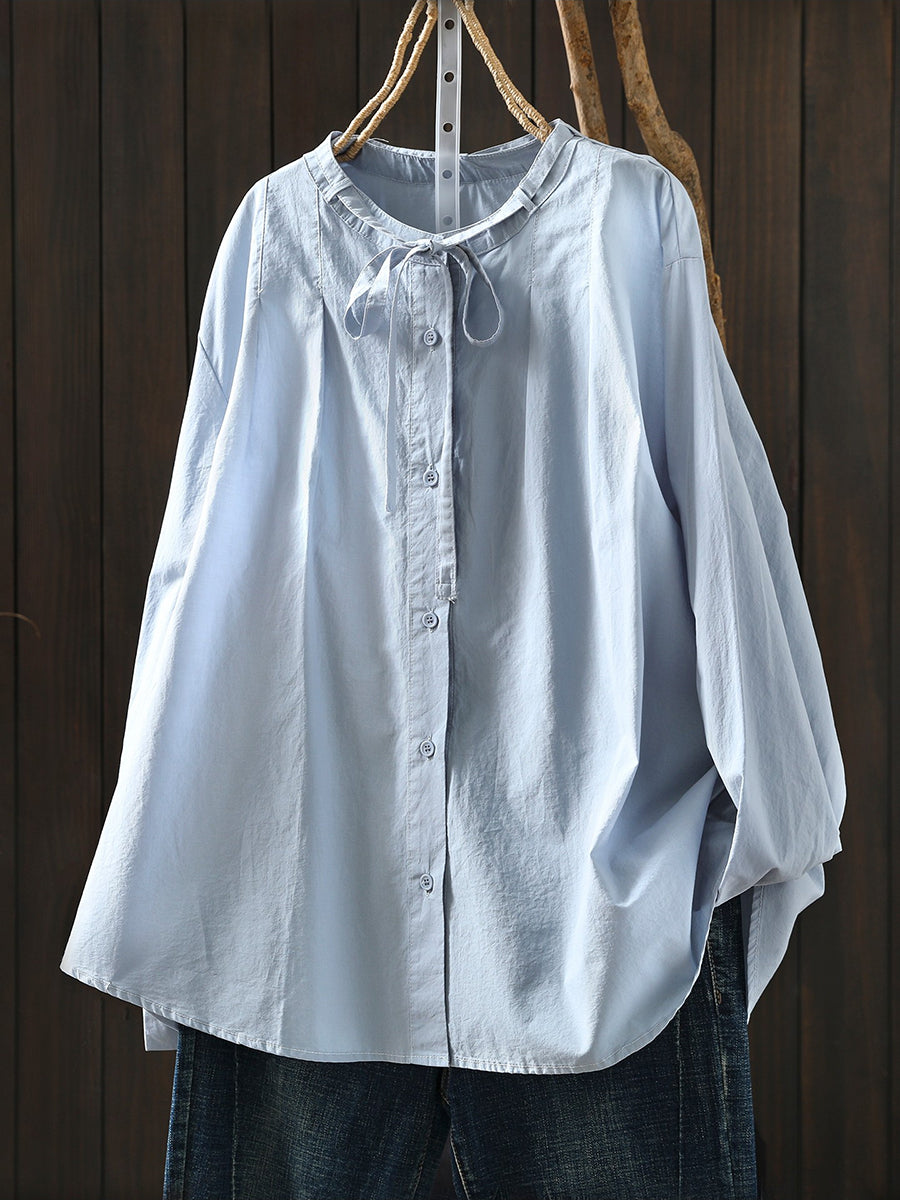 Women Spring Artsy Pure Color 100%Cotton Stand Collar Blouse