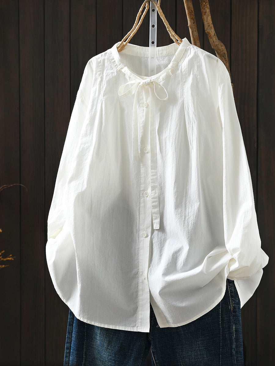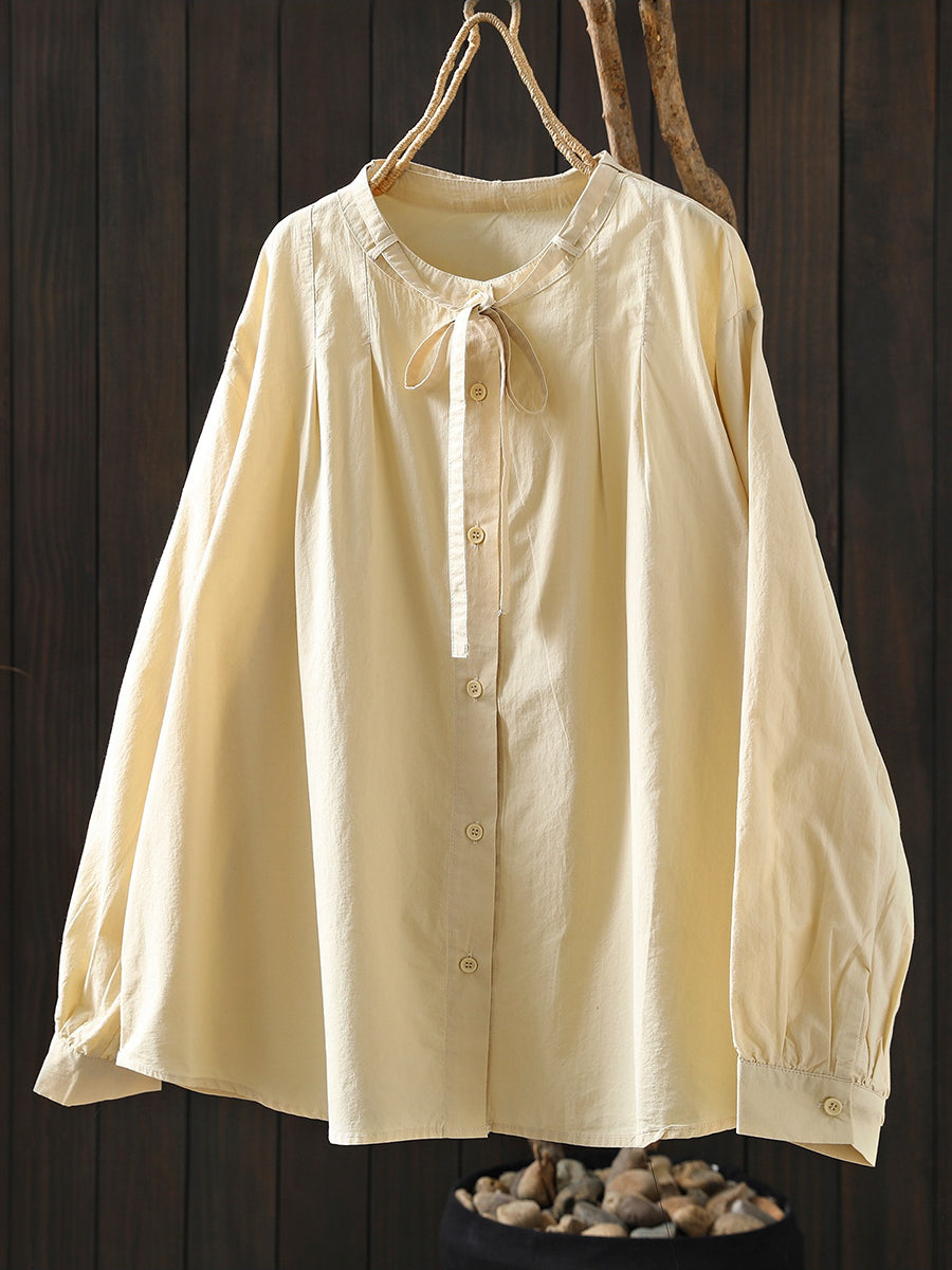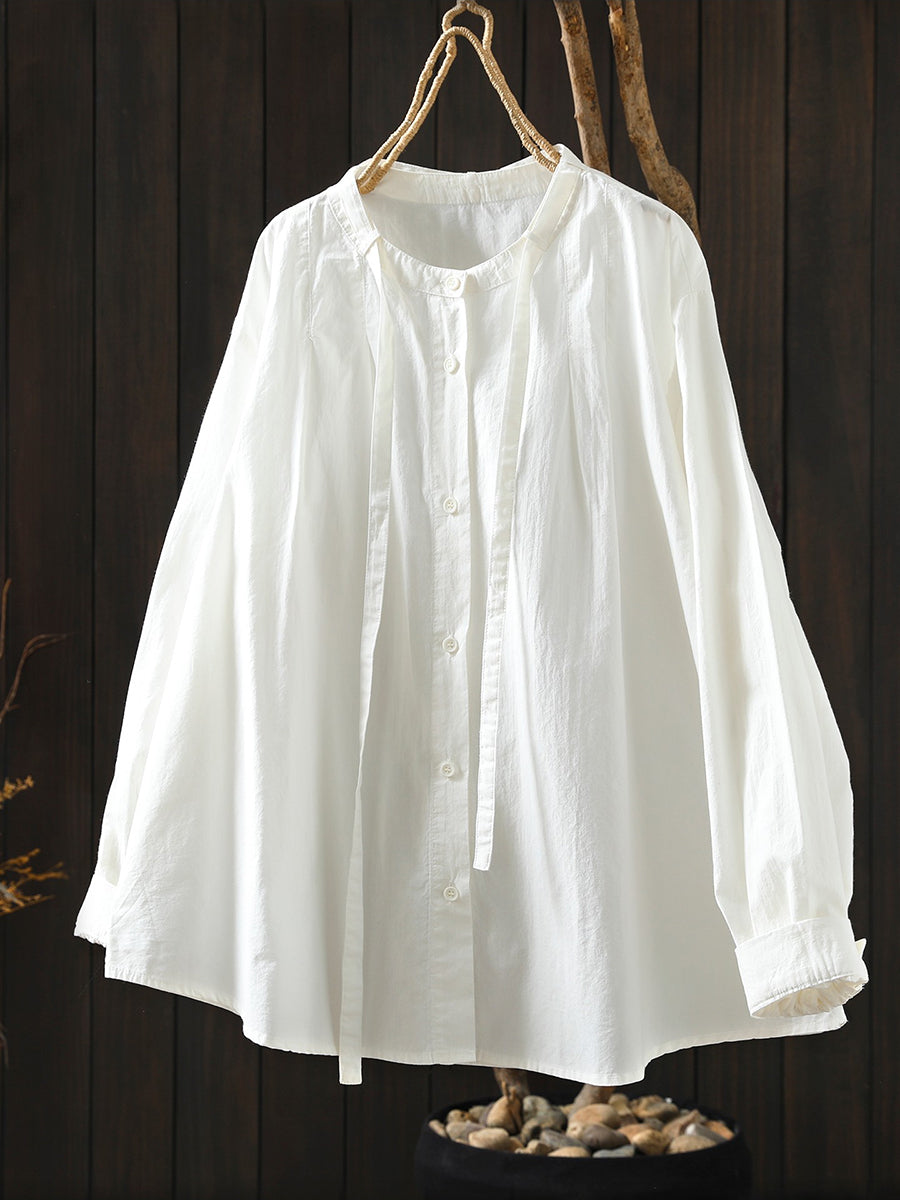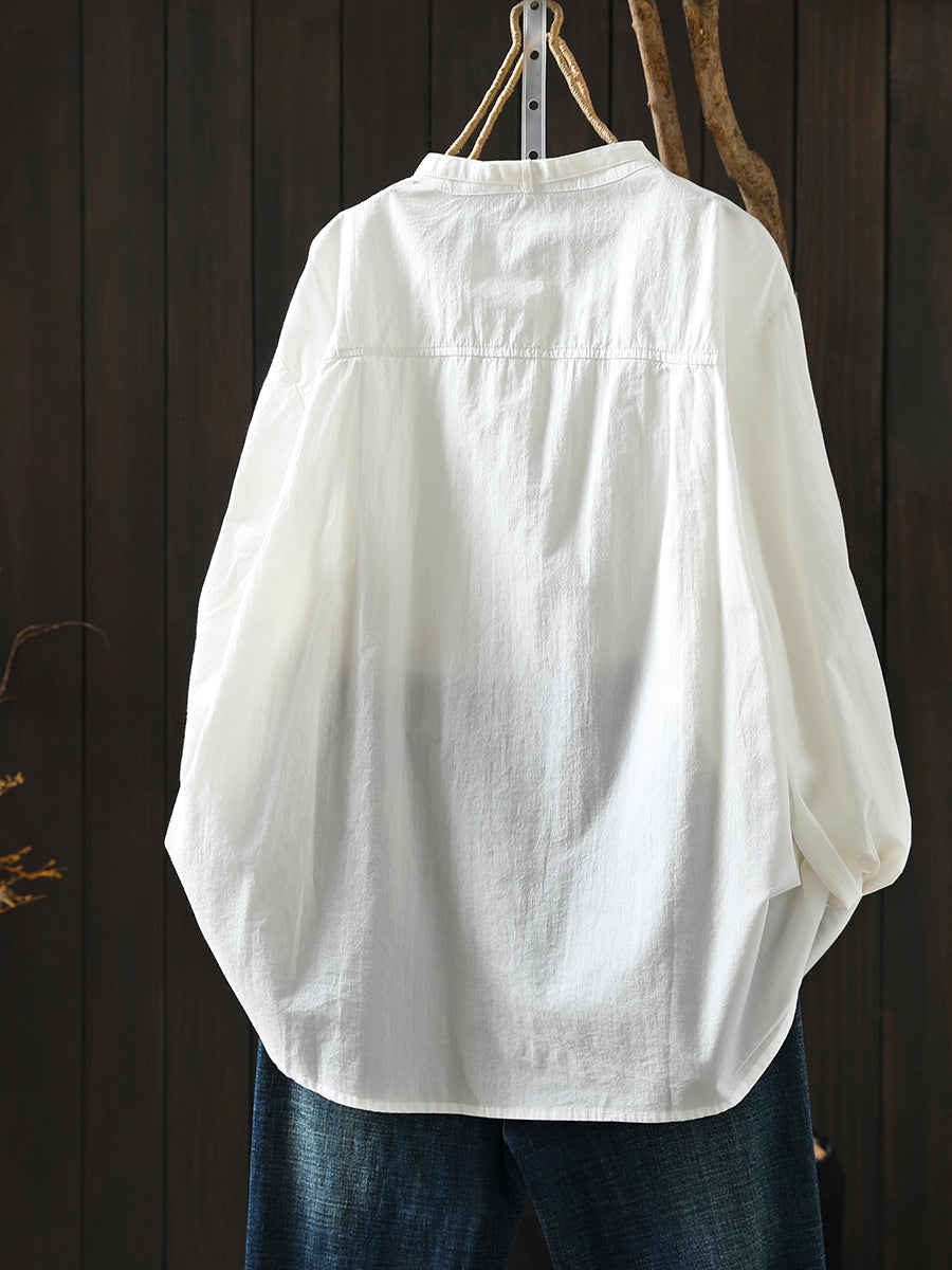 Women Spring Artsy Pure Color 100%Cotton Stand Collar Blouse