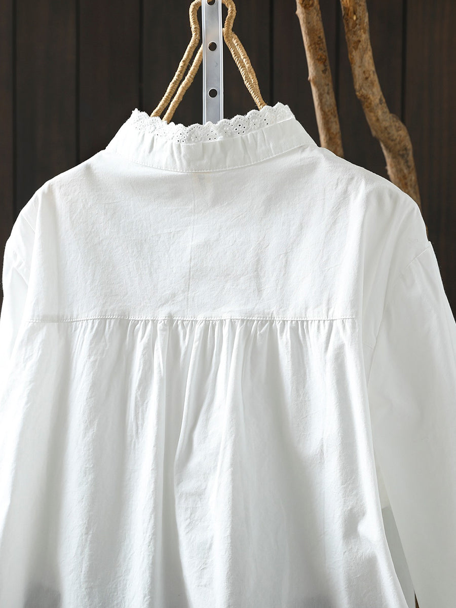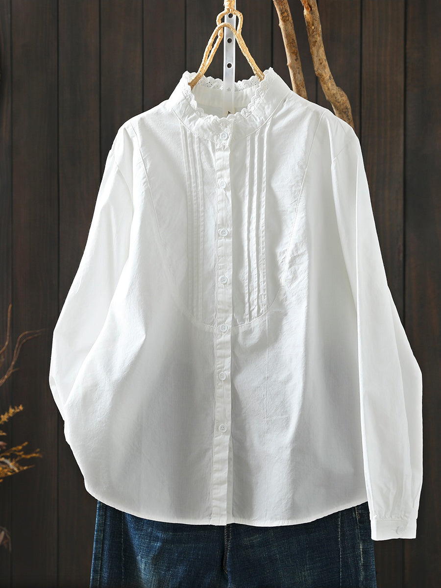 Women Spring Artsy Shirred 100%Cotton Stand Collar Shirt