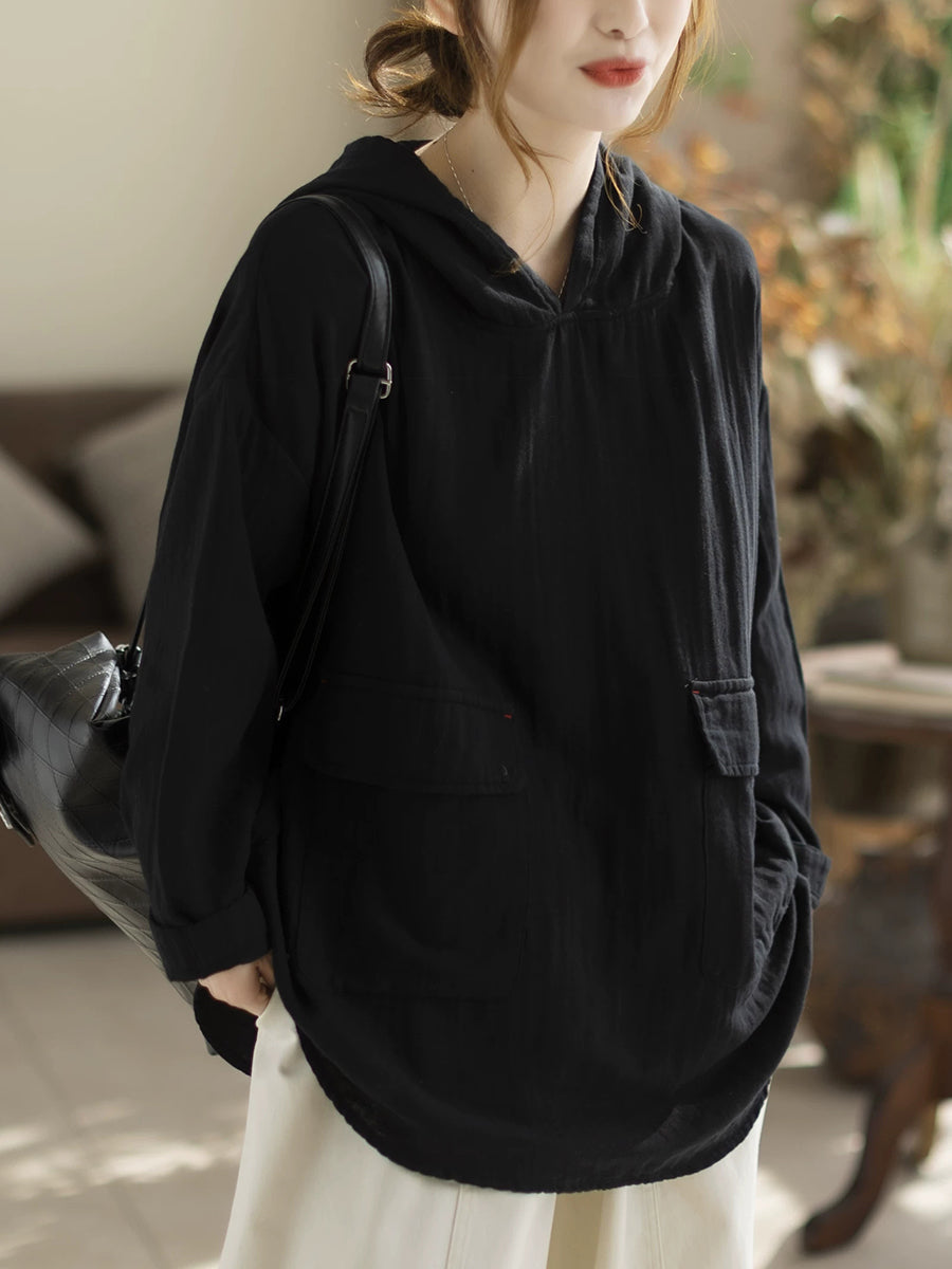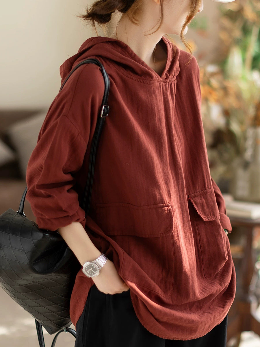 Women Spring Casual Pure Color Hooded Blouse