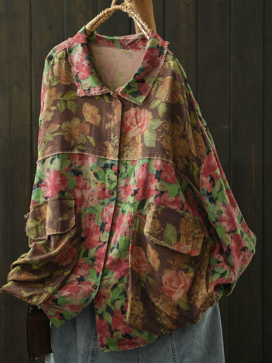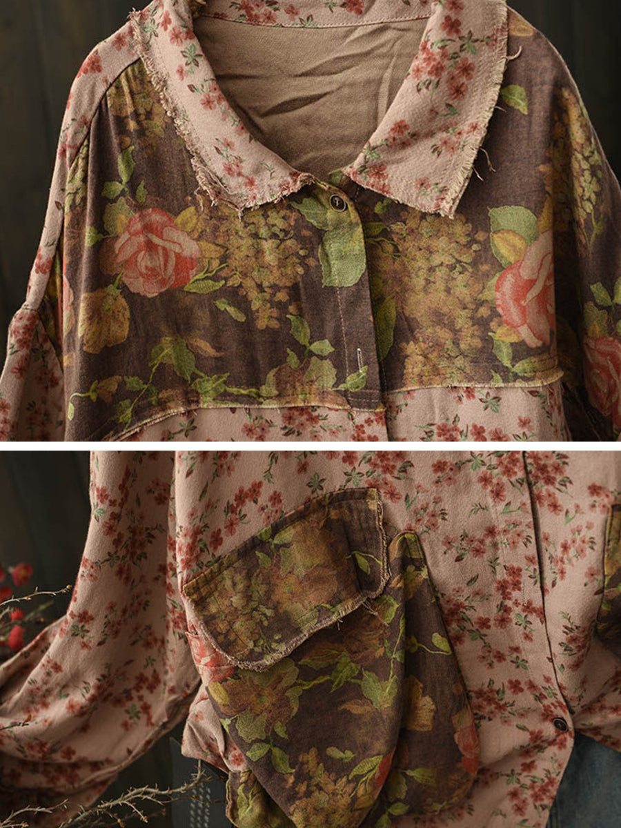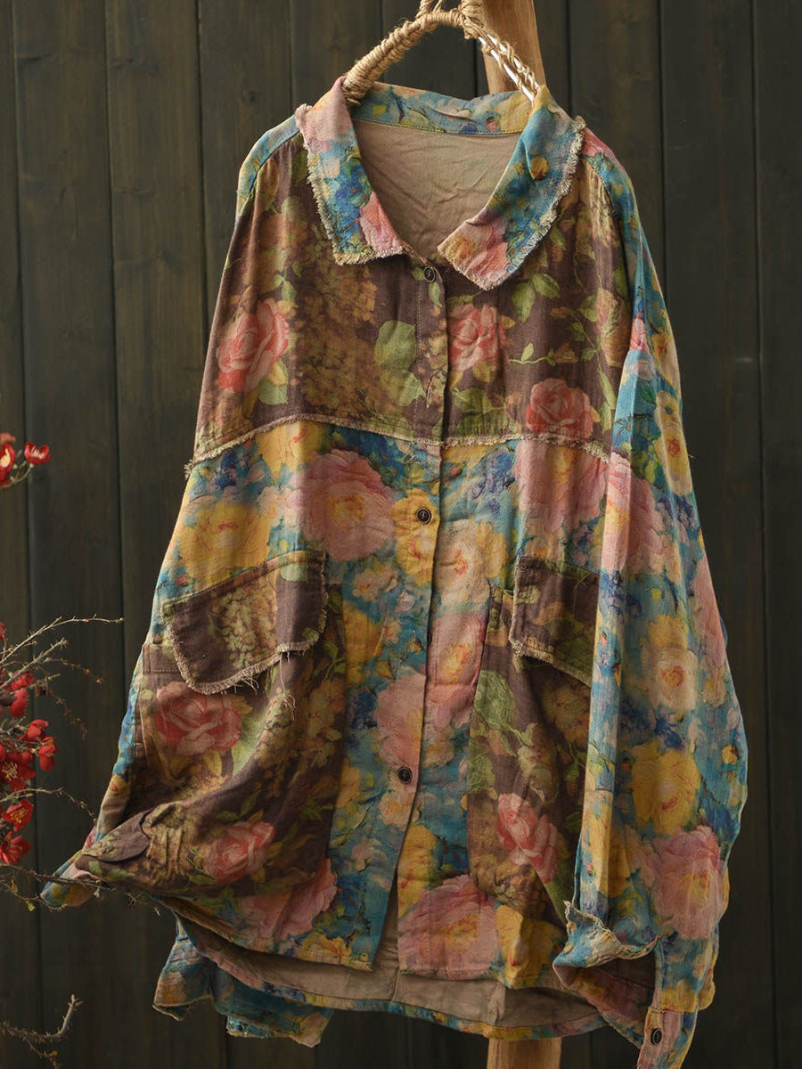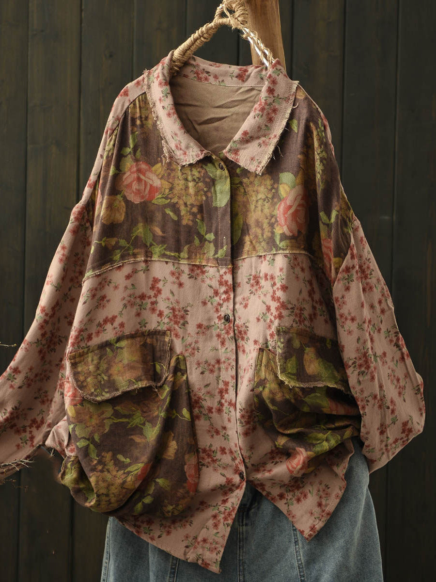 Women Spring Floral Spliced Turn-down Collar Cotton Blouse
