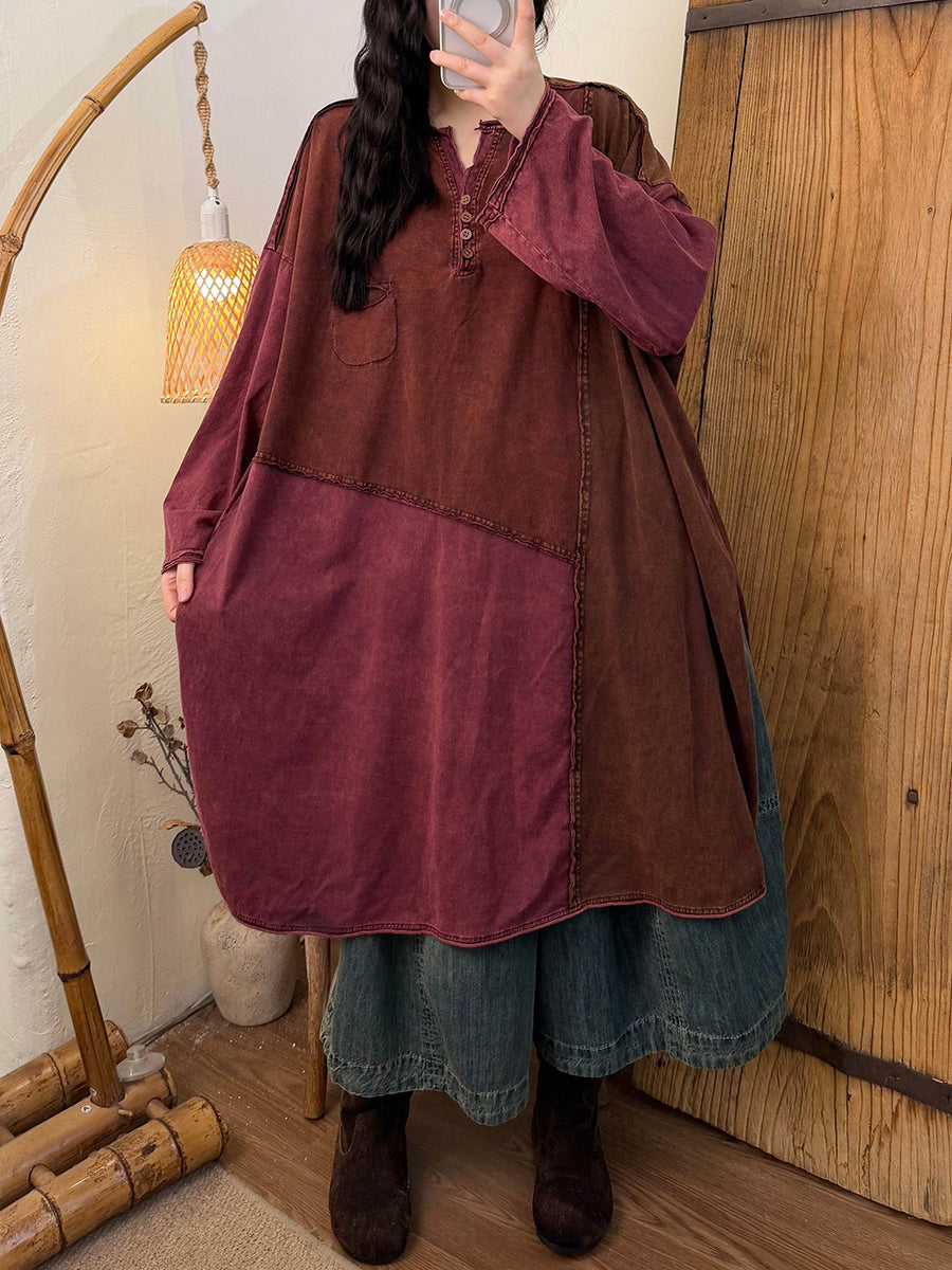 Women Spring Retro Colorblock Cotton Dress