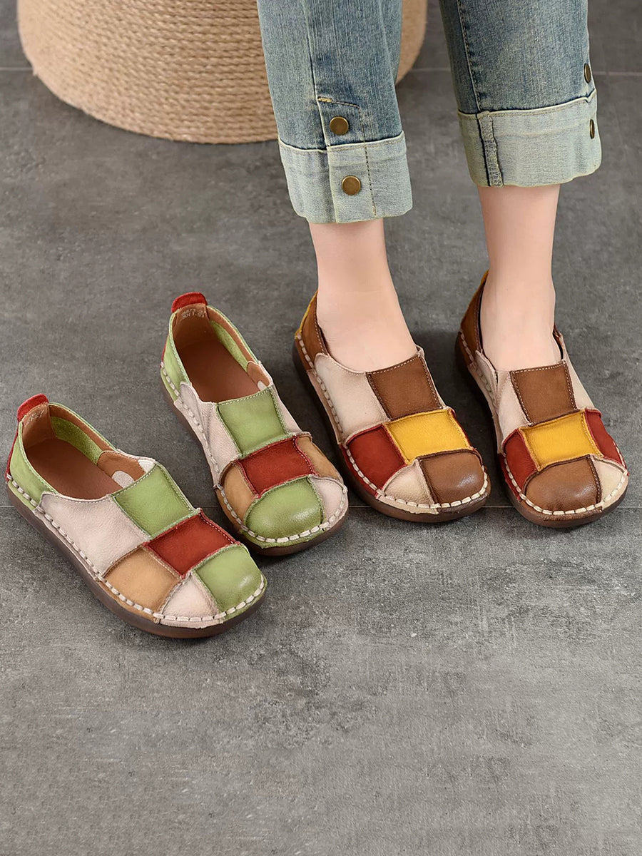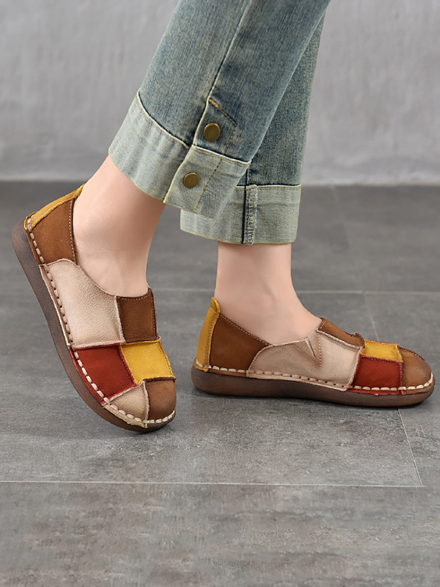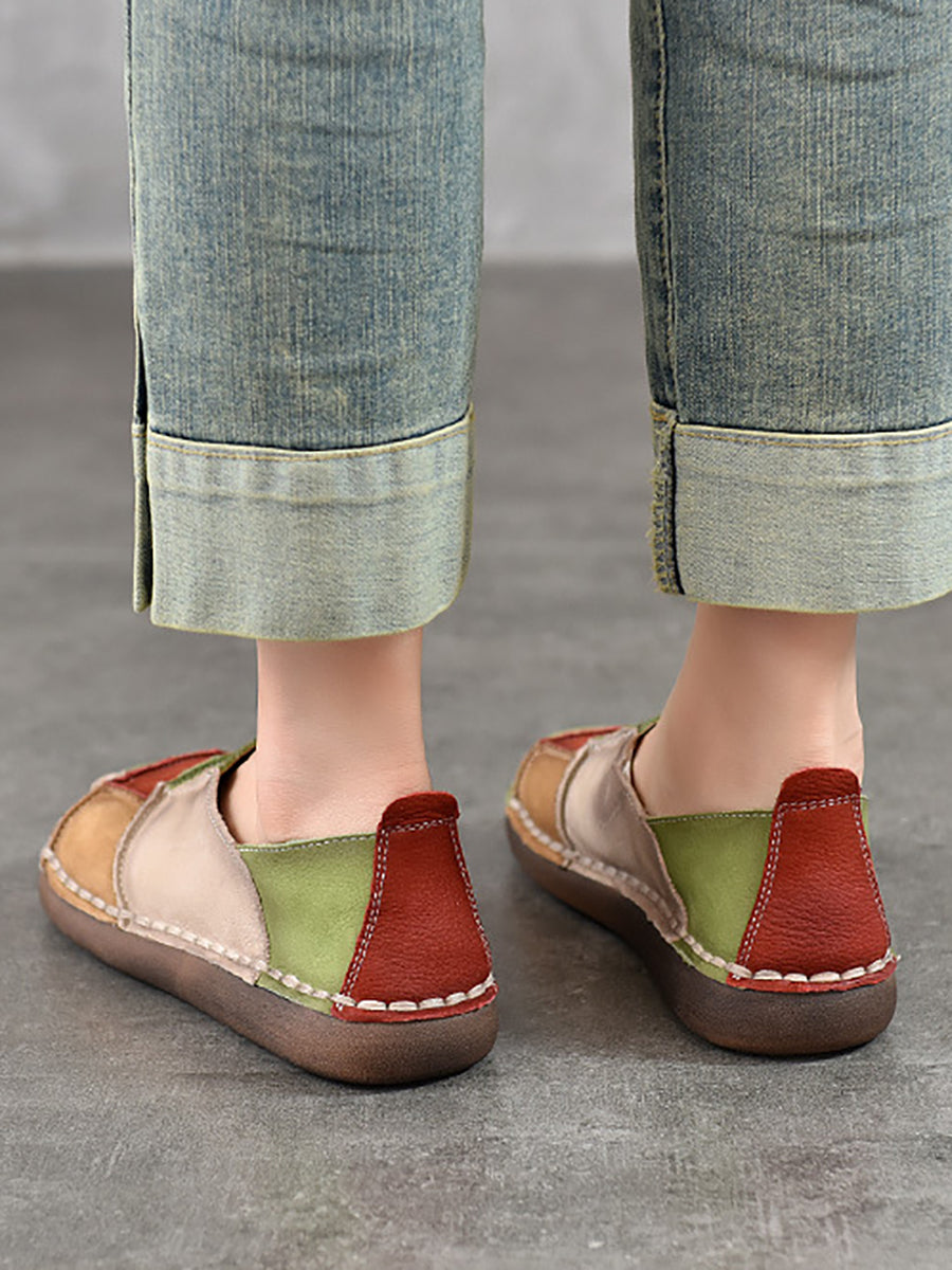 Women Spring Retro Colorblock Leather Flat Shoes