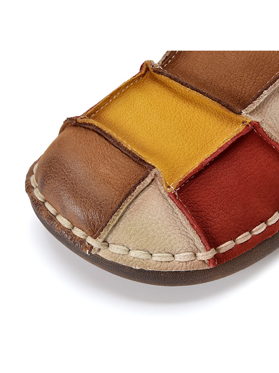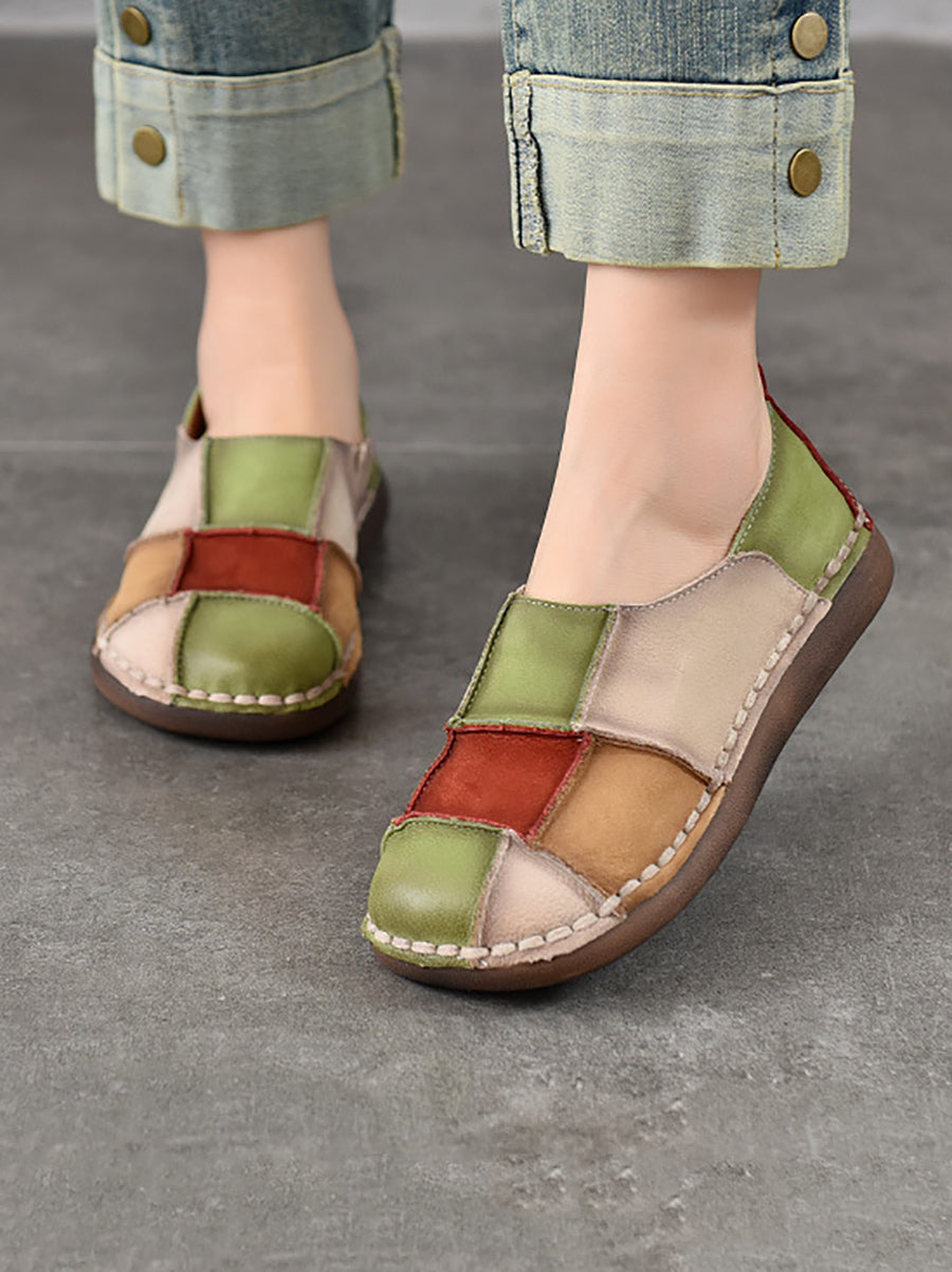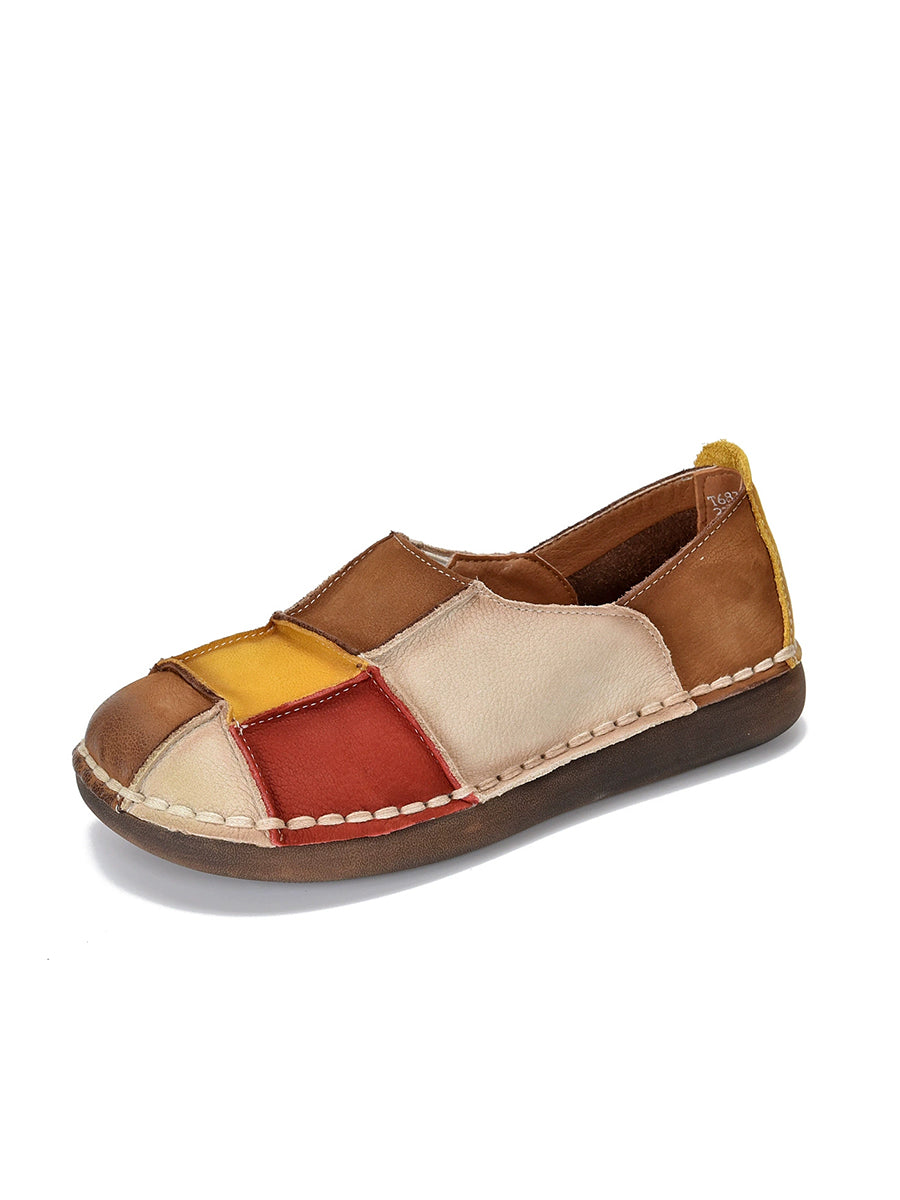 Women Spring Retro Colorblock Leather Flat Shoes