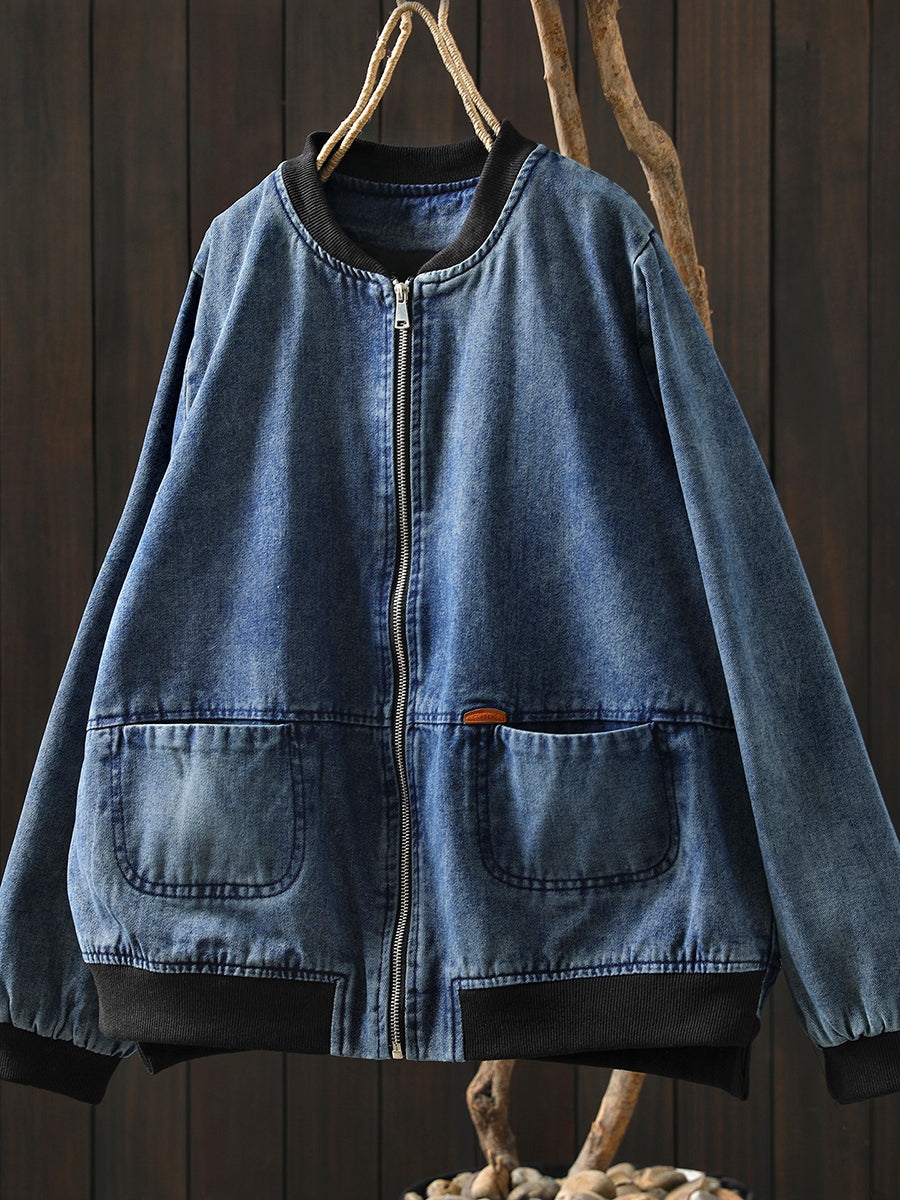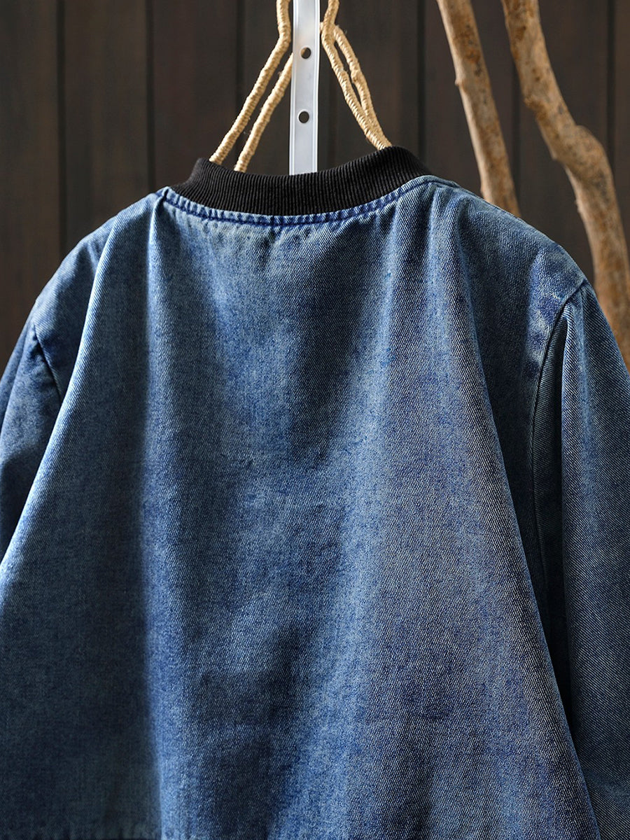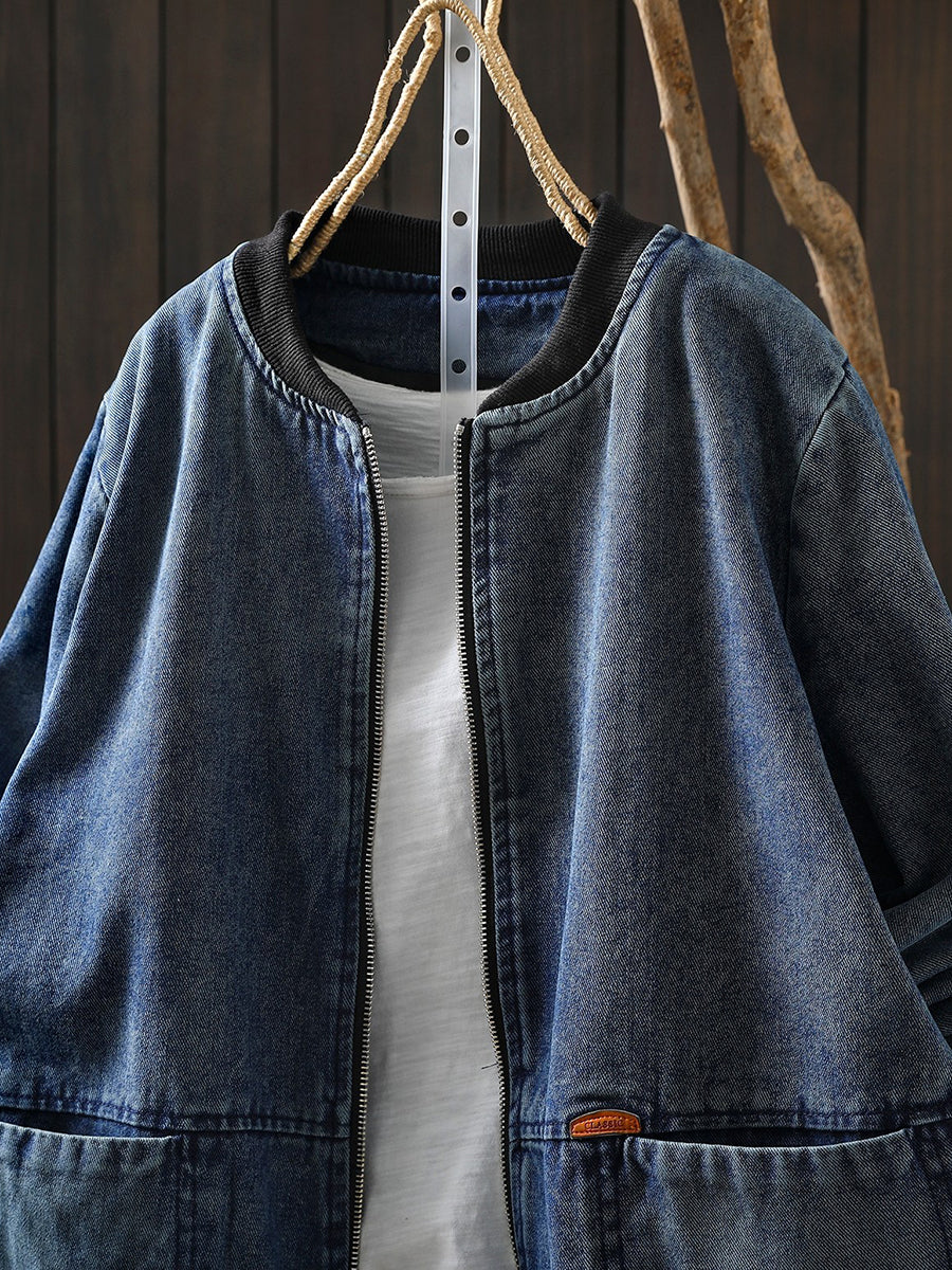 Women Spring Retro Denim Stand Collar Coat