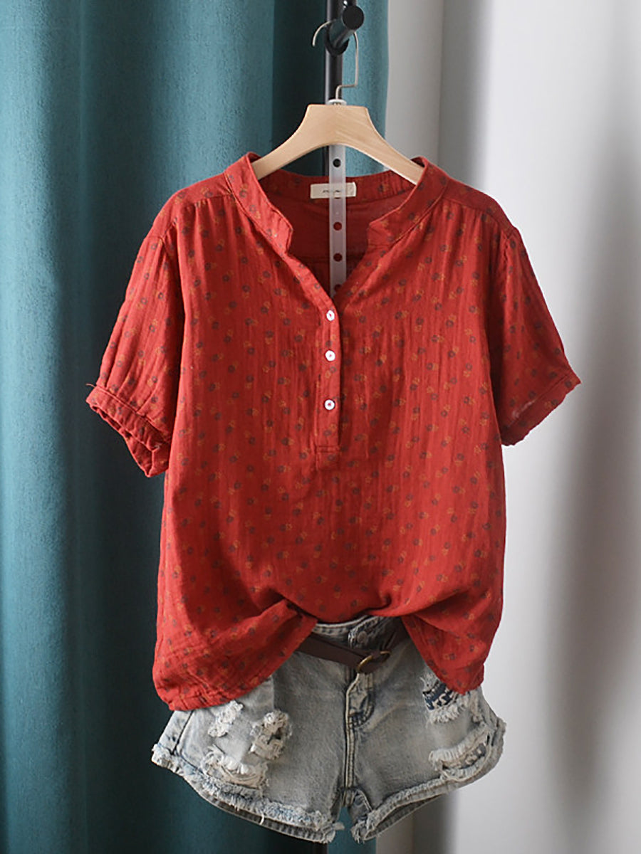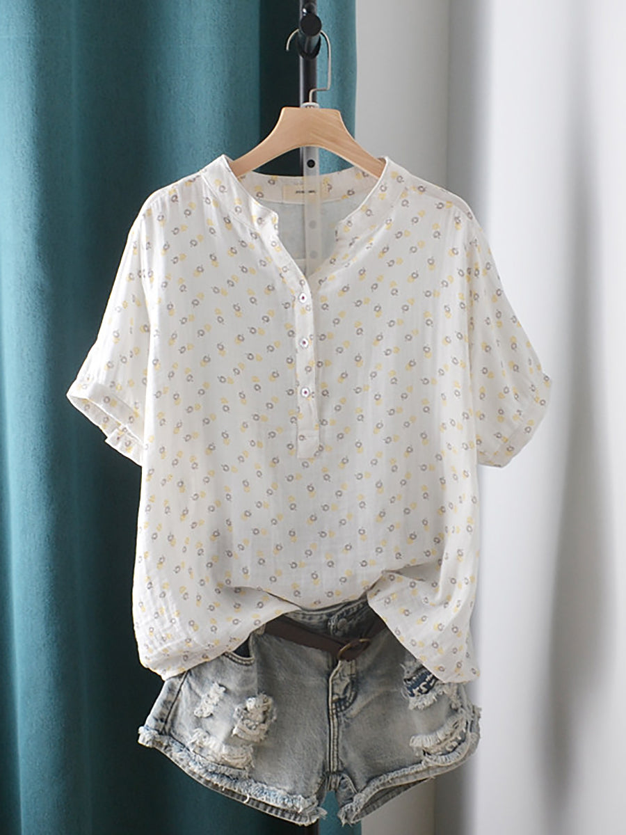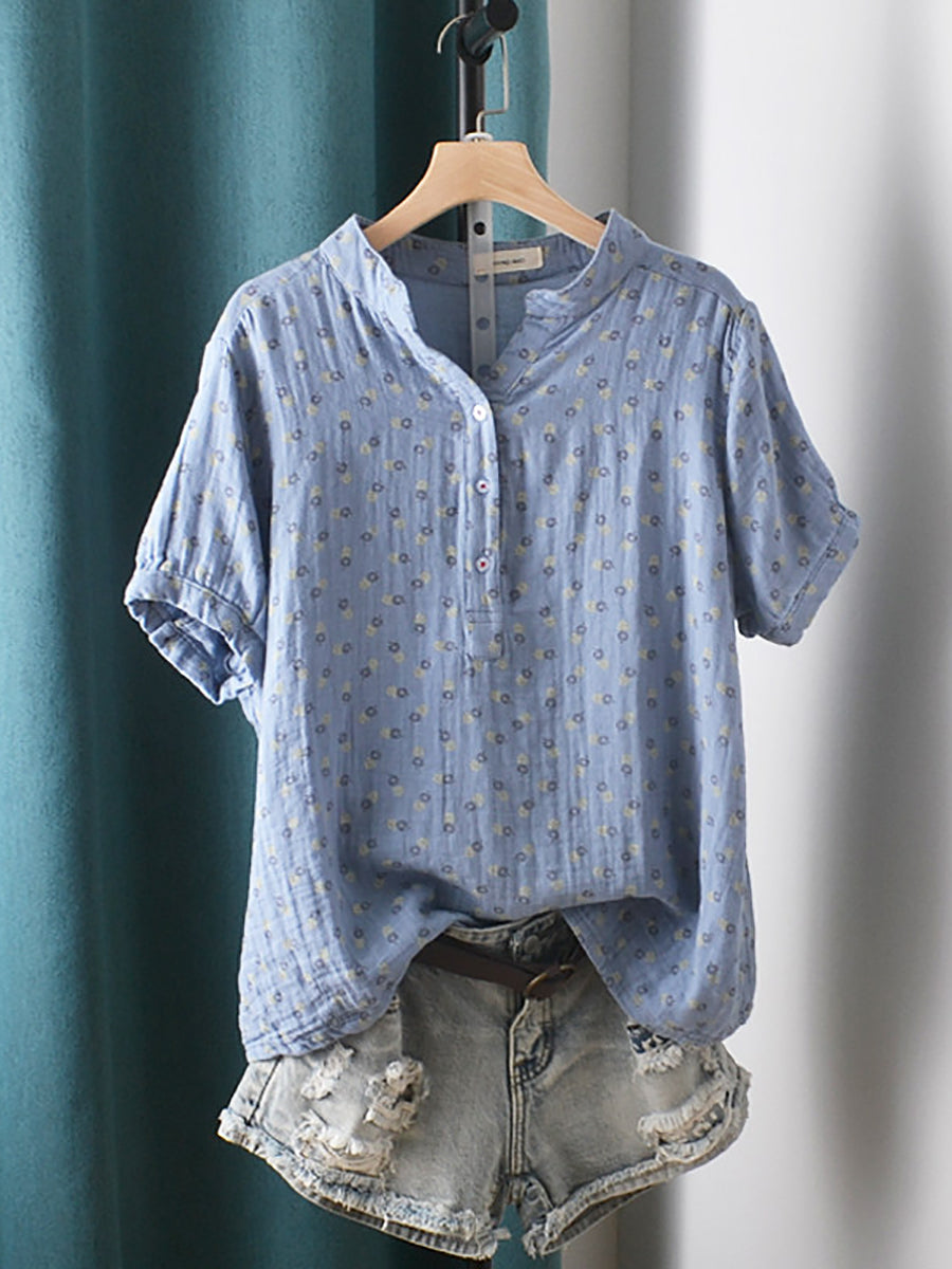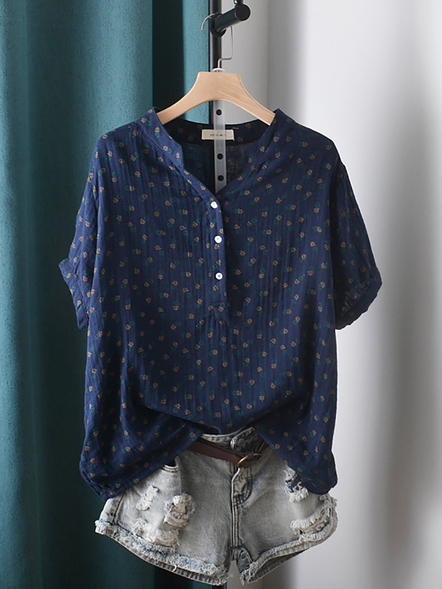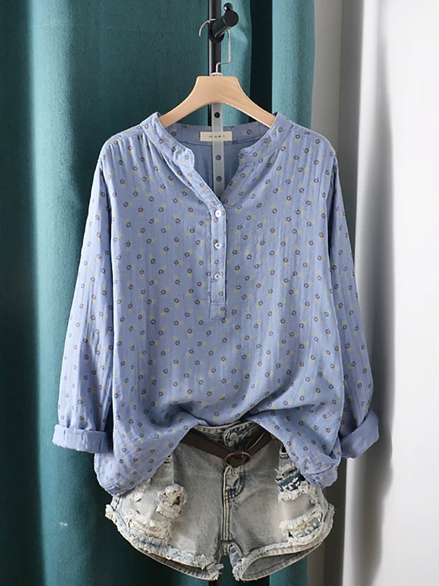 Women Summer Artsy Floral V-Neck 100%Cotton Shirt