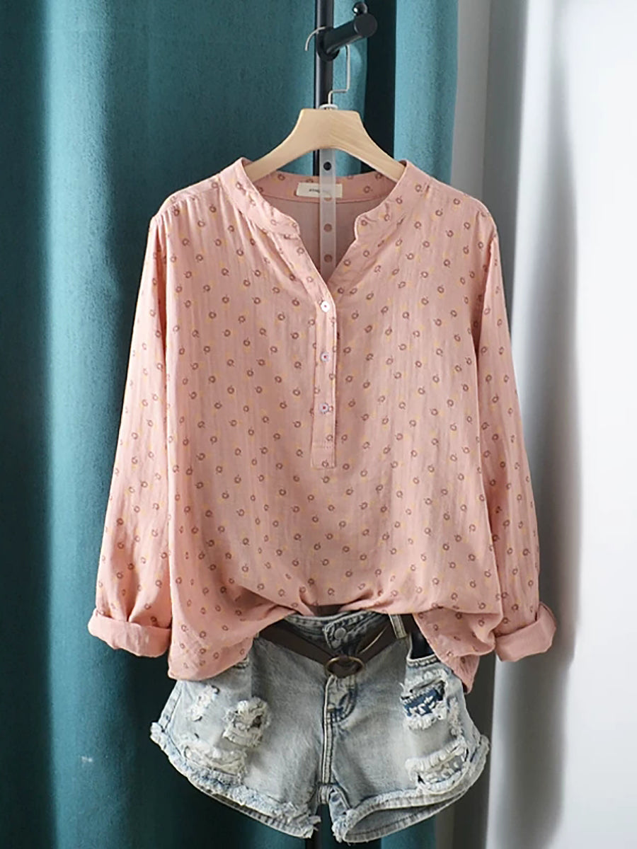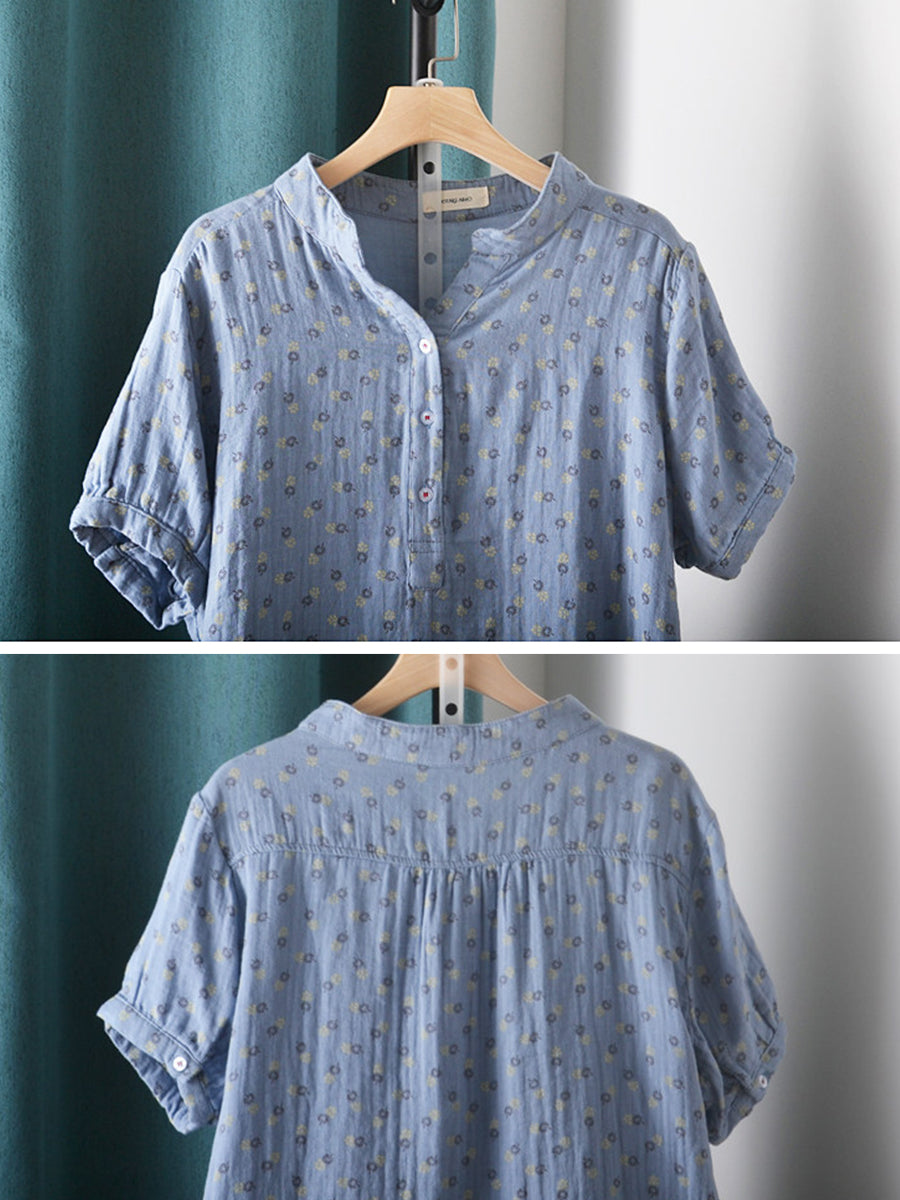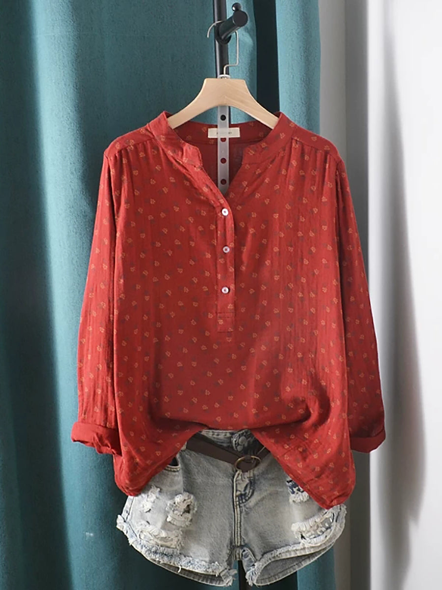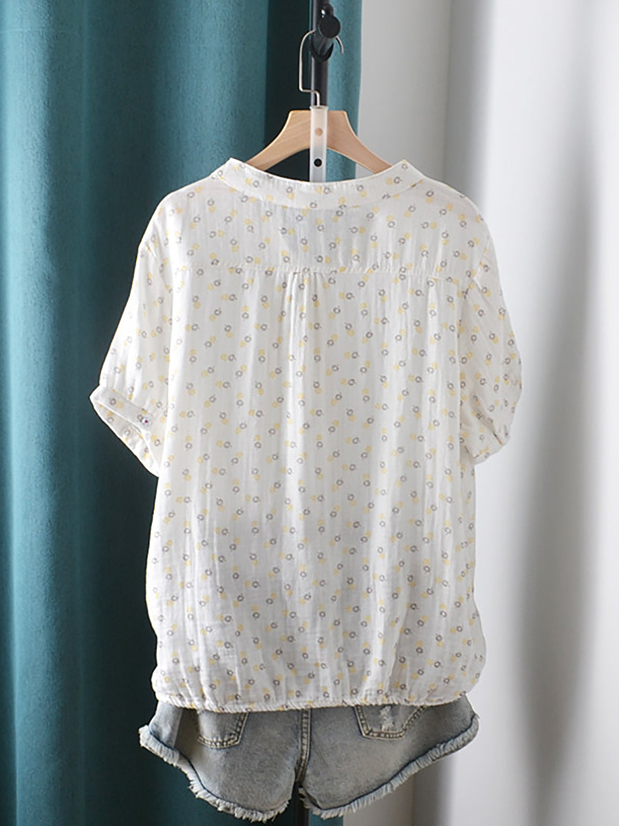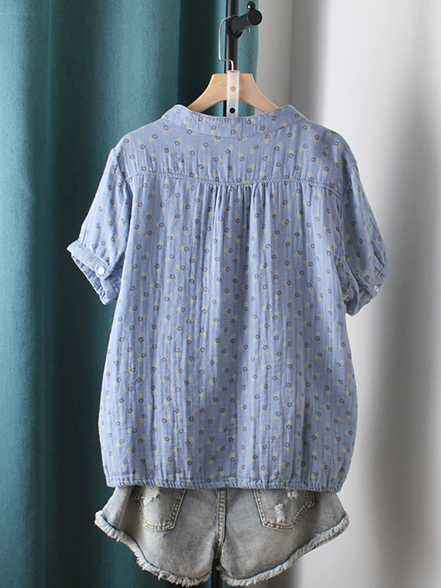 Women Summer Artsy Floral V-Neck 100%Cotton Shirt