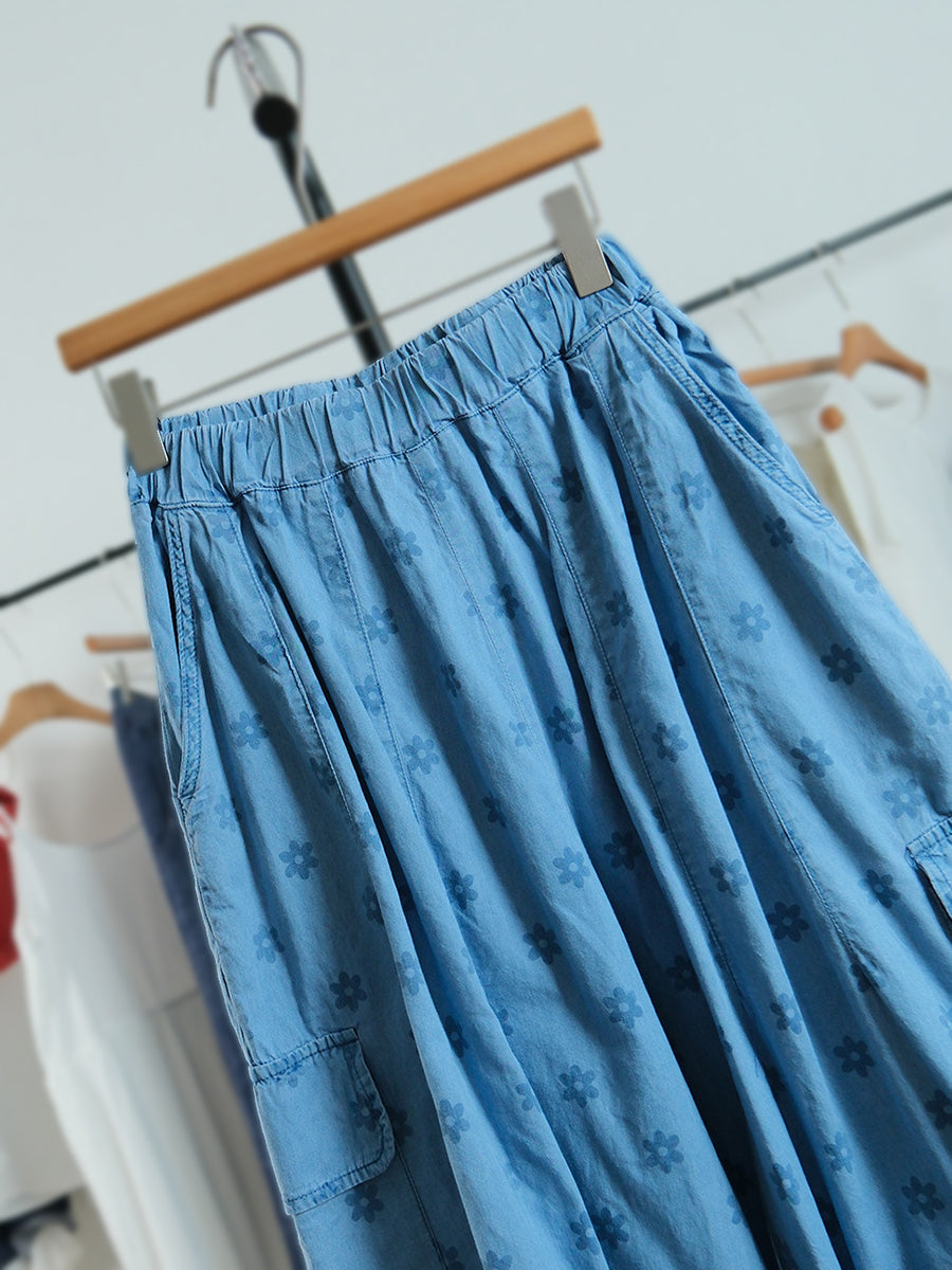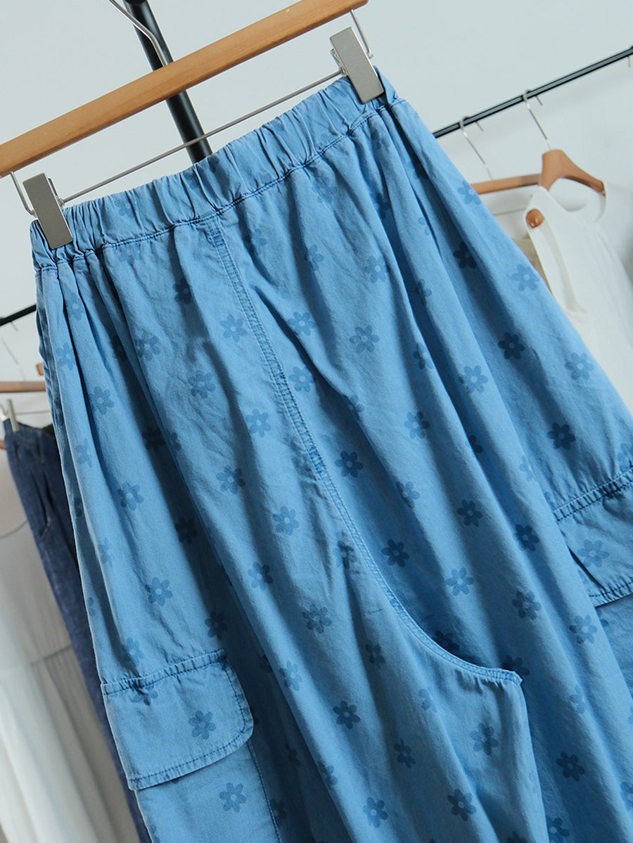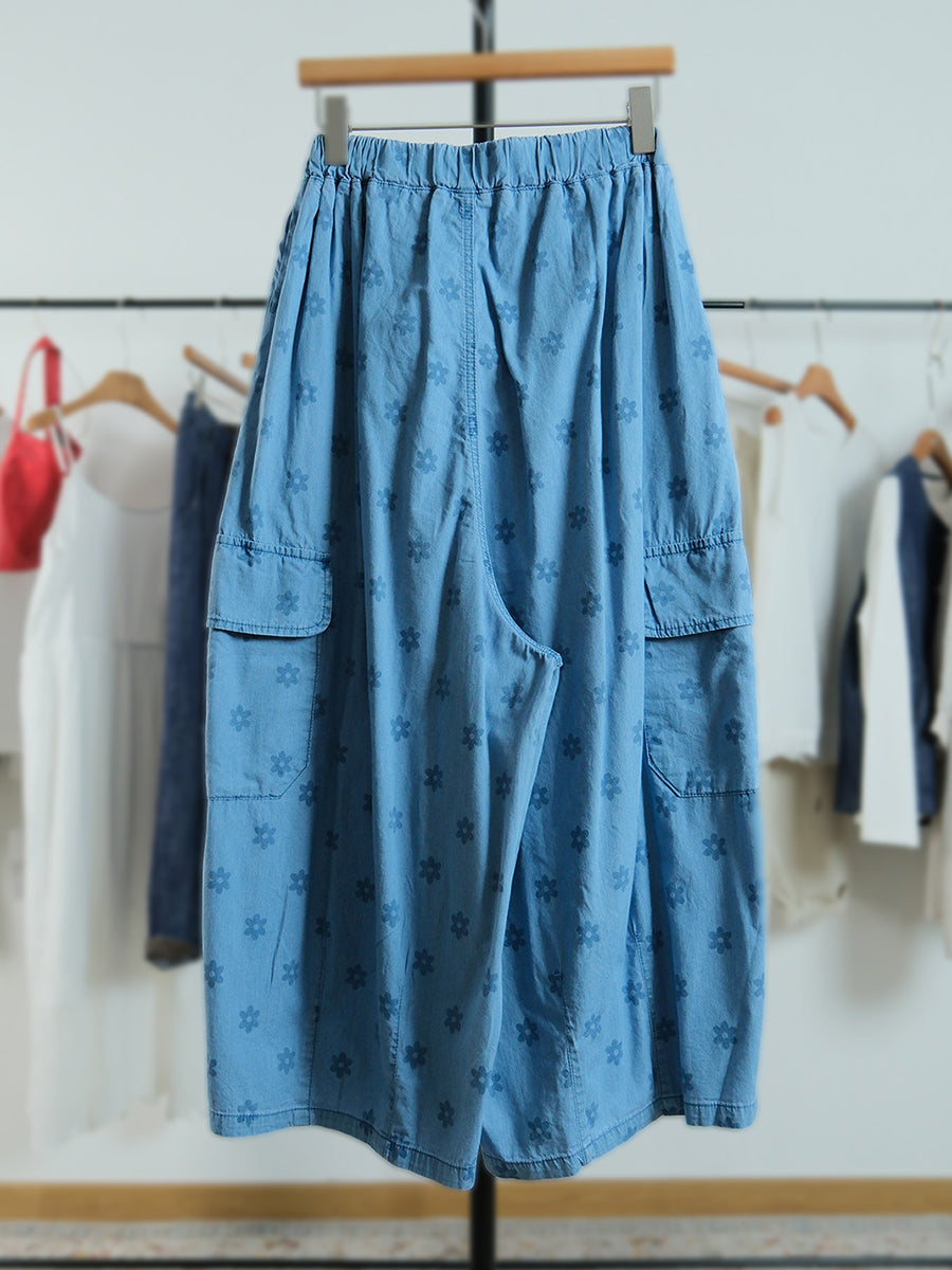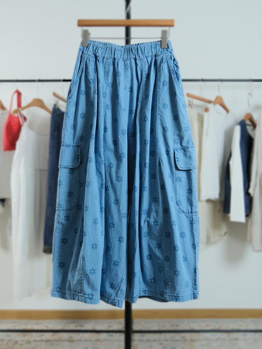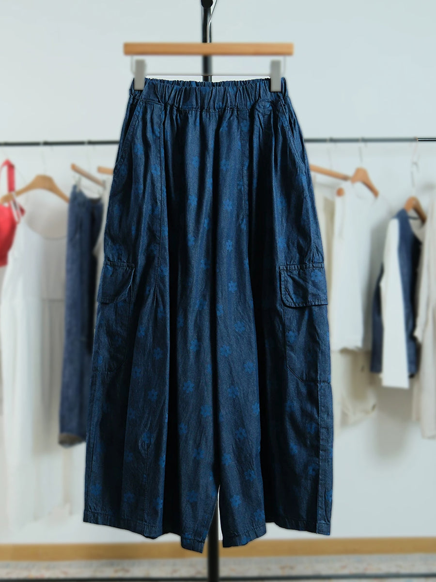 Women Summer Artsy Flower 100%Cotton Wide-leg Pants