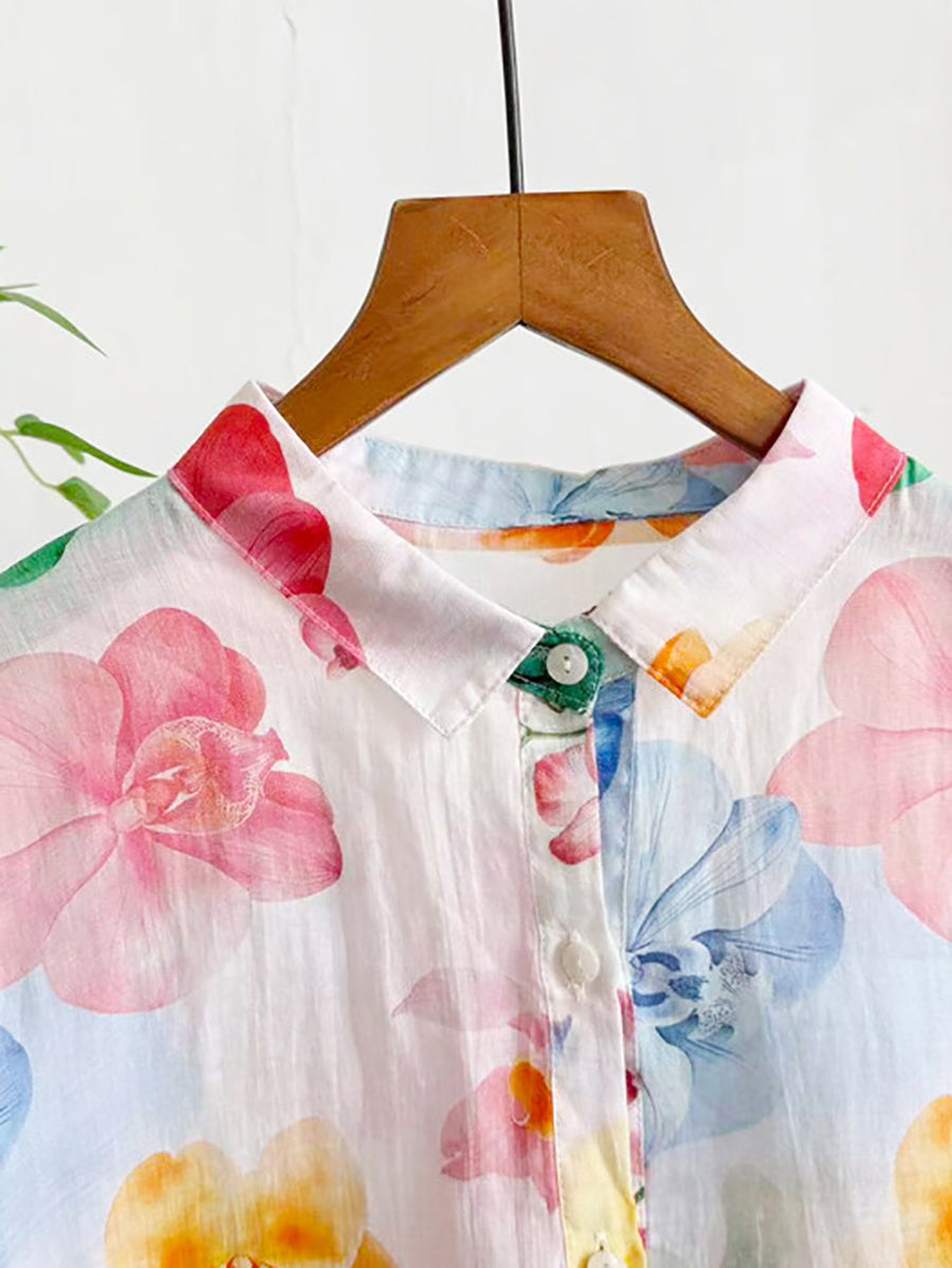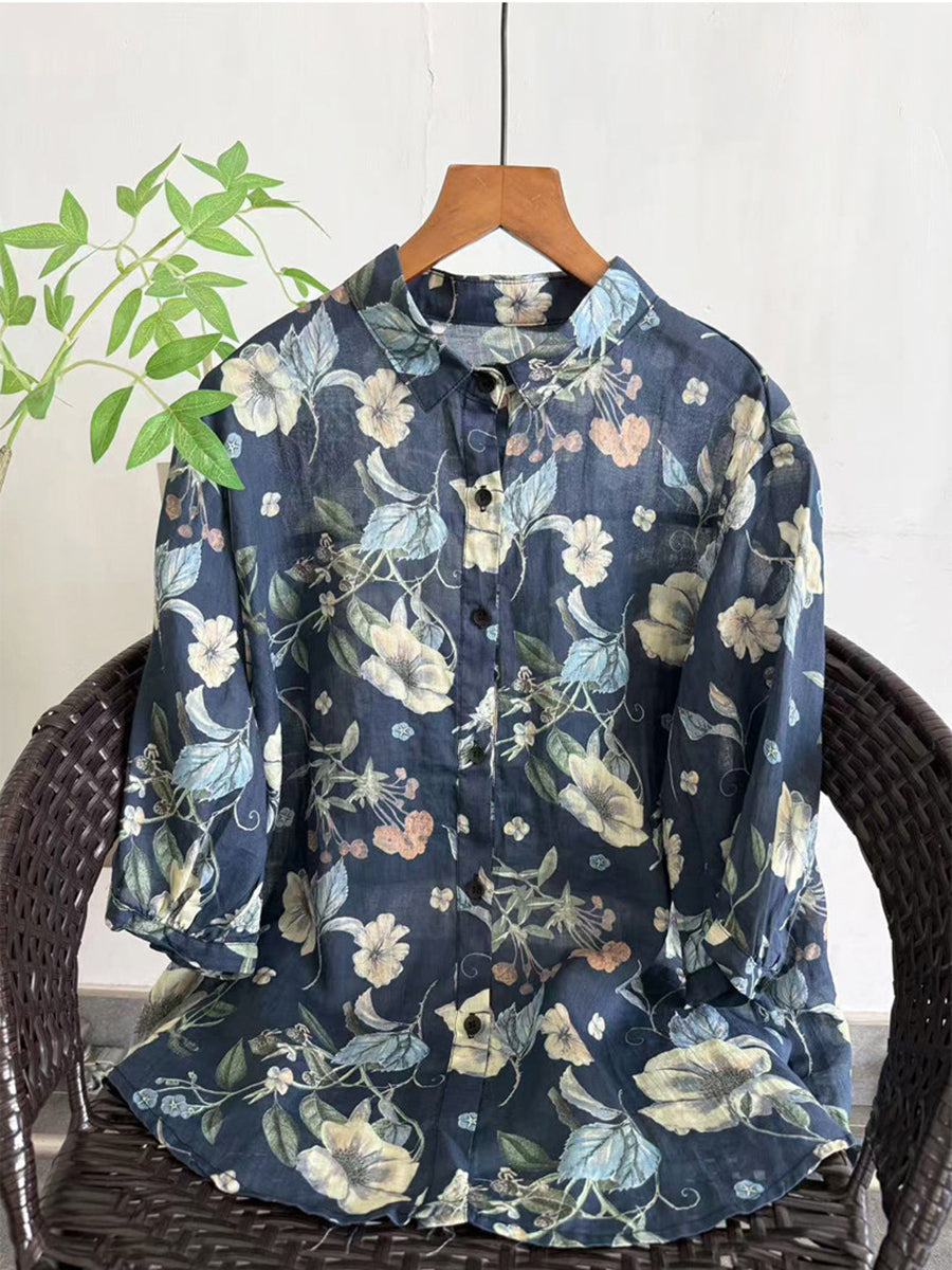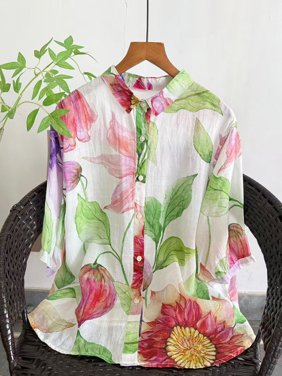 Women Summer Artsy Flower 100%Ramie Blouse