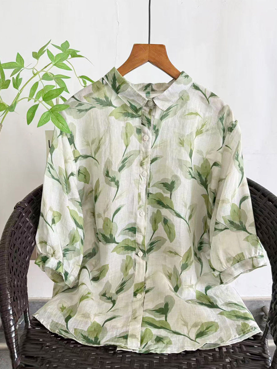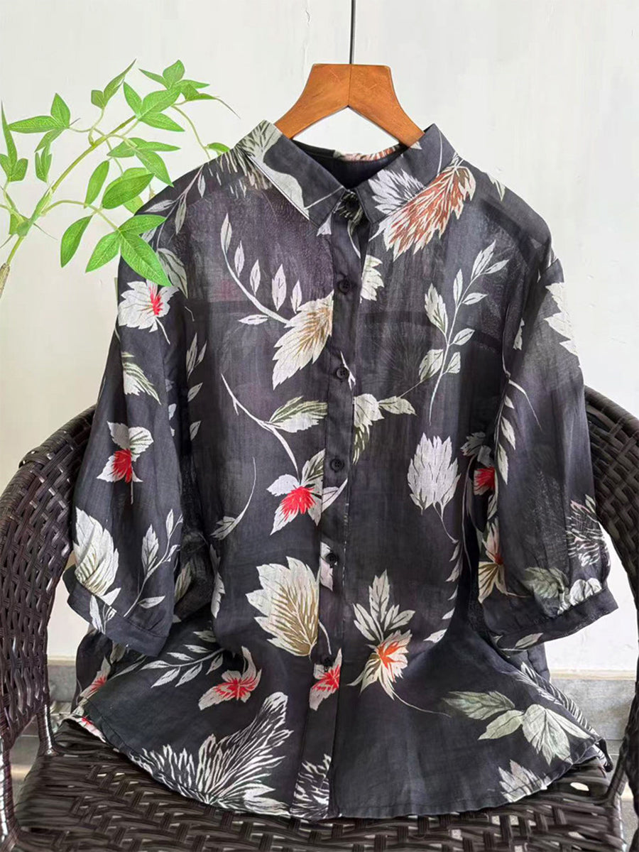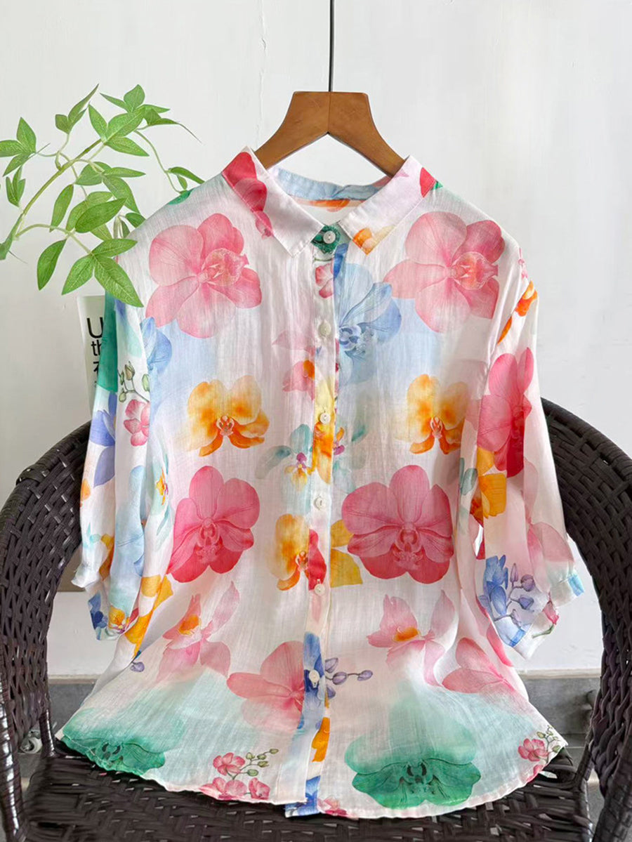 Women Summer Artsy Flower 100%Ramie Blouse