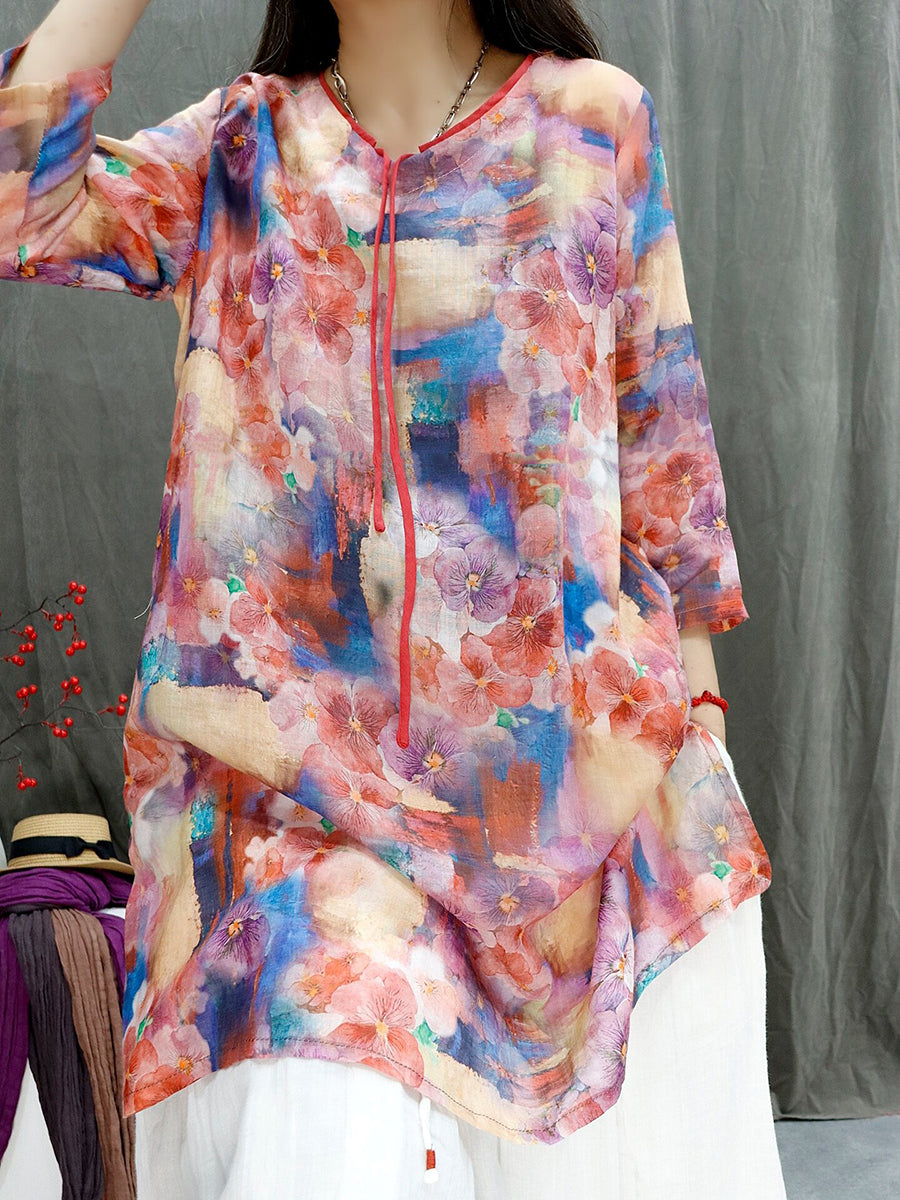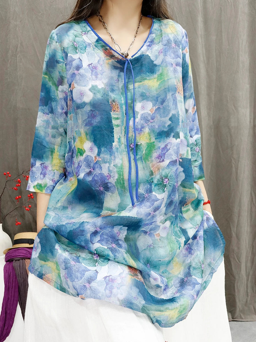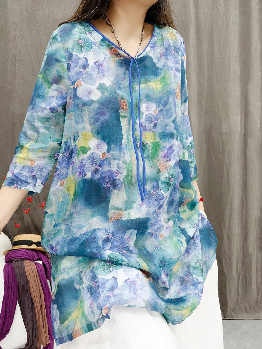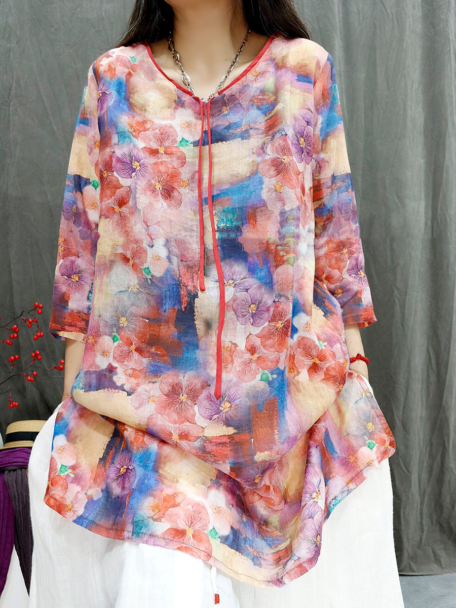 Women Summer Artsy Flower 100%Ramie V-Neck Blouse