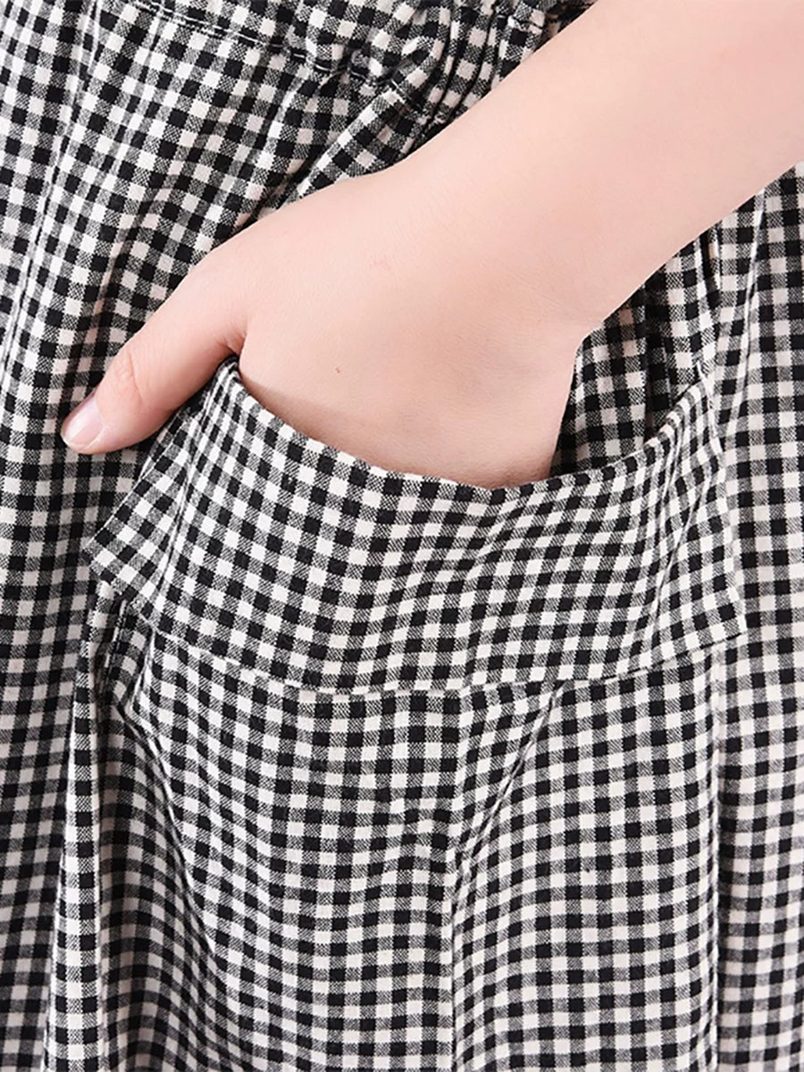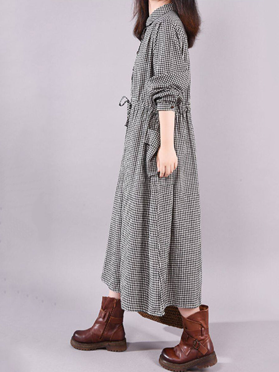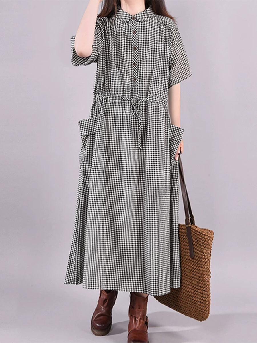 Women Summer Artsy Plaid Turn-down Collar Dress