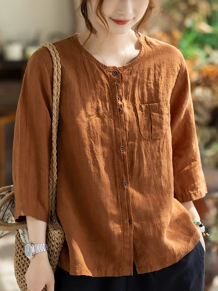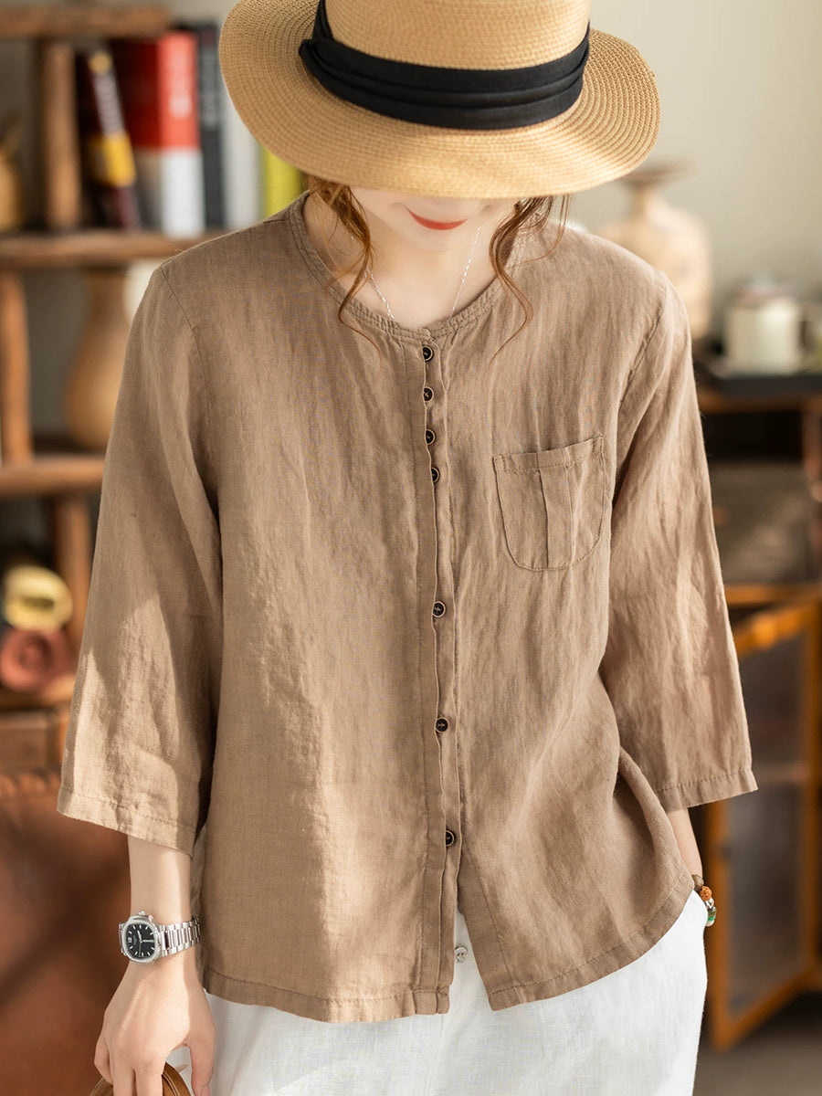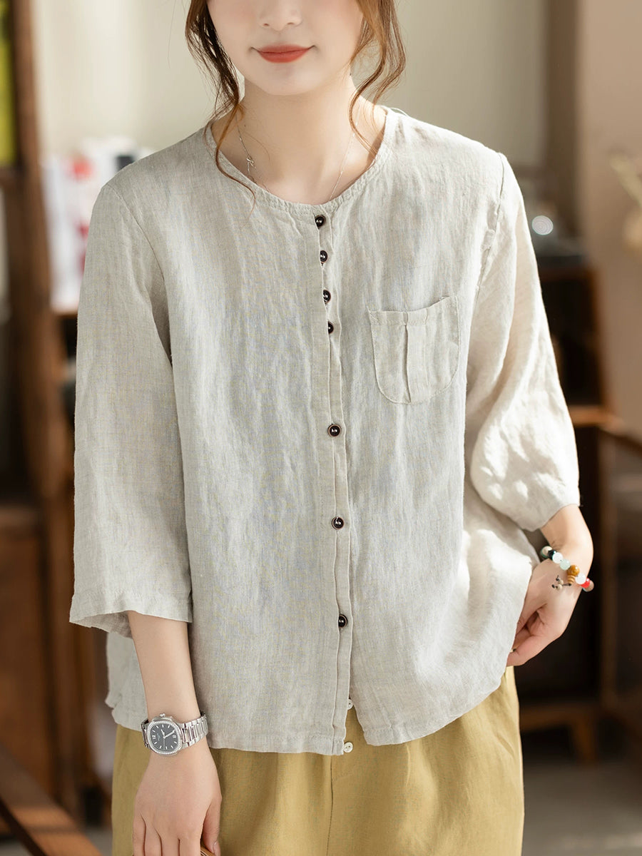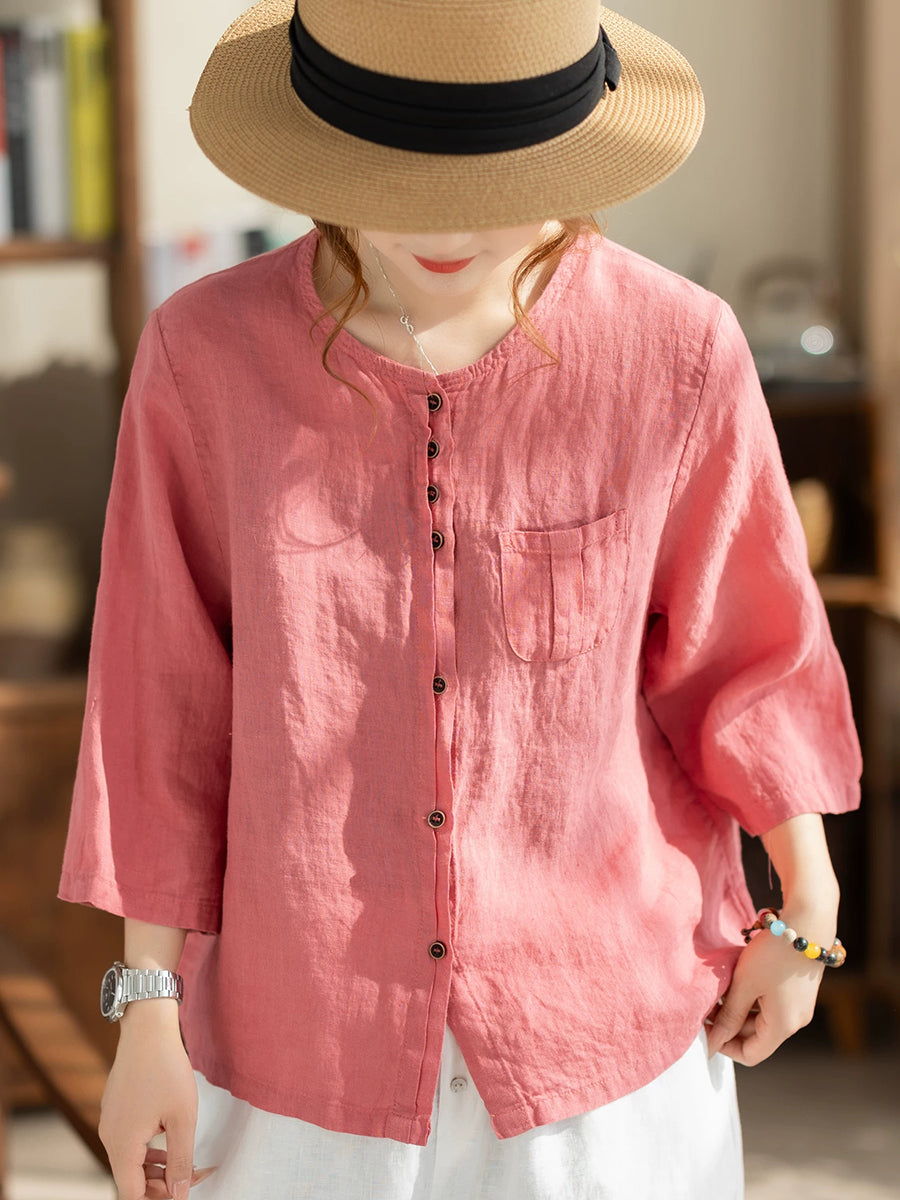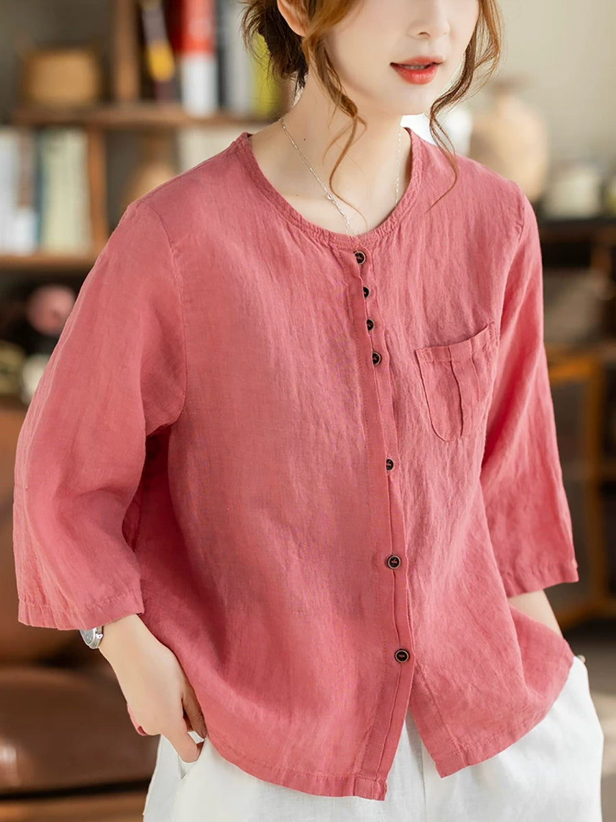 Women Summer Casual Pure Color O-Neck 100%Linen Shirt