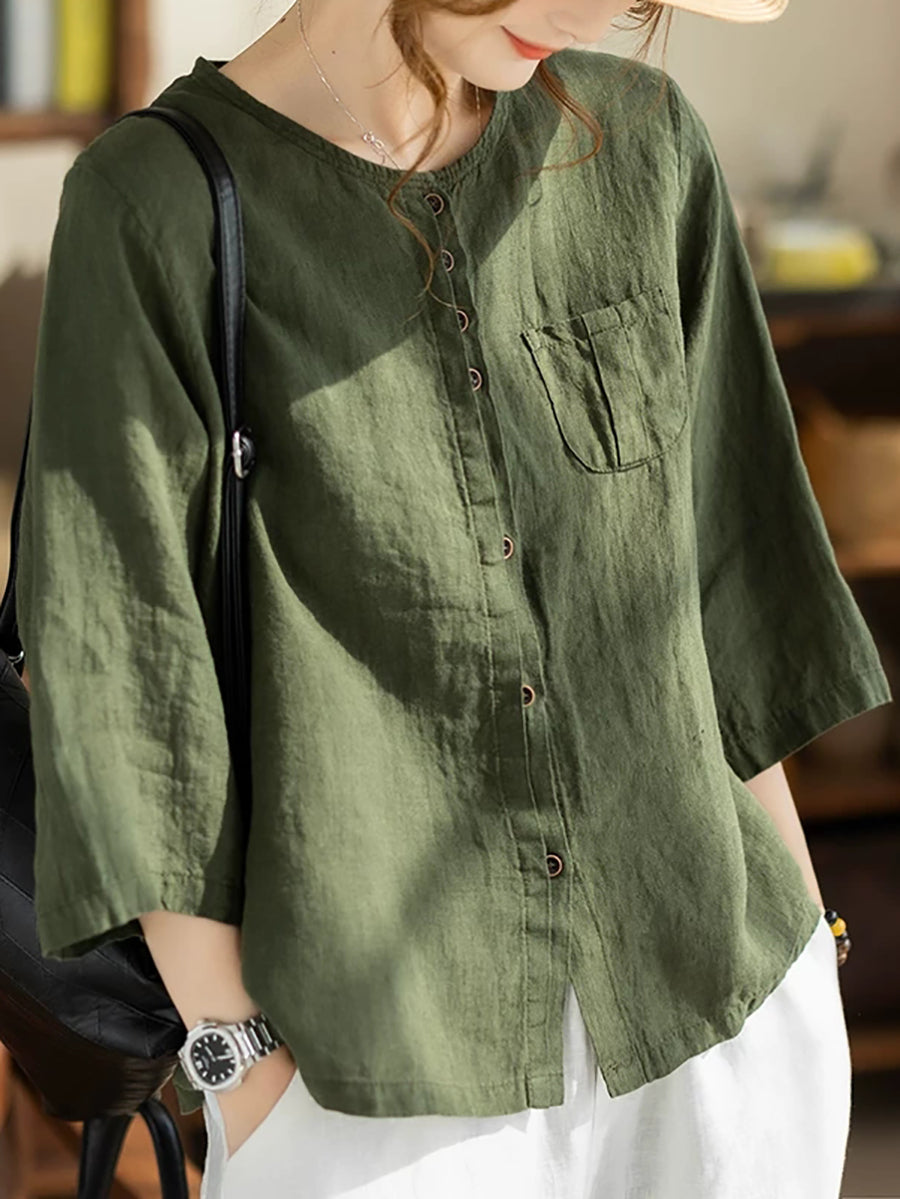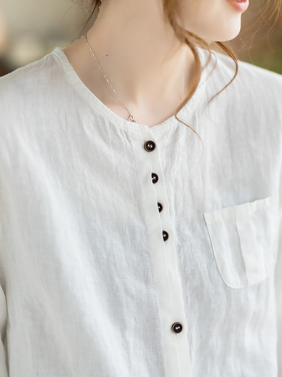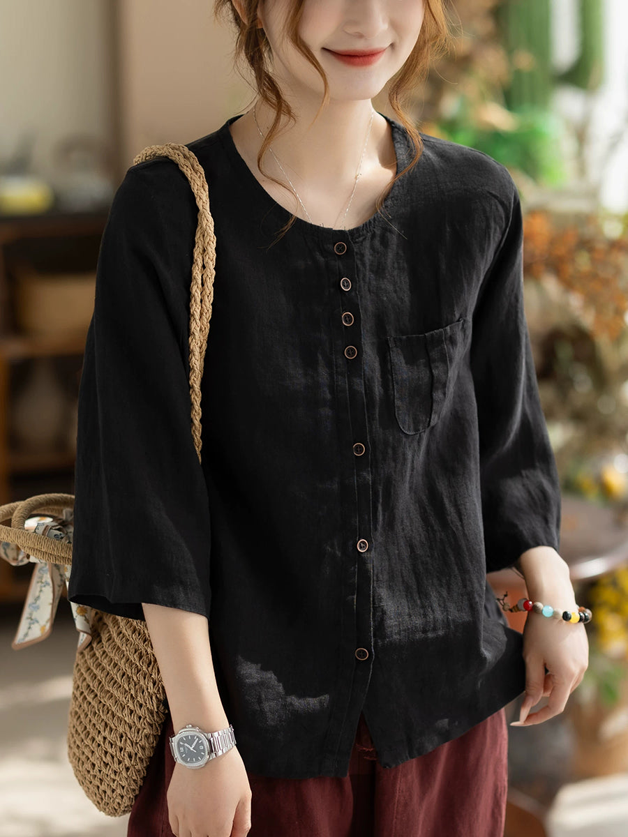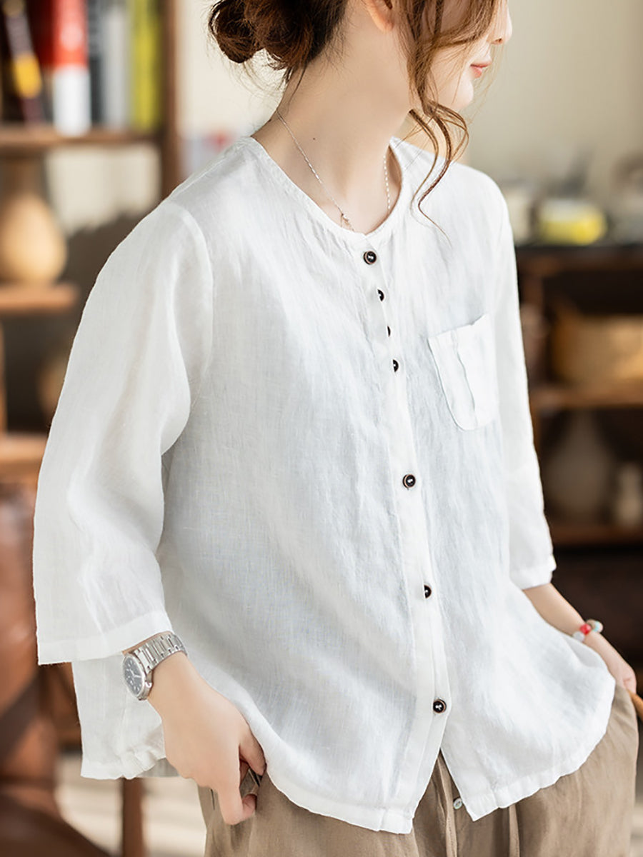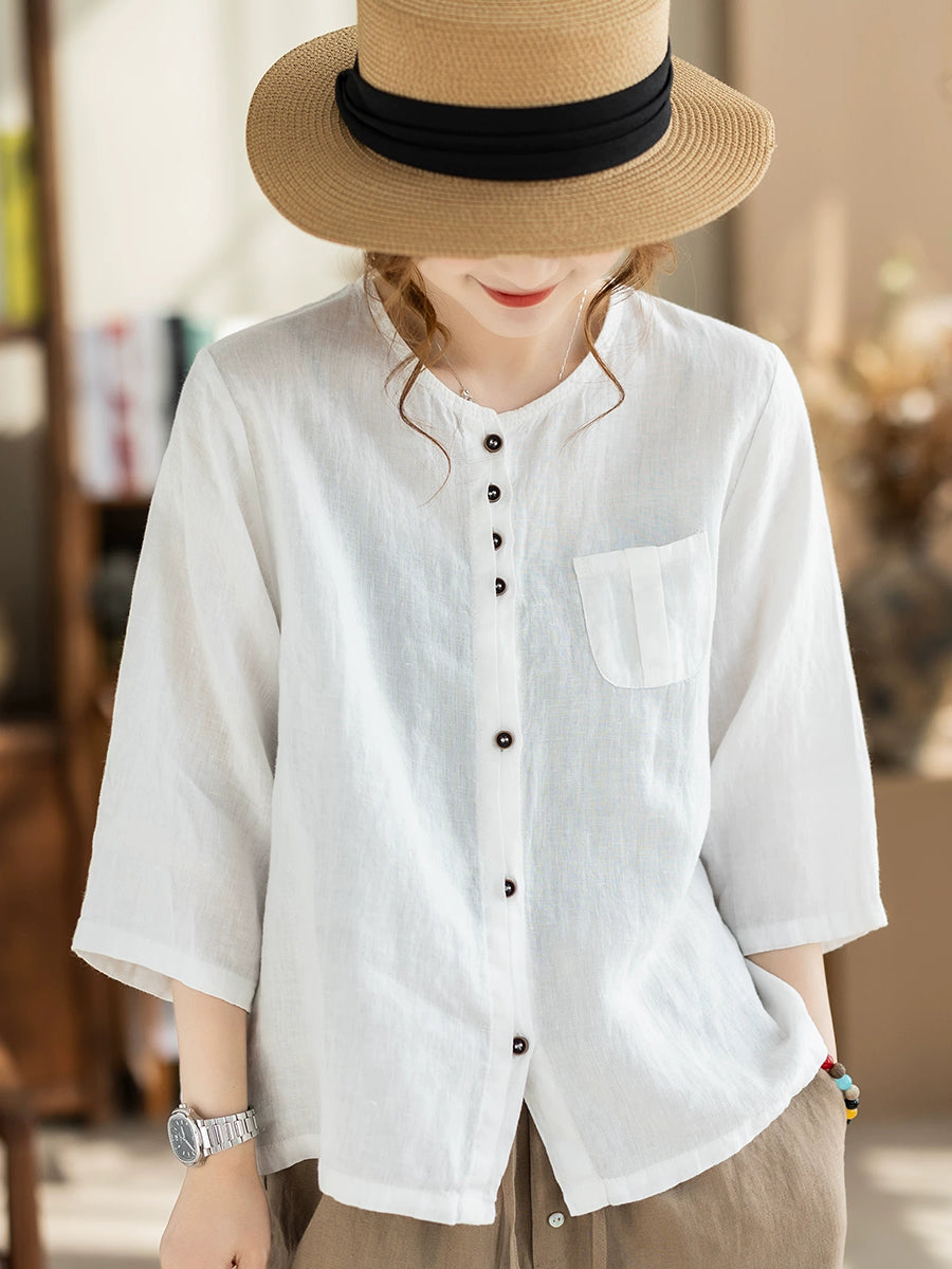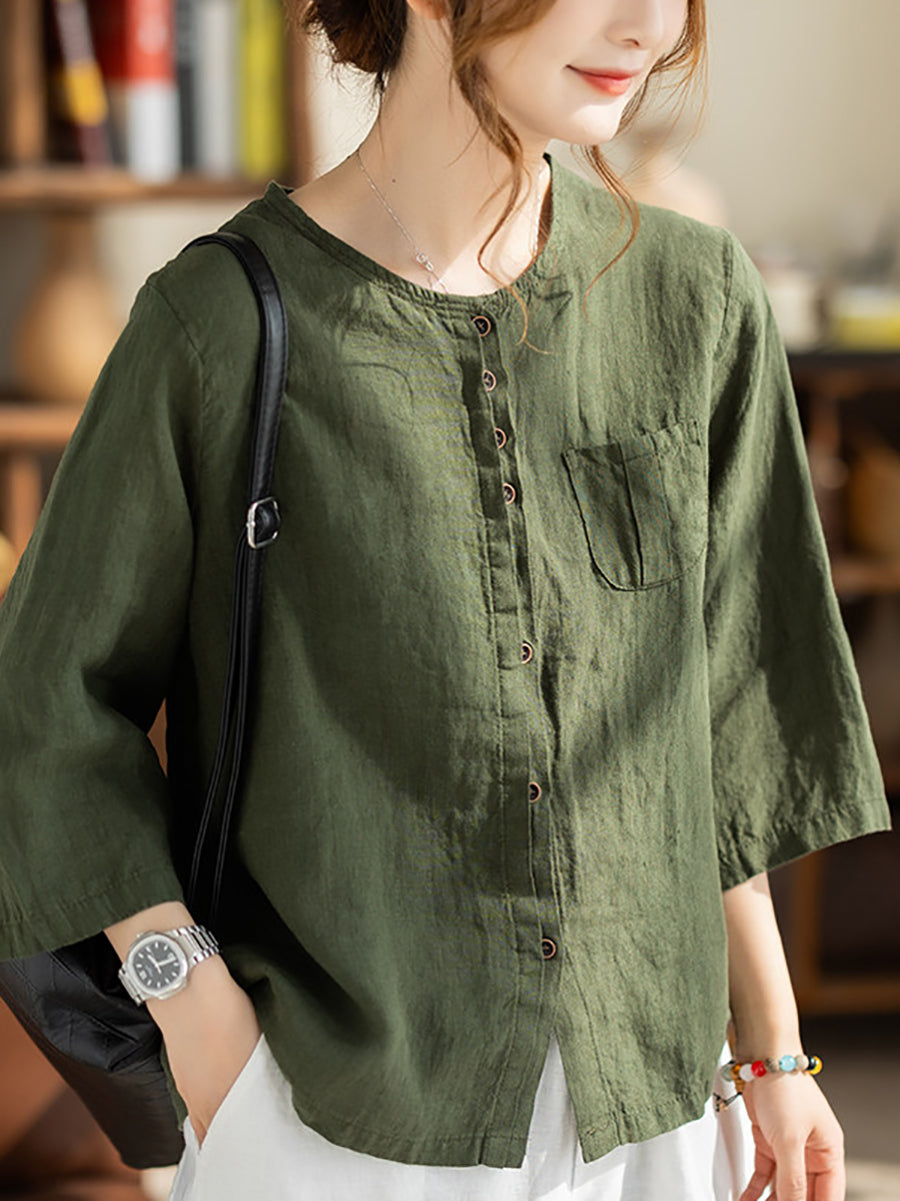Women Summer Casual Pure Color O-Neck 100%Linen Shirt