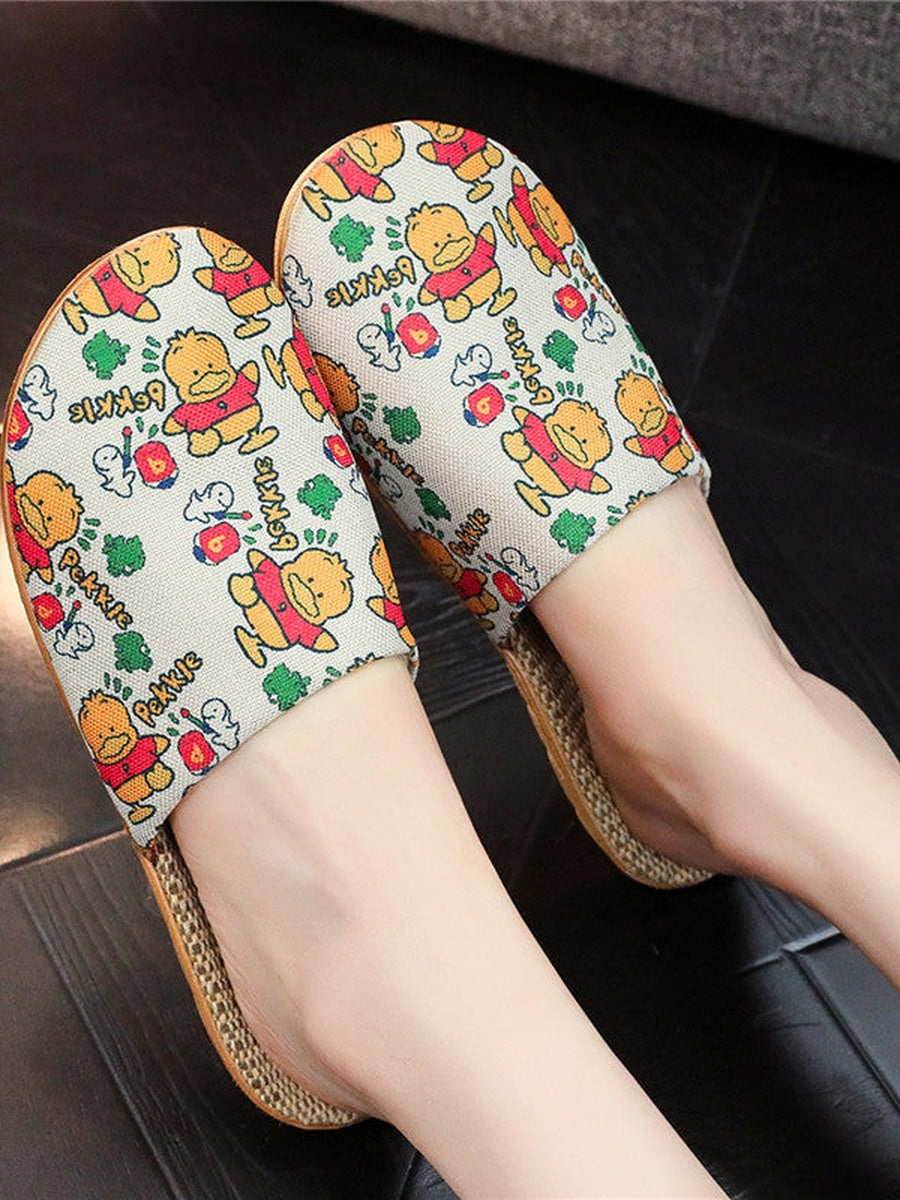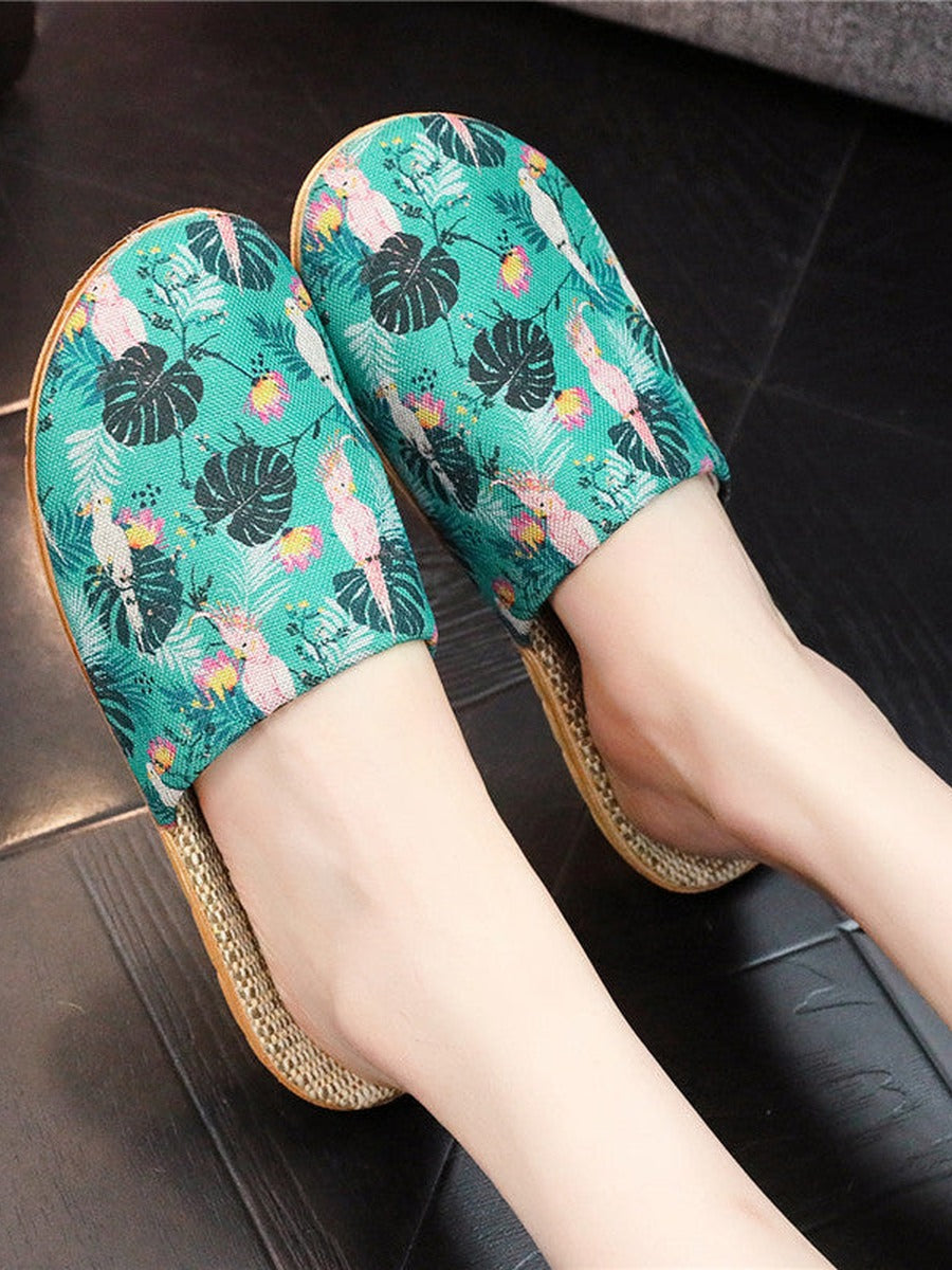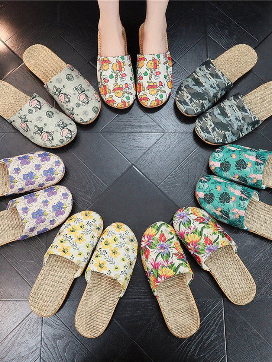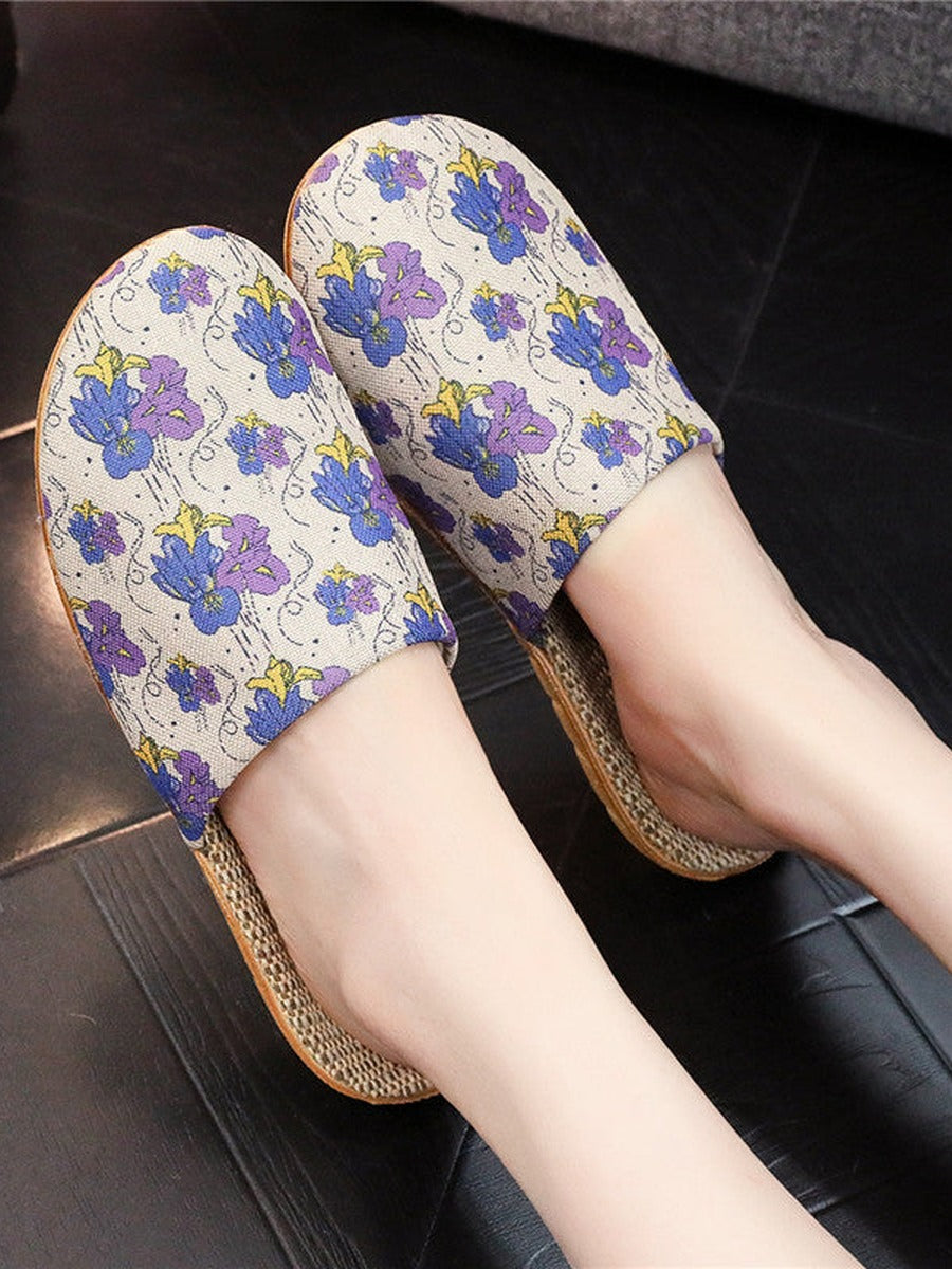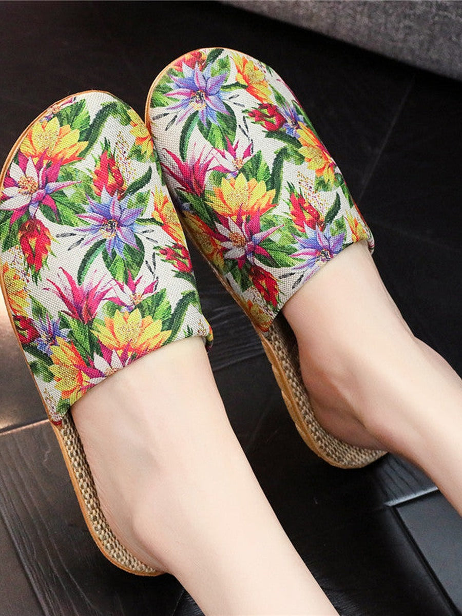 Women Summer Floral Printed Linen Thick Sole Slippers