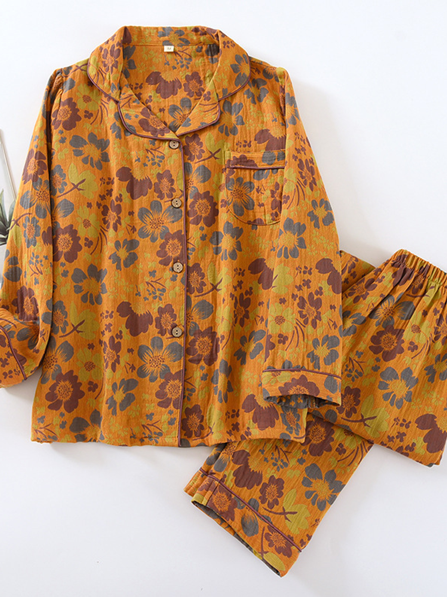 The Women’s Summer Floral Homewear Pajama Set is crafted from soft jacquard double-layer gauze for comfort. This stylish set features a V-neck, floral pattern, long sleeves, and an elastic waistband, with full-length pants perfect for lounging at home.