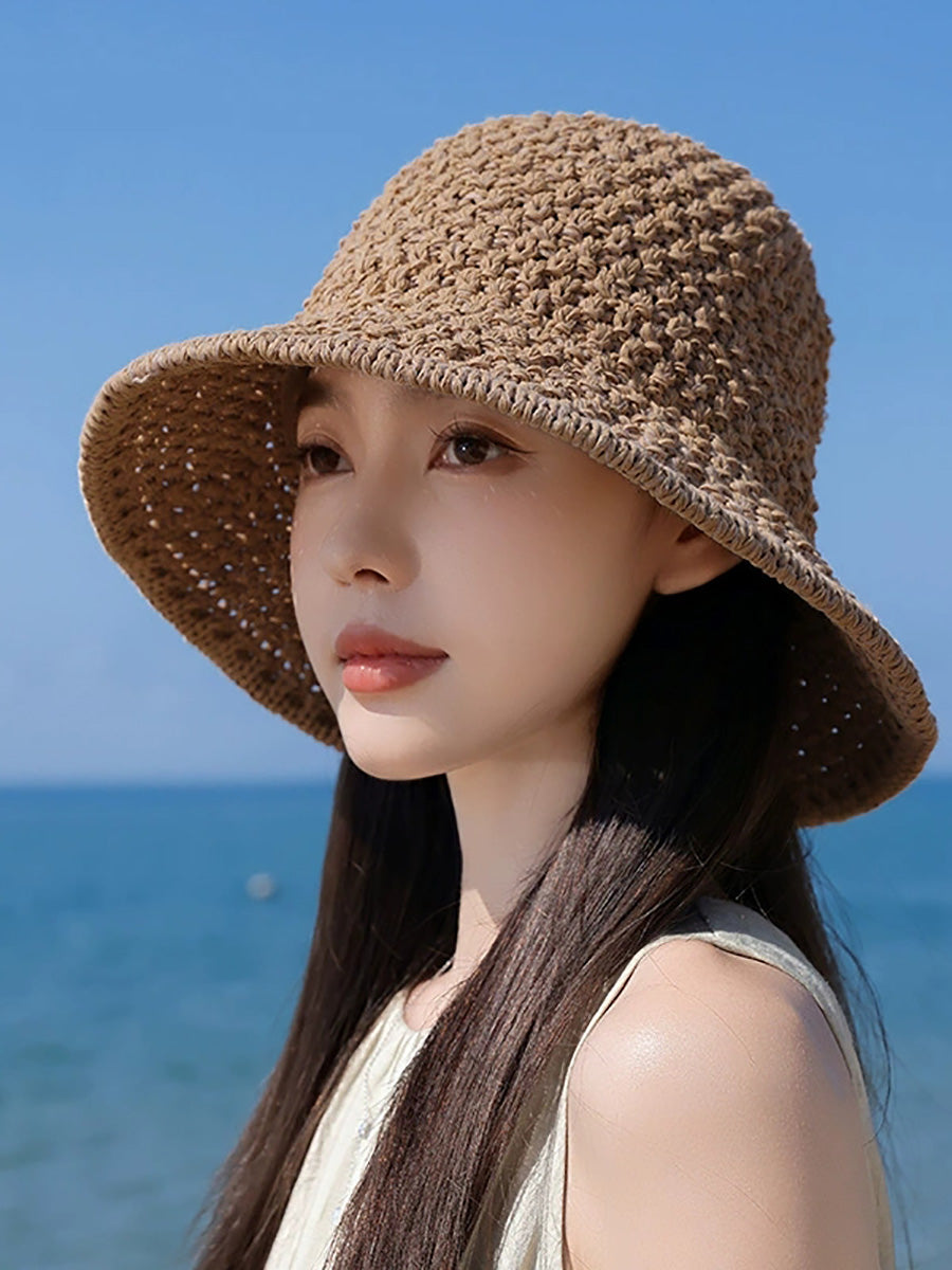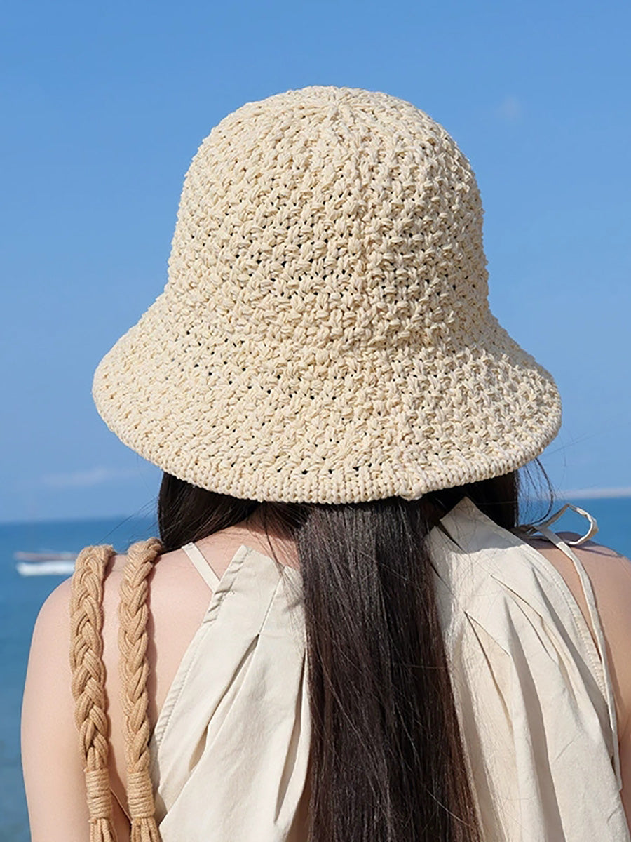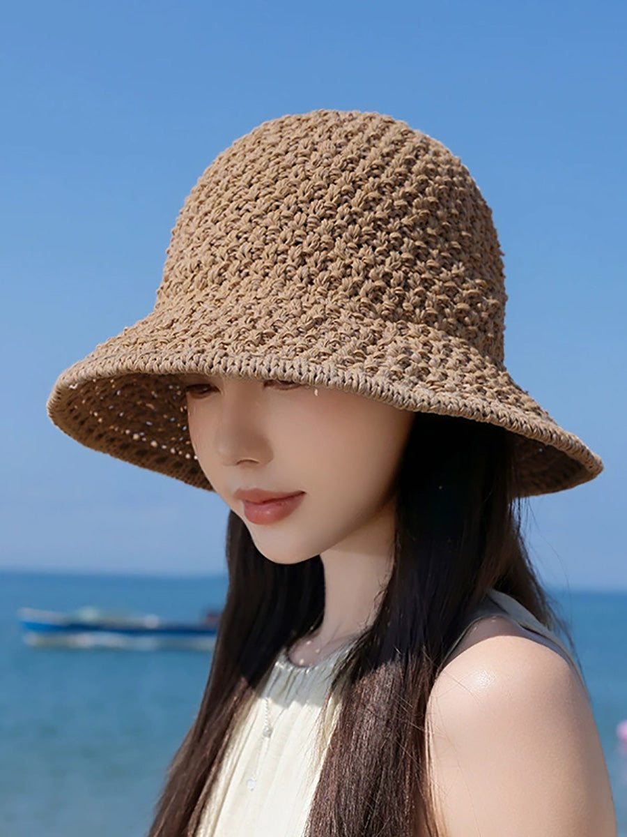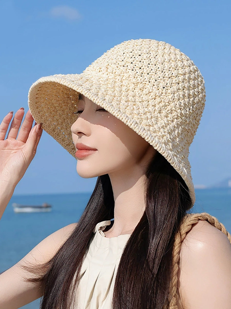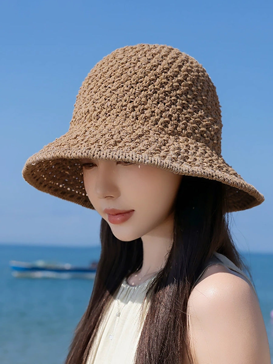 Women Summer Pure Color Weave Bucket Hat