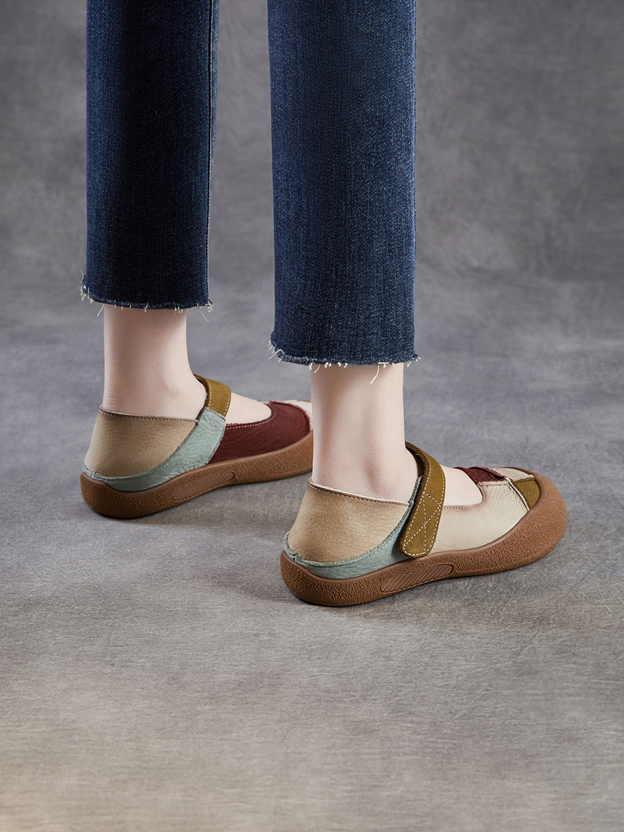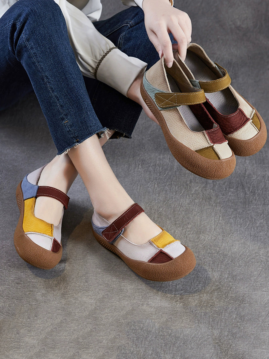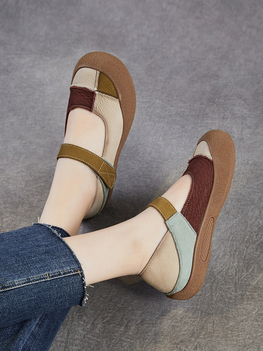 Women Summer Retro Genuine Leather Colorblock Shoes
