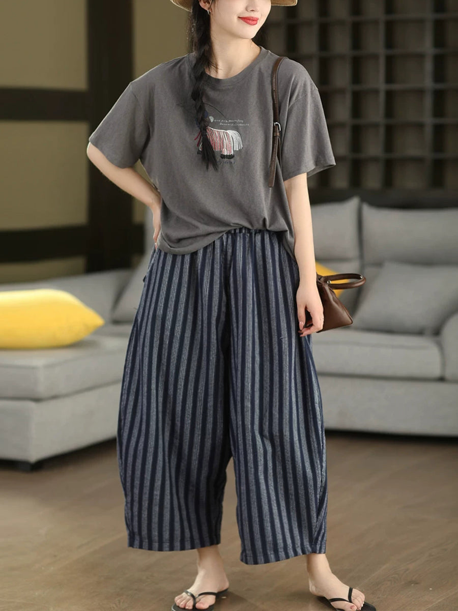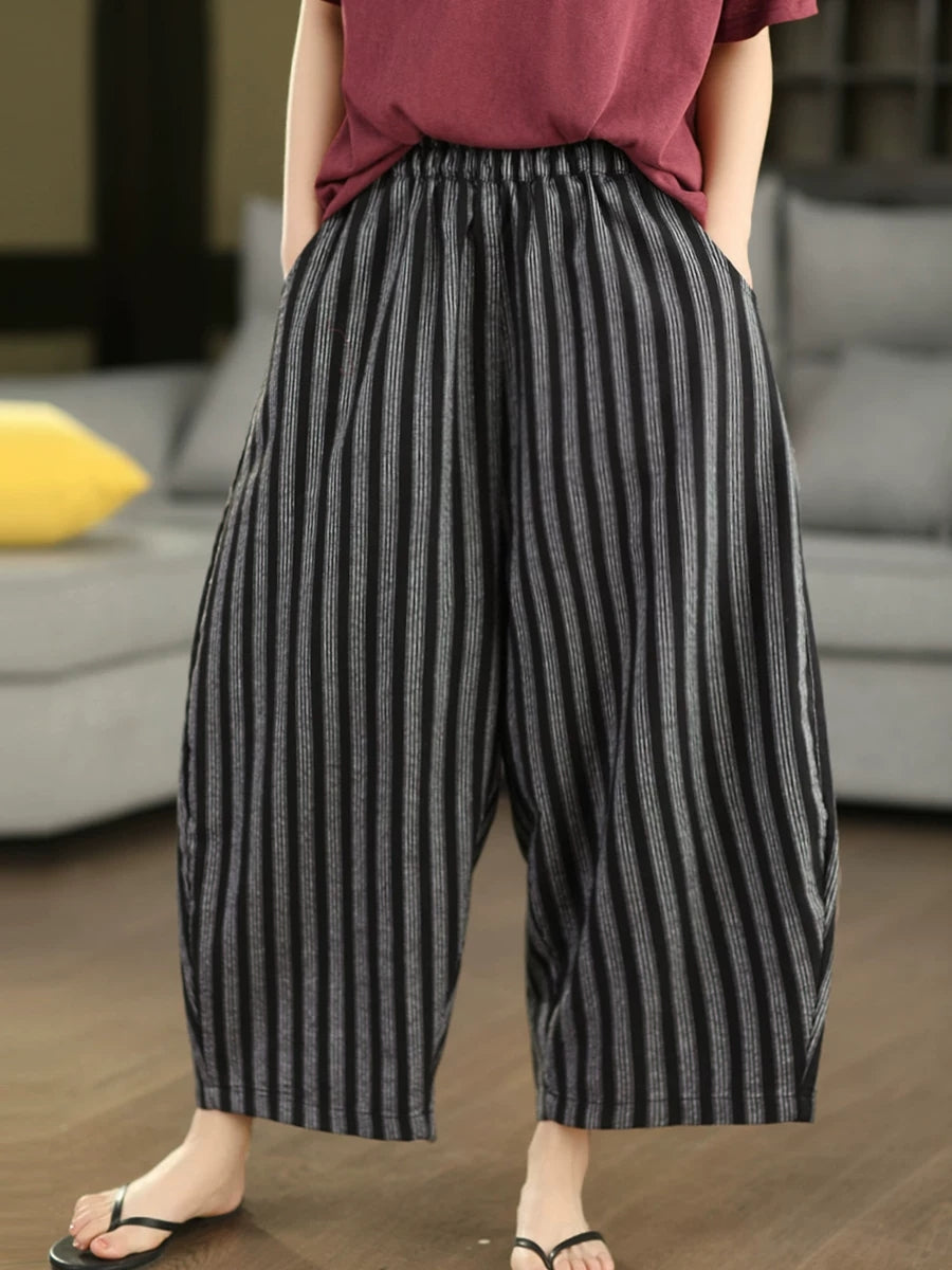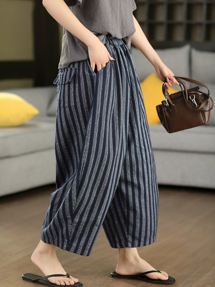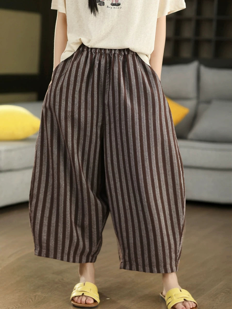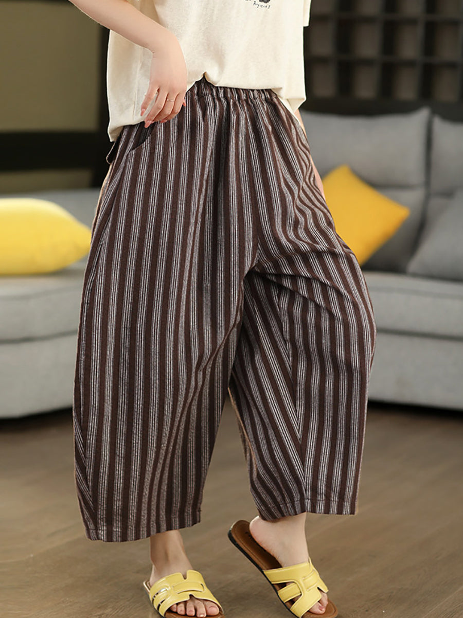 Women Summer Retro Stripe 100%Linen Harem Pants