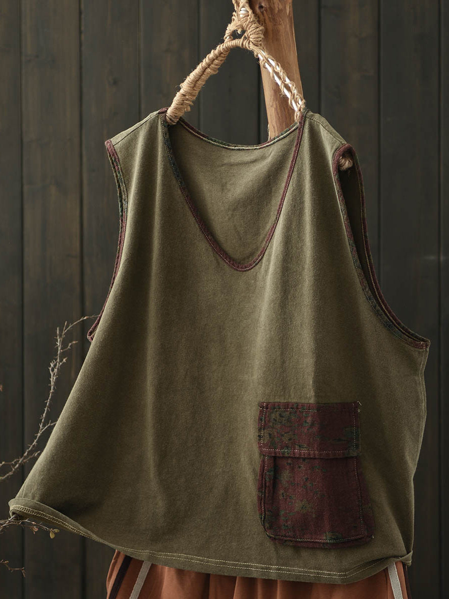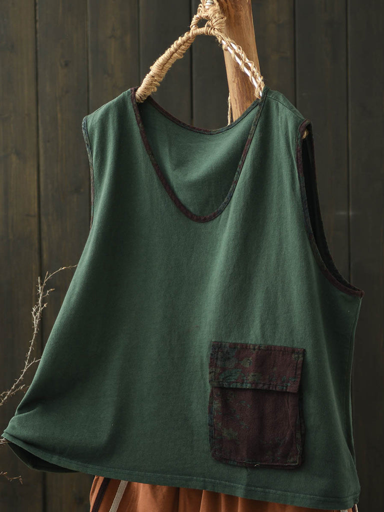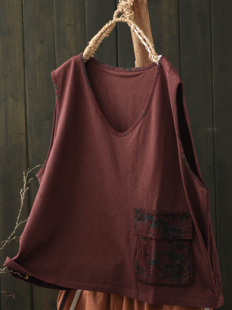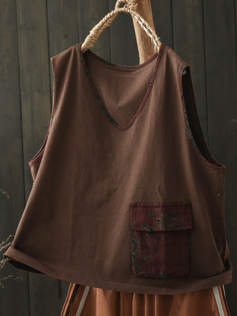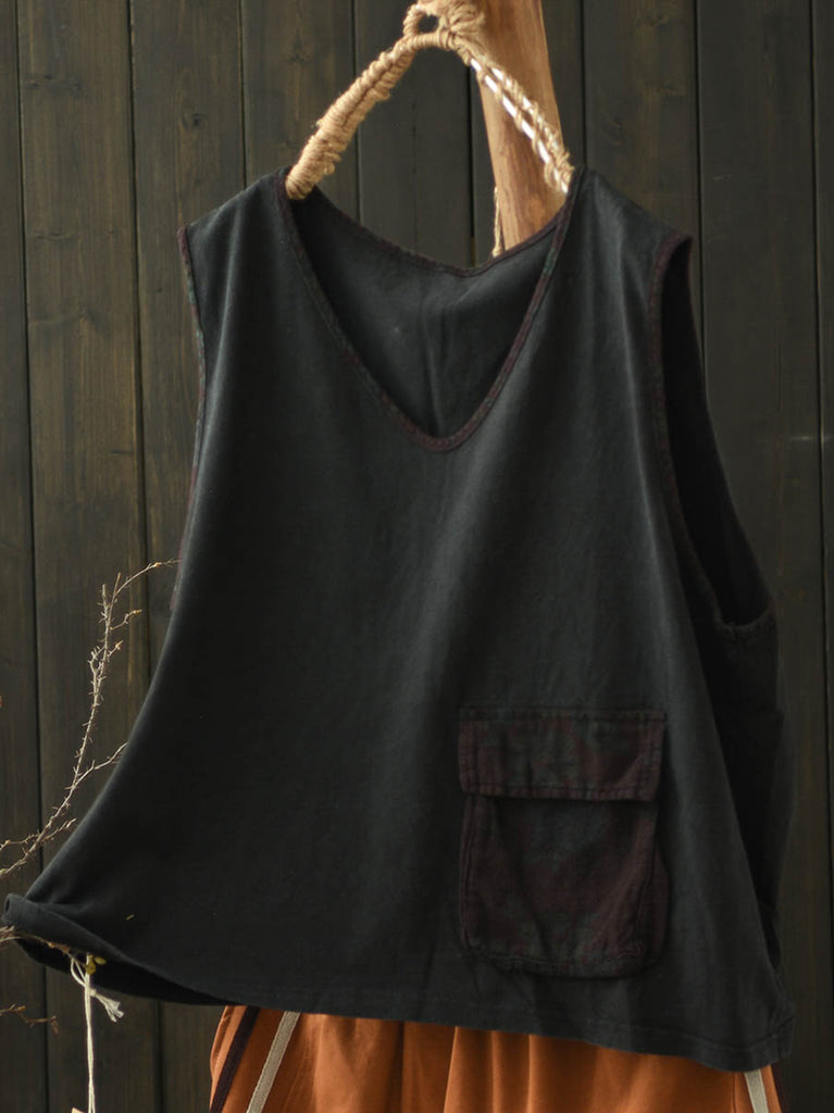 Plus Size Women Summer Vintage Colorblock V-Neck Cotton Vest