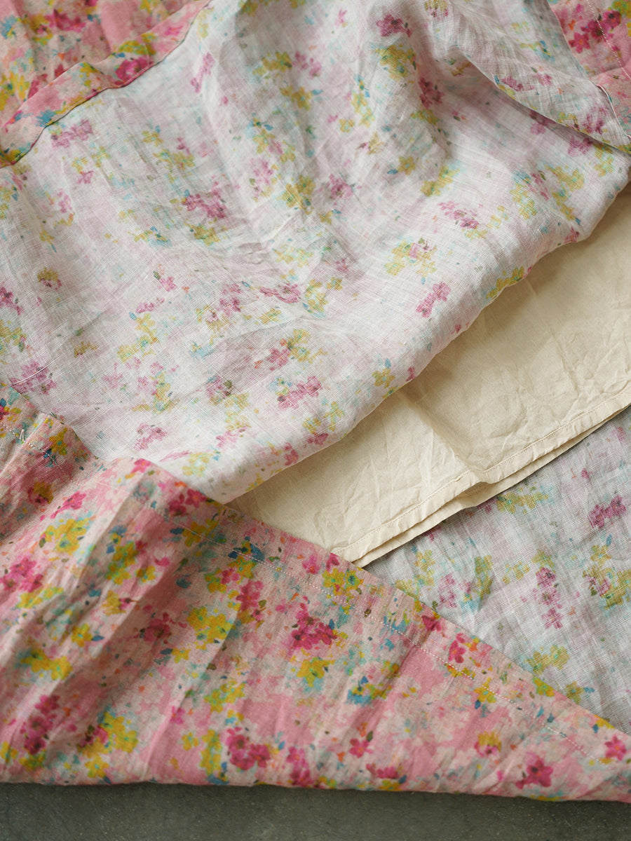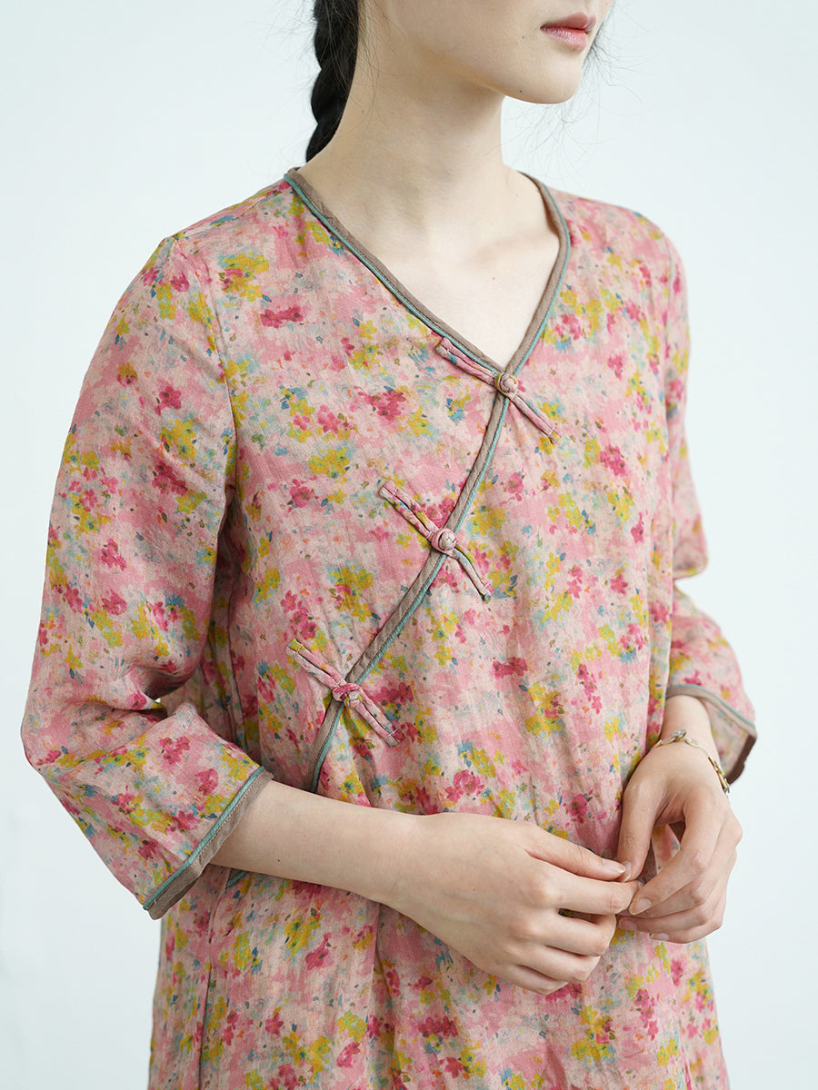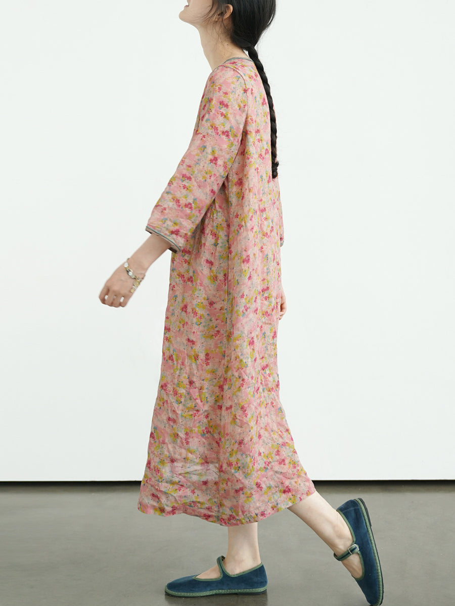 Women Summer Vintage Flower 100%Ramie V-Neck Dress