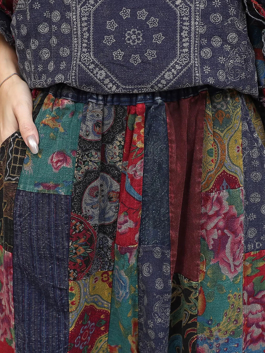 Women Summer Vintage Flower Patchwork V-Neck Suits