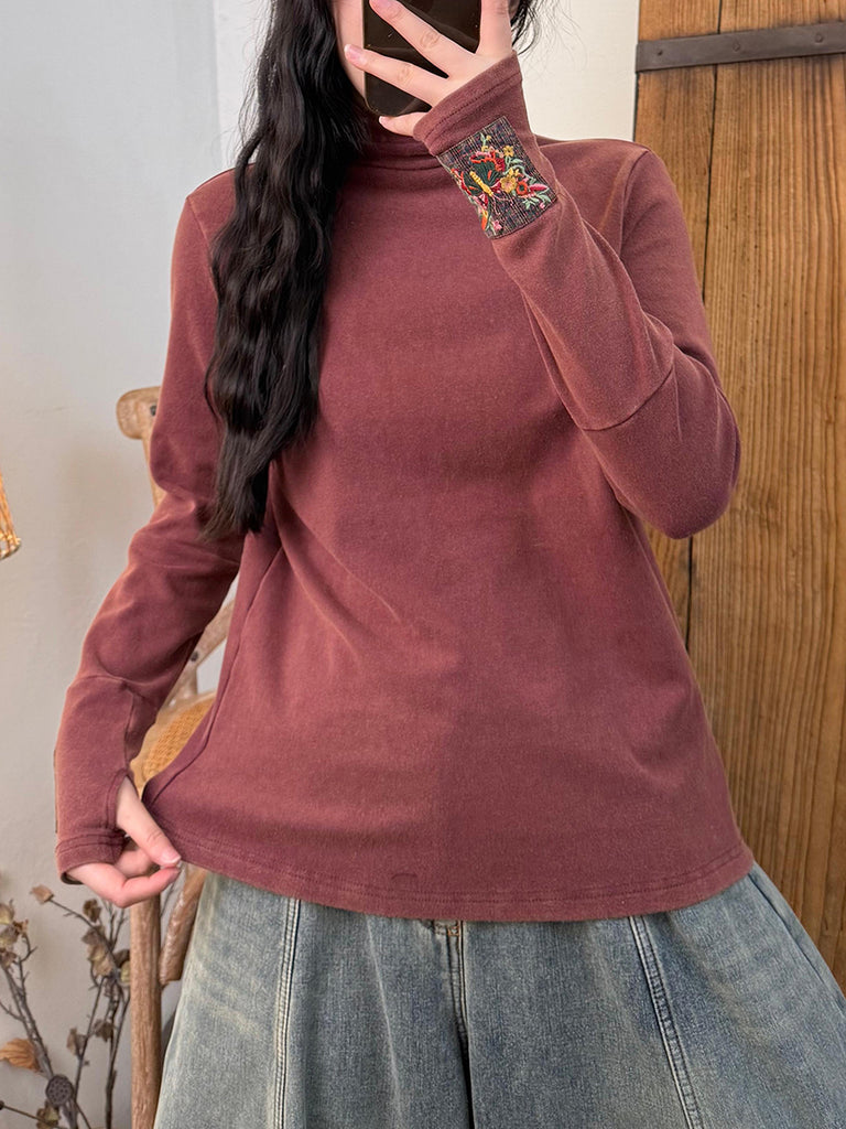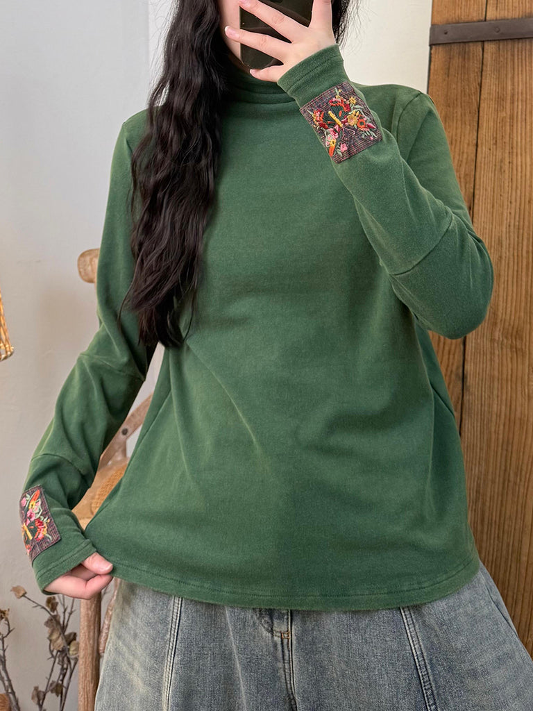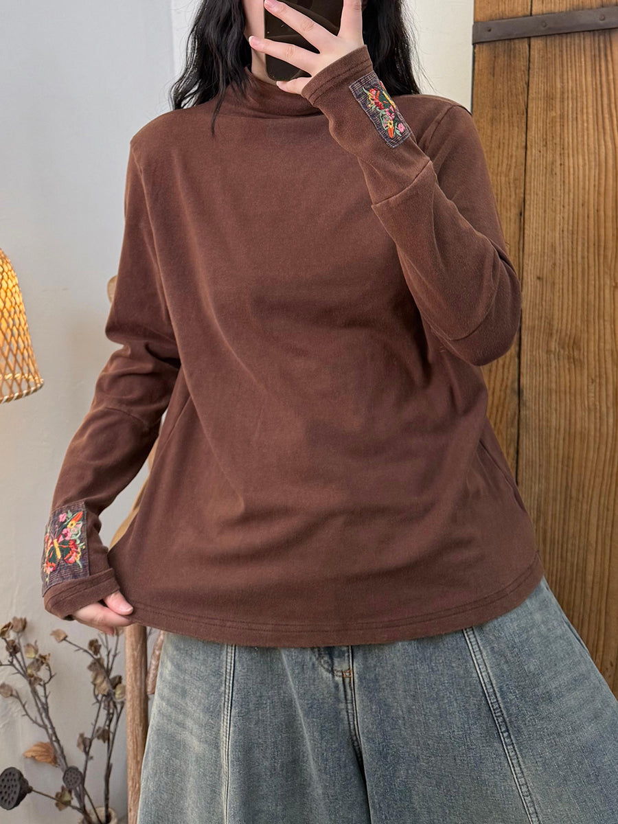 Women Vintage Autumn Embroidery Patch Turtleneck Cotton Blouse