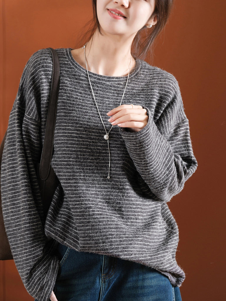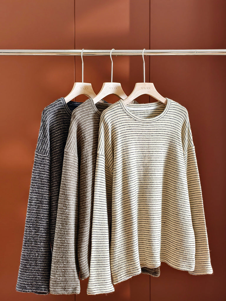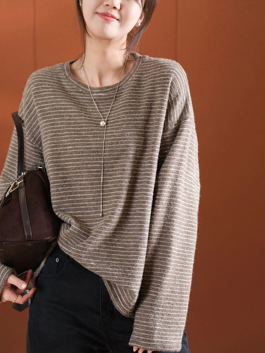 Women Vintage Autumn Stripe Fleece O-Neck Blouse