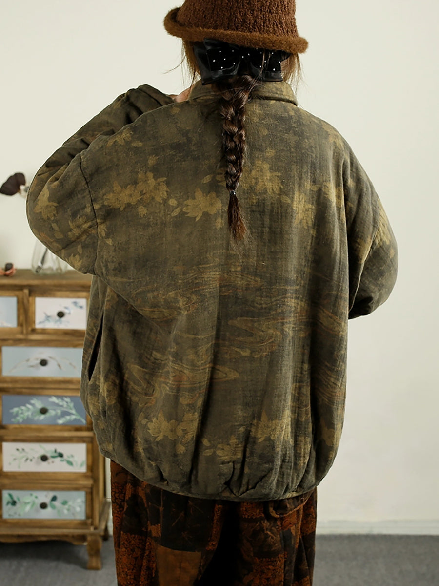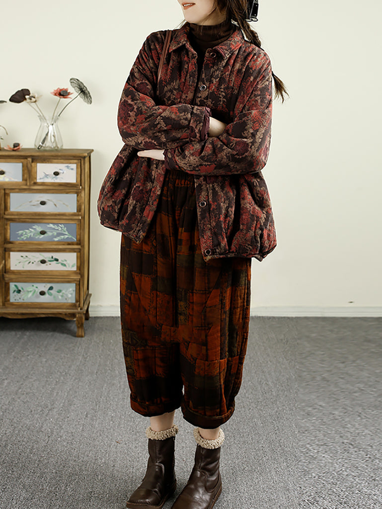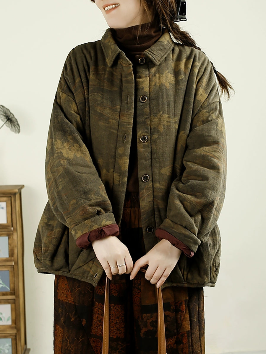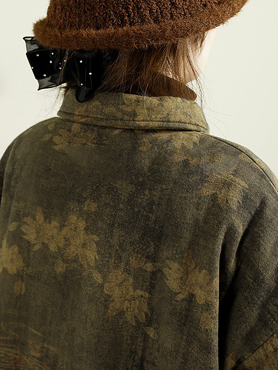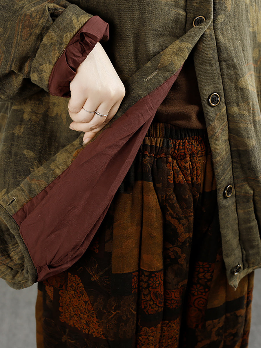 Women Vintage Flower Turn-down Collar 100%Cotton Padded Coat